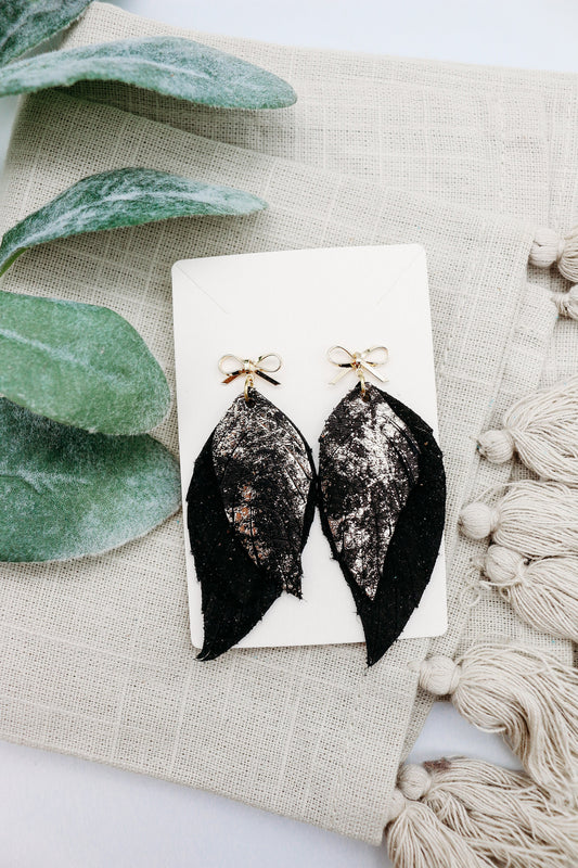 Golden Glamour: Metallic Leather Feather Earrings with Gold Bow Post