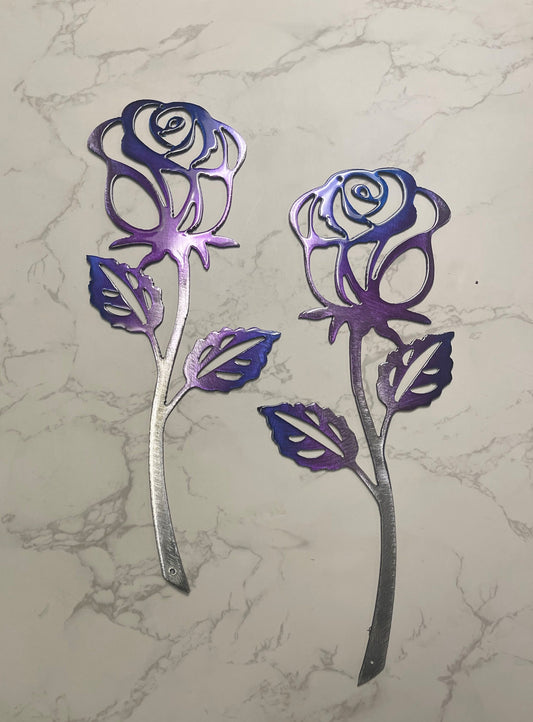 Rose Metal Wall Art Accent Purple & Silver Pair of Roses 12" x 5"