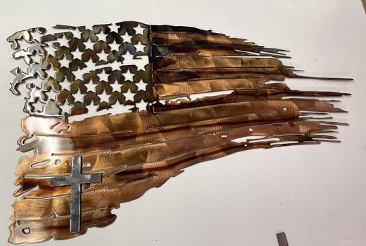 Tattered & Torn American Flag Metal Wall Art Copper/Bronze Pltd with Cross 36" wide
