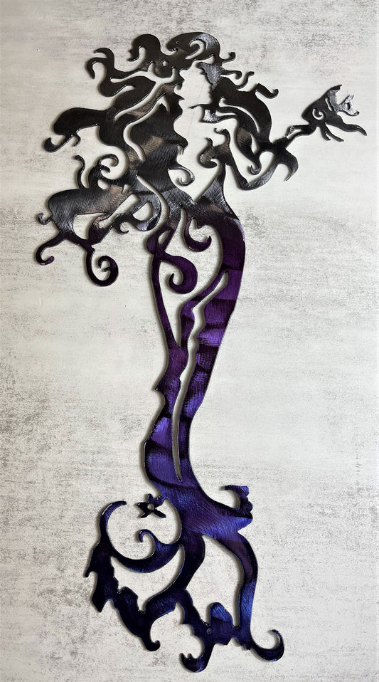 Tall Mermaid with a Fish - Metal Wall Art Purple Tinged