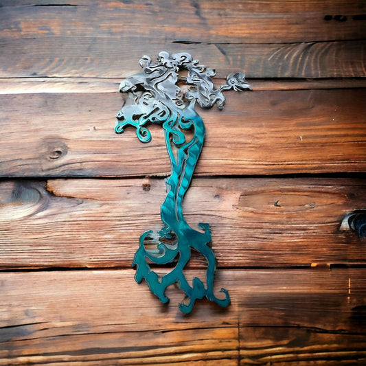 Tall Mermaid with a Fish - Metal Wall Art Teal Tainted