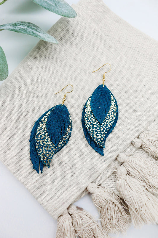 Teal and Gold Cameleon Layered Feathered Earrings - Boho Chic Dangles