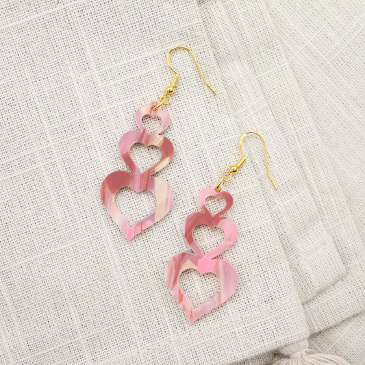 Valentine Hearts/Trio Hearts/Stacked in Love Drop Earrings Pink Marble