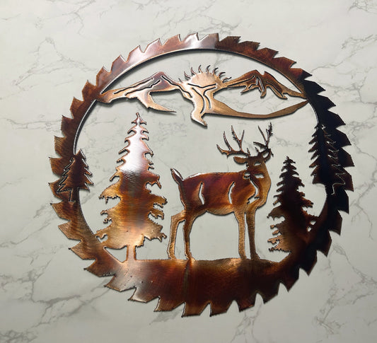 Copper Plated Metal Art Scene - Trees and Snow Capped Mountains