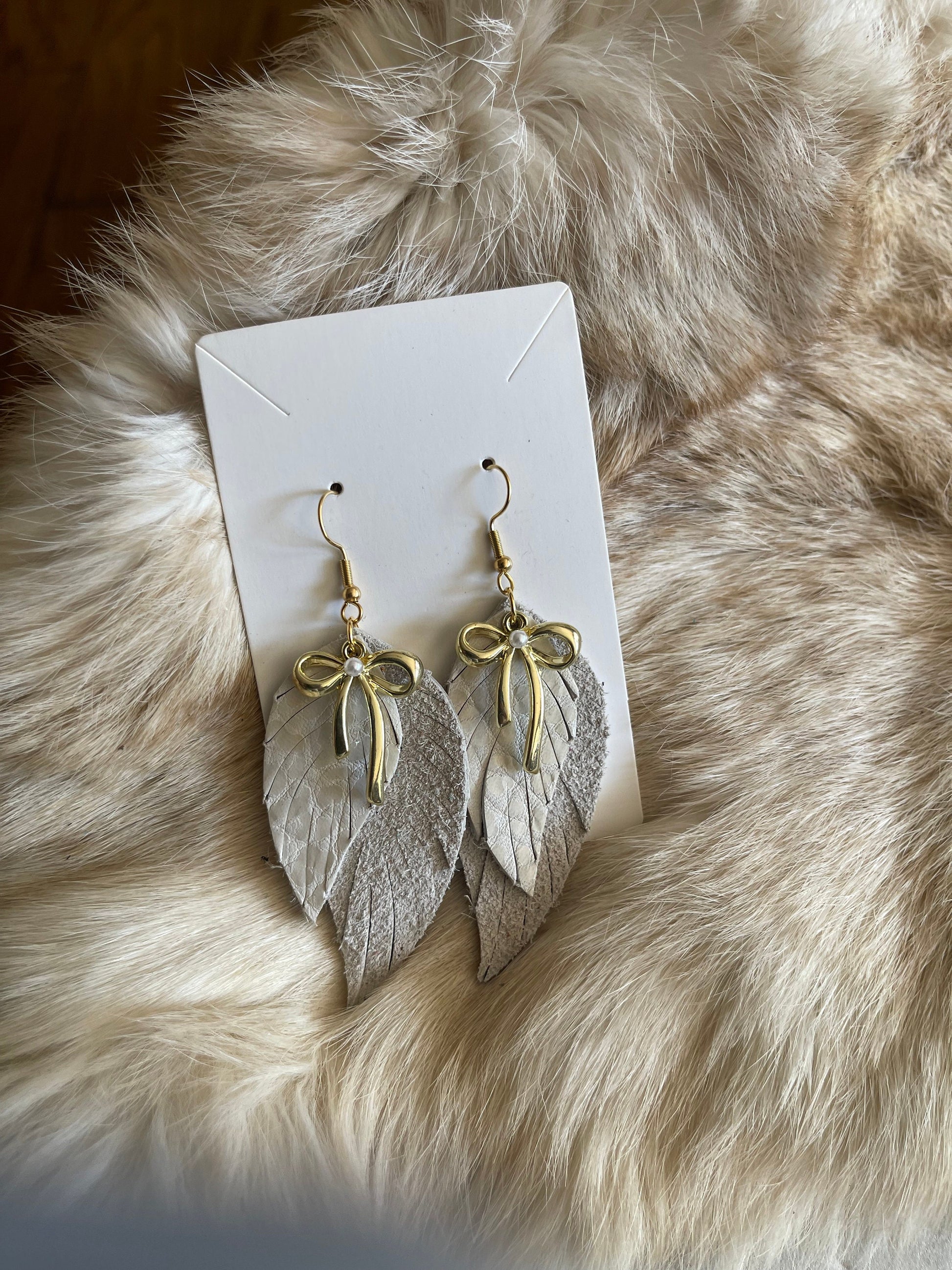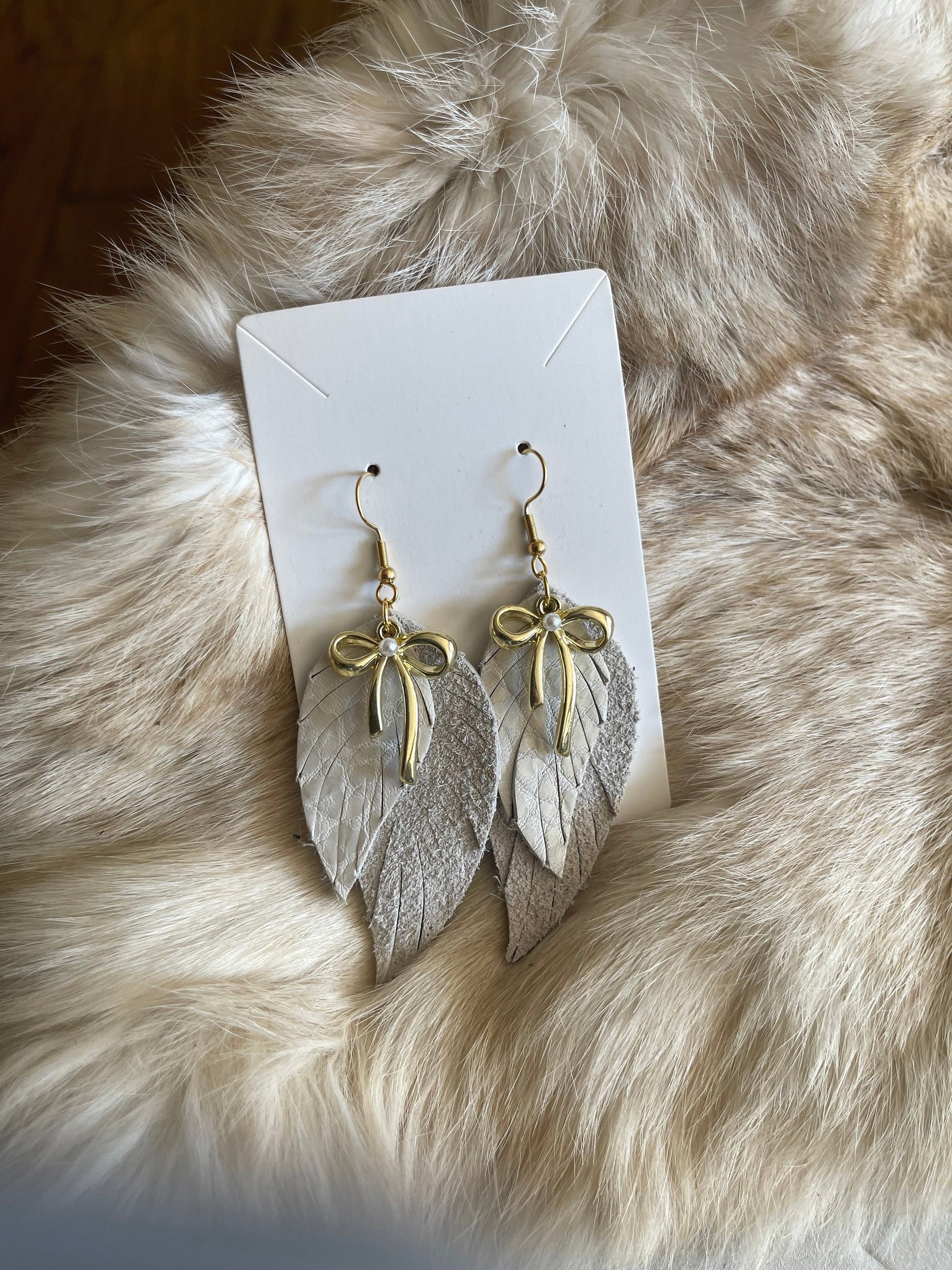 Embrace an Angelic Vibe: Elevate your style with the alluring charm of our Angelic Fringed Bow Leather Earrings. This exquisite fusion of boho glam and contemporary finesse is beautifully embodied in our White and Gold Fringed Earrings. Carefully handcrafted, these earrings feature flowing white leather fringes that dance gracefully with every step, complemented by a striking golden bow accent for a touch of modern sophistication.