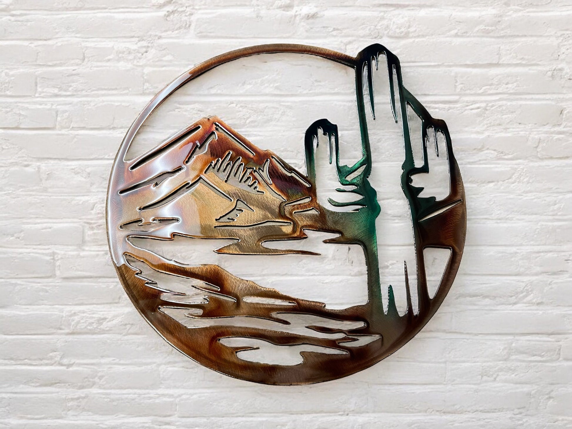 Introducing our captivating Arizona Cactus Circle Metal Wall Art (green and copper version), a perfect way to infuse your home with the vibrant spirit of the Southwest. Measuring 14 inches tall and 13 3/4 inches wide, this handcrafted piece is designed to bring a touch of rustic charm to any space.