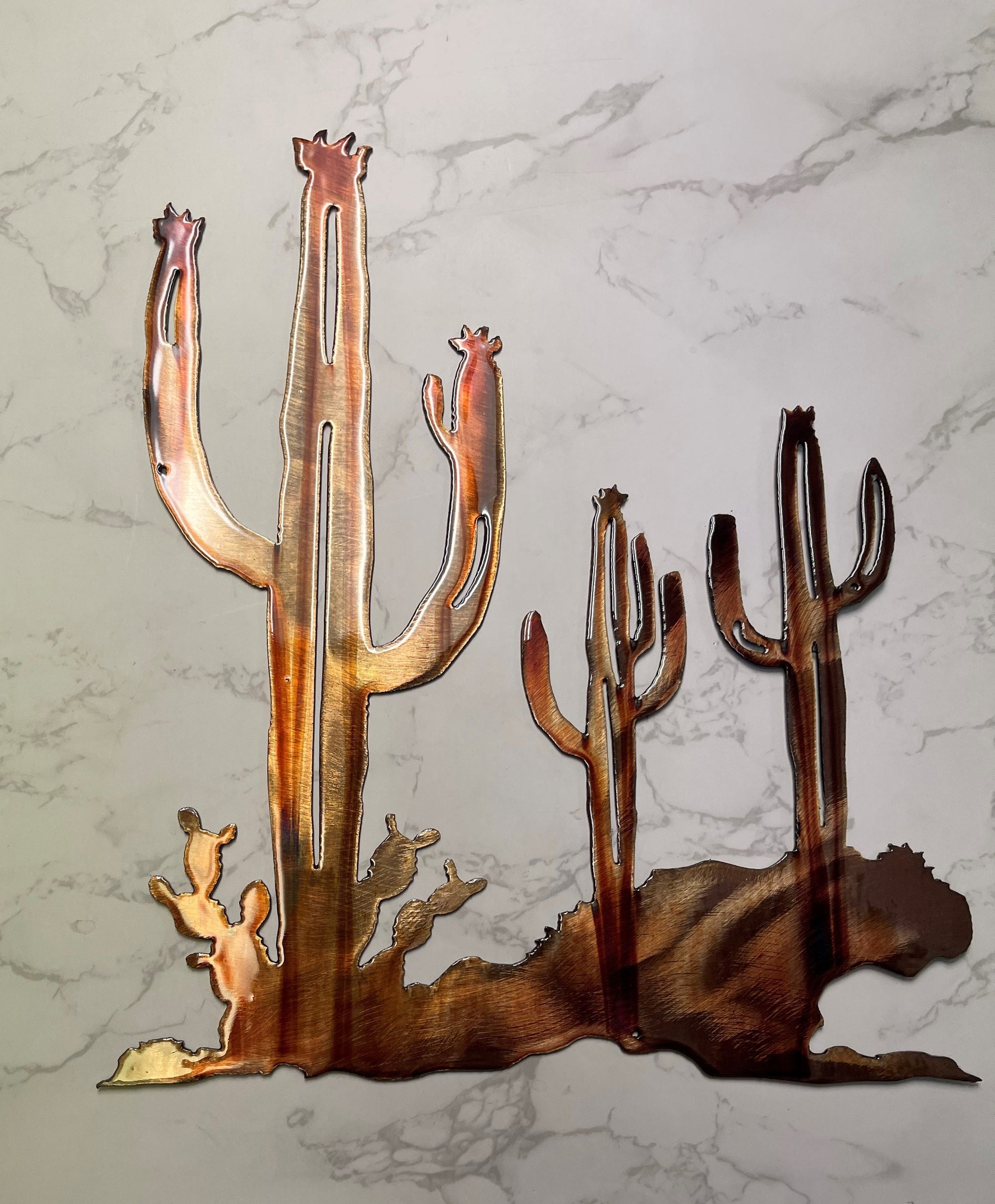 Each metal sculpture is expertly handcrafted by skilled artisans who have perfected the art of metalwork. The intricate design features a cluster of majestic cacti, their spiny arms reaching towards the sky, amidst a backdrop of rolling sand dunes and a breathtaking sunset. The combination of copper and bronzed plating creates a rich and warm color palette, adding depth and dimension to the artwork.