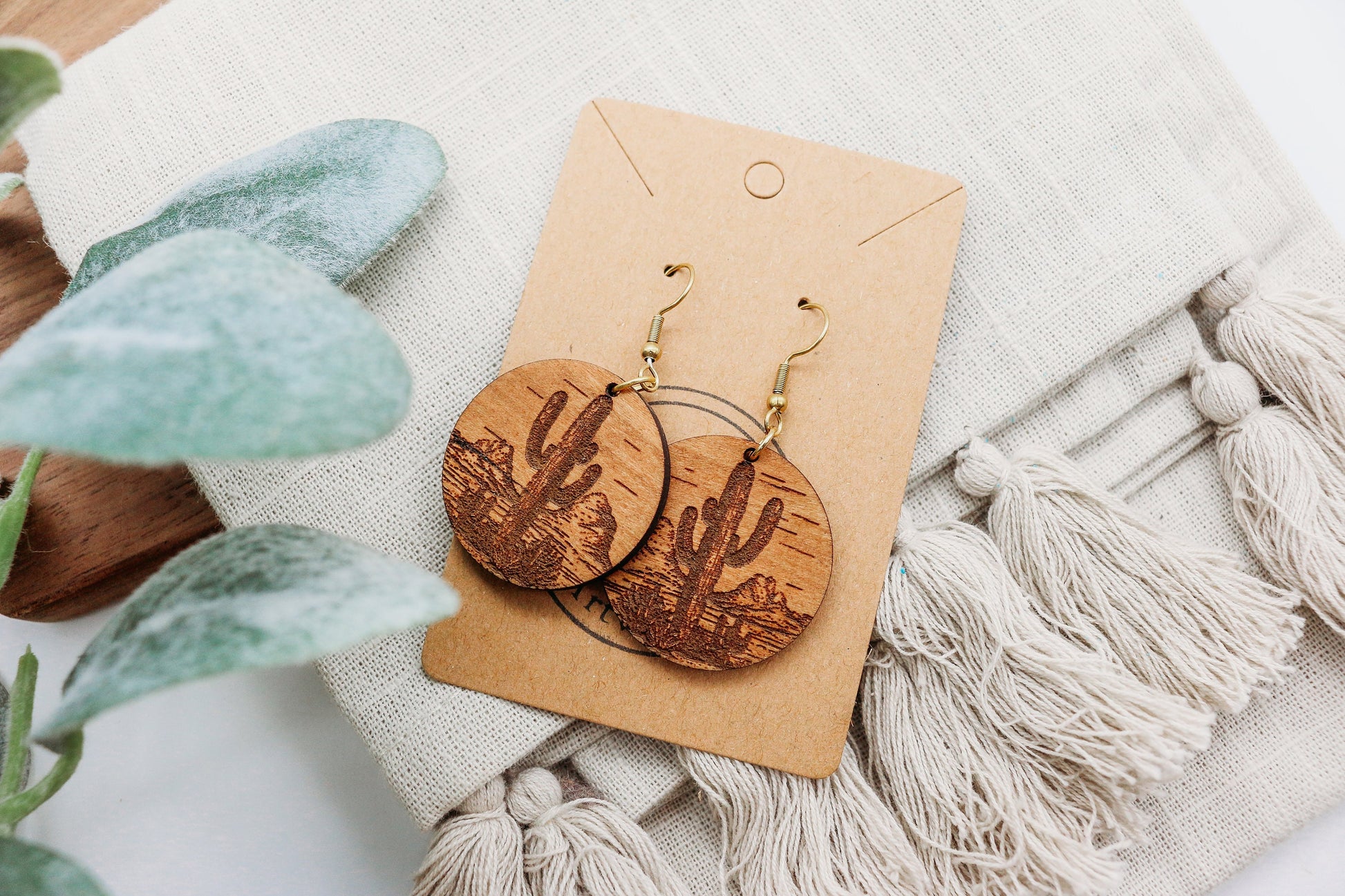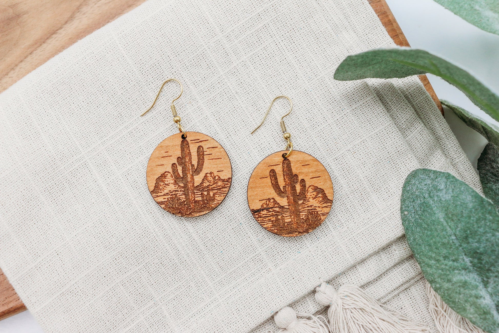 Immerse yourself in the enchanting beauty of the desert with our Wooden Disc Saguaro Cactus Scene Earrings. Carefully handcrafted, these earrings depict a mesmerizing landscape of saguaro cacti, capturing the essence of the Southwest's rugged charm. Each wooden disc is intricately engraved to showcase the intricate details of the desert scene, creating a unique and captivating accessory that is sure to turn heads.