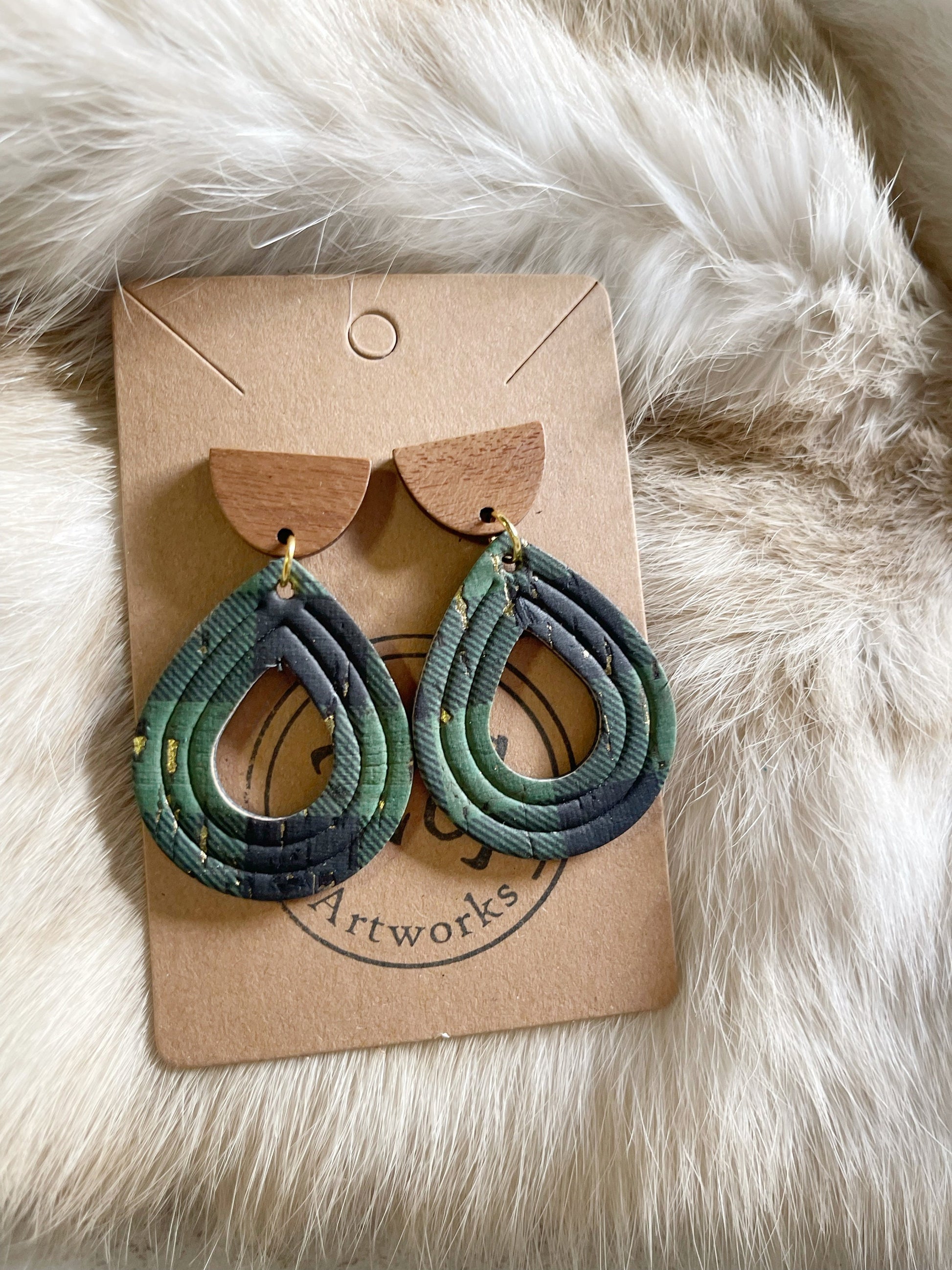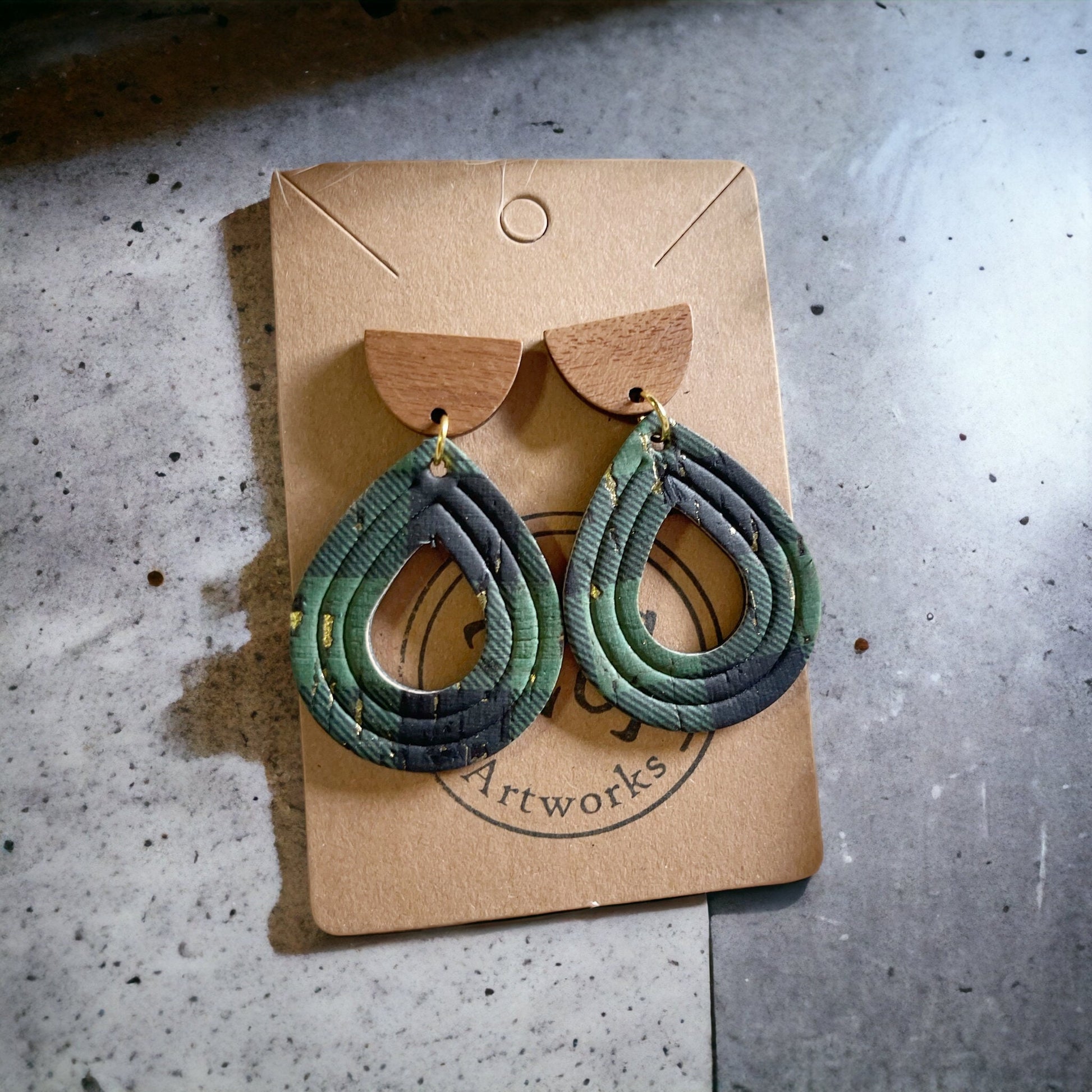 Embrace a touch of natural elegance with our Buffalo Plaid Wooden and Leather-Backed Cork Dangle Earrings. These captivating earrings feature tear-drop-shaped cork, adorned in a striking green buffalo plaid print, paired with a sophisticated wooden topper. The unique addition of leather backing adds a luxurious touch and ensures comfort for all-day wear.