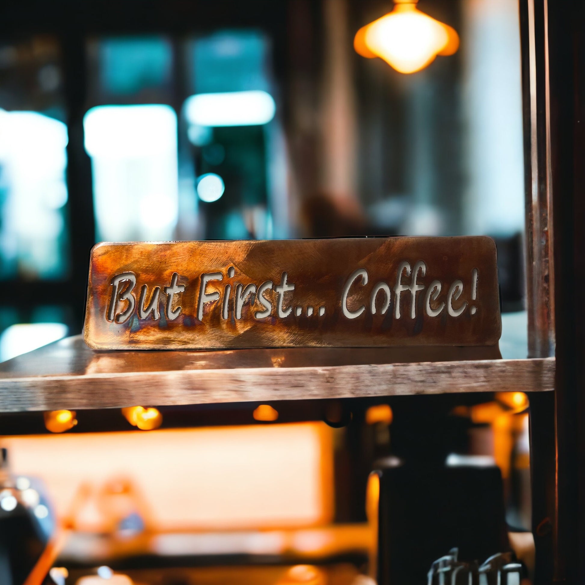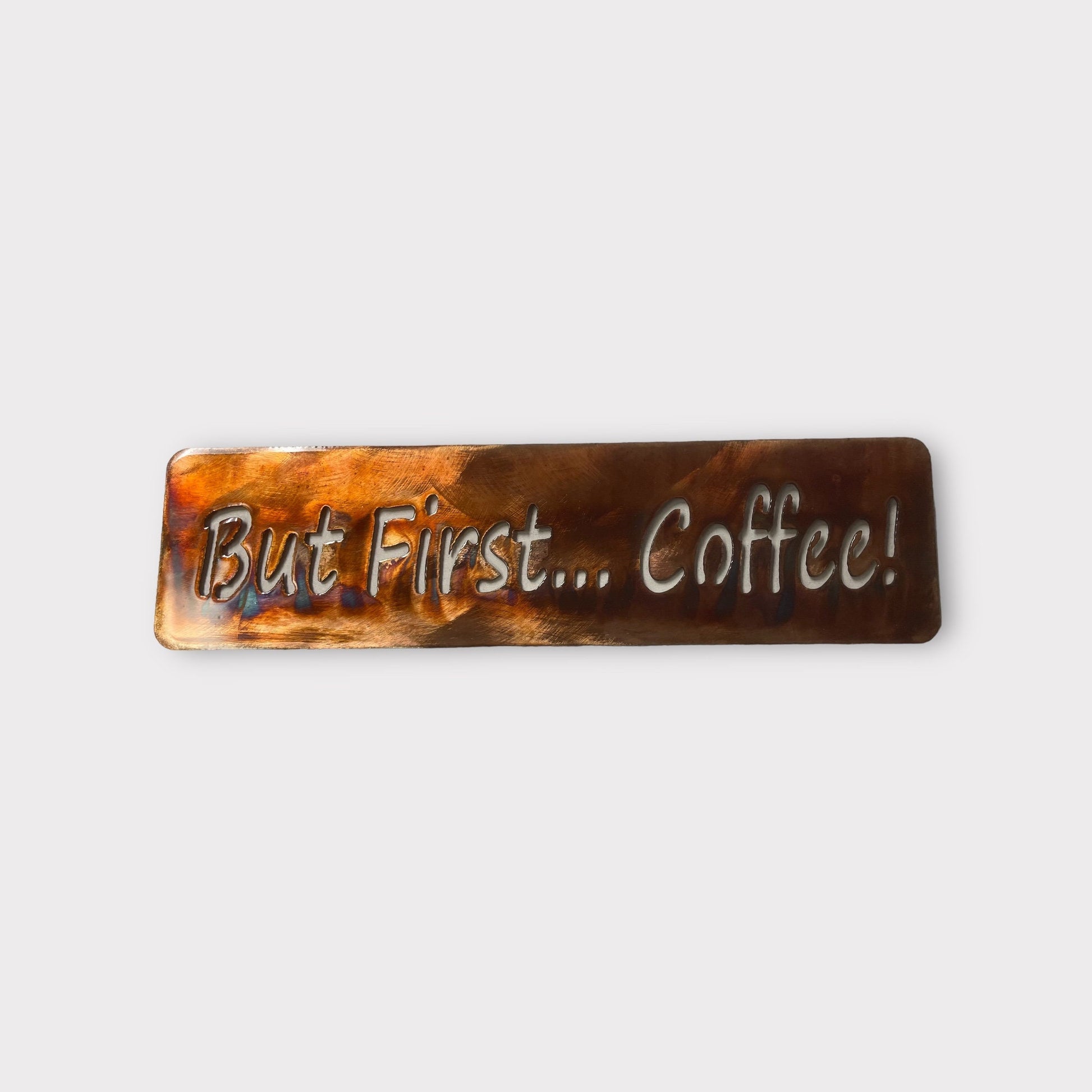 "Start your day right with our 'But First...Coffee!' metal wall art plaque, meticulously crafted in the USA. Made from mid-gauge sheet metal, each piece is a unique work of art, with its Copper/Bronze plated finish and a protective clear coat ensuring lasting beauty. Measuring approximately 15" across and 4" tall, it features small saw-tooth hangers welded on the back for easy hanging. Elevate your coffee nook with this charming and functional piece.