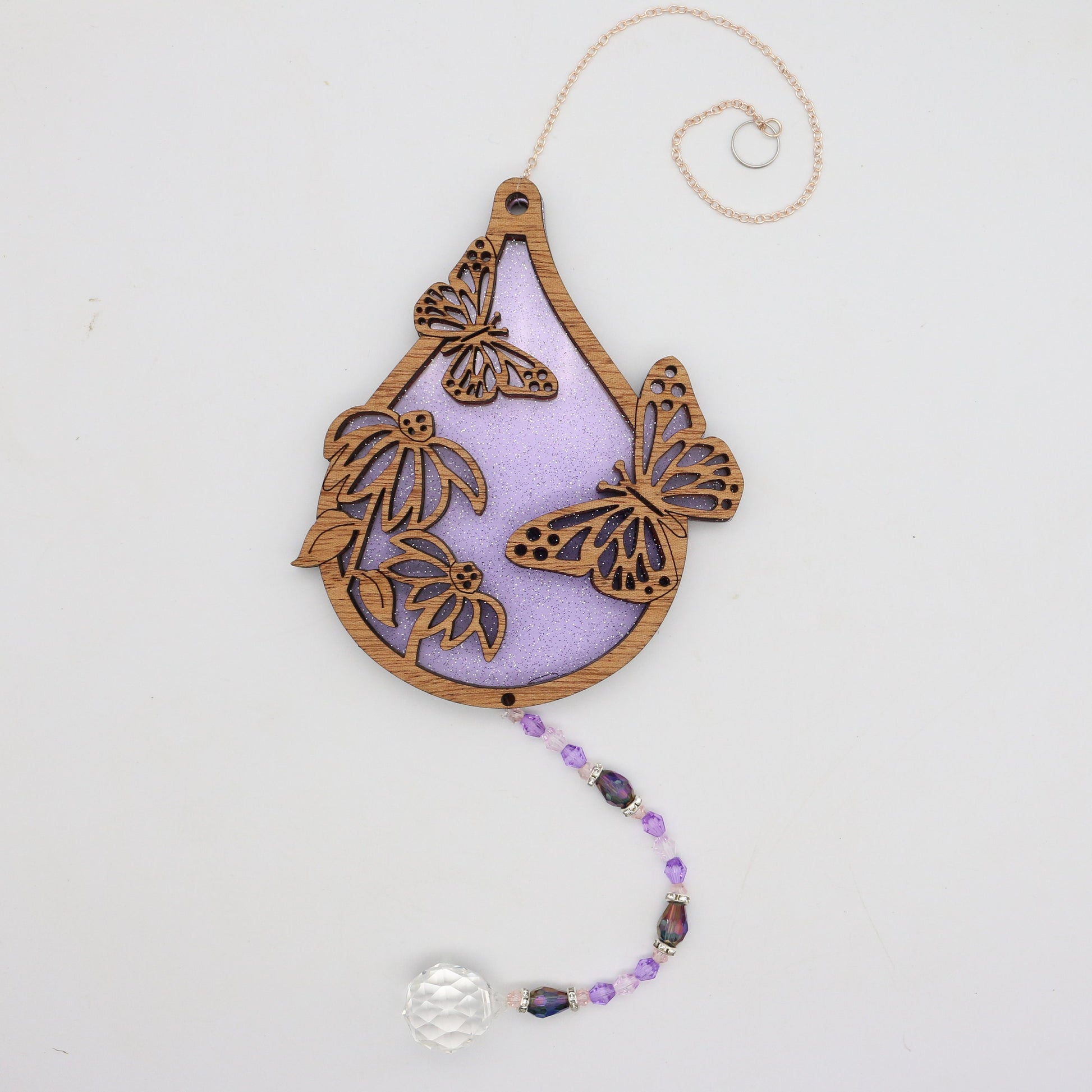 The hummingbird and floral motif is enhanced by the addition of acrylic layers, capturing the vivid colors of these enchanting creatures and the blossoming flowers. The acrylic layers create a lovely contrast against the wood, adding depth and dimension to the suncatcher.