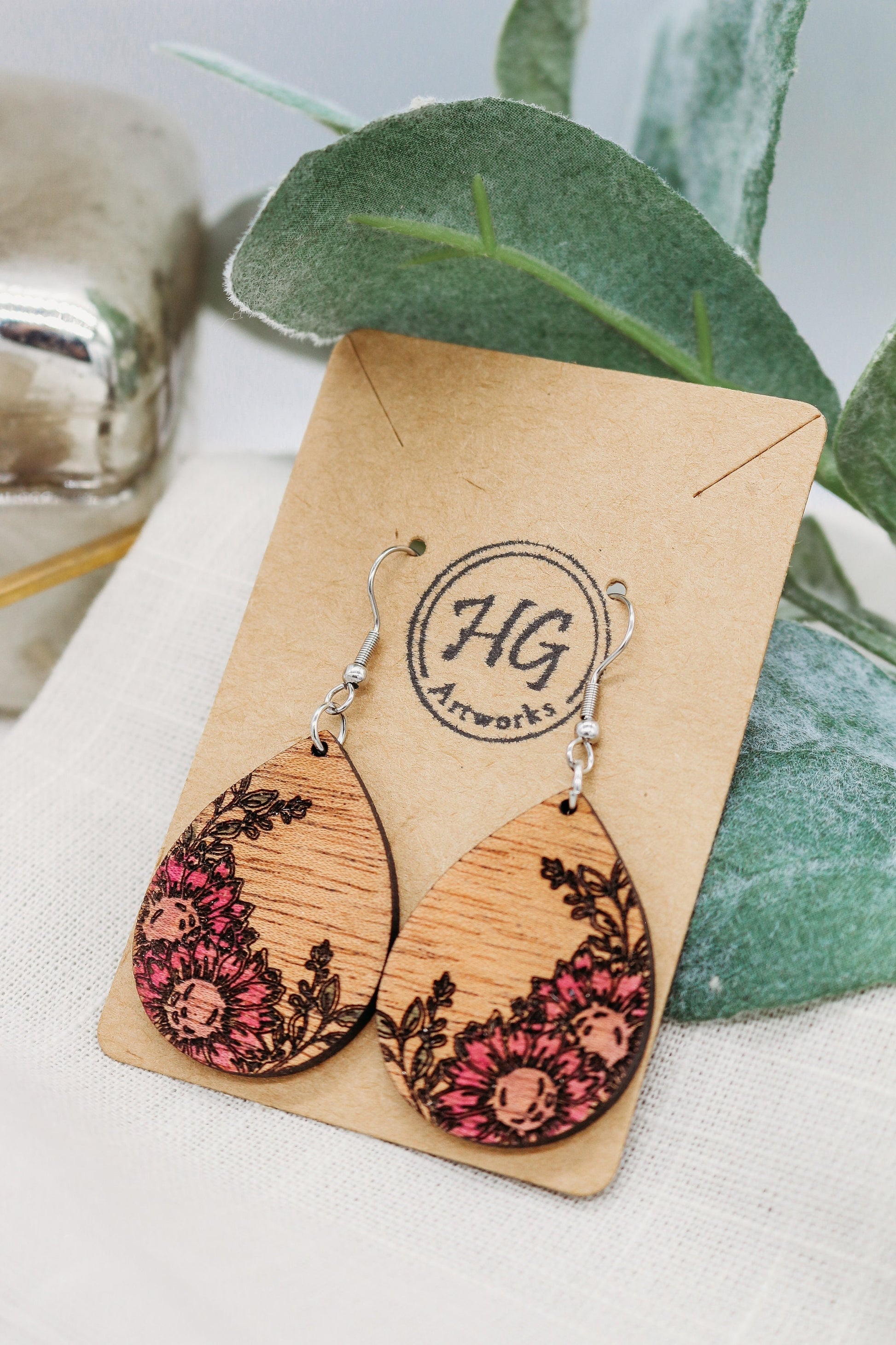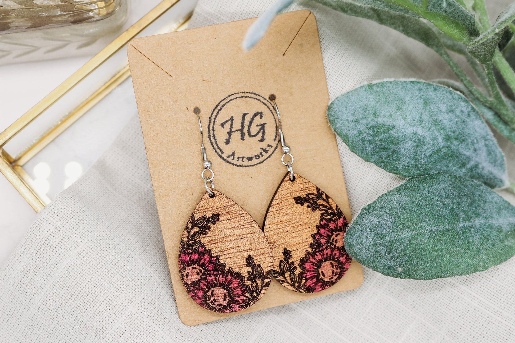 Christmas FLoral Earrings laser cut on wood and hand painted