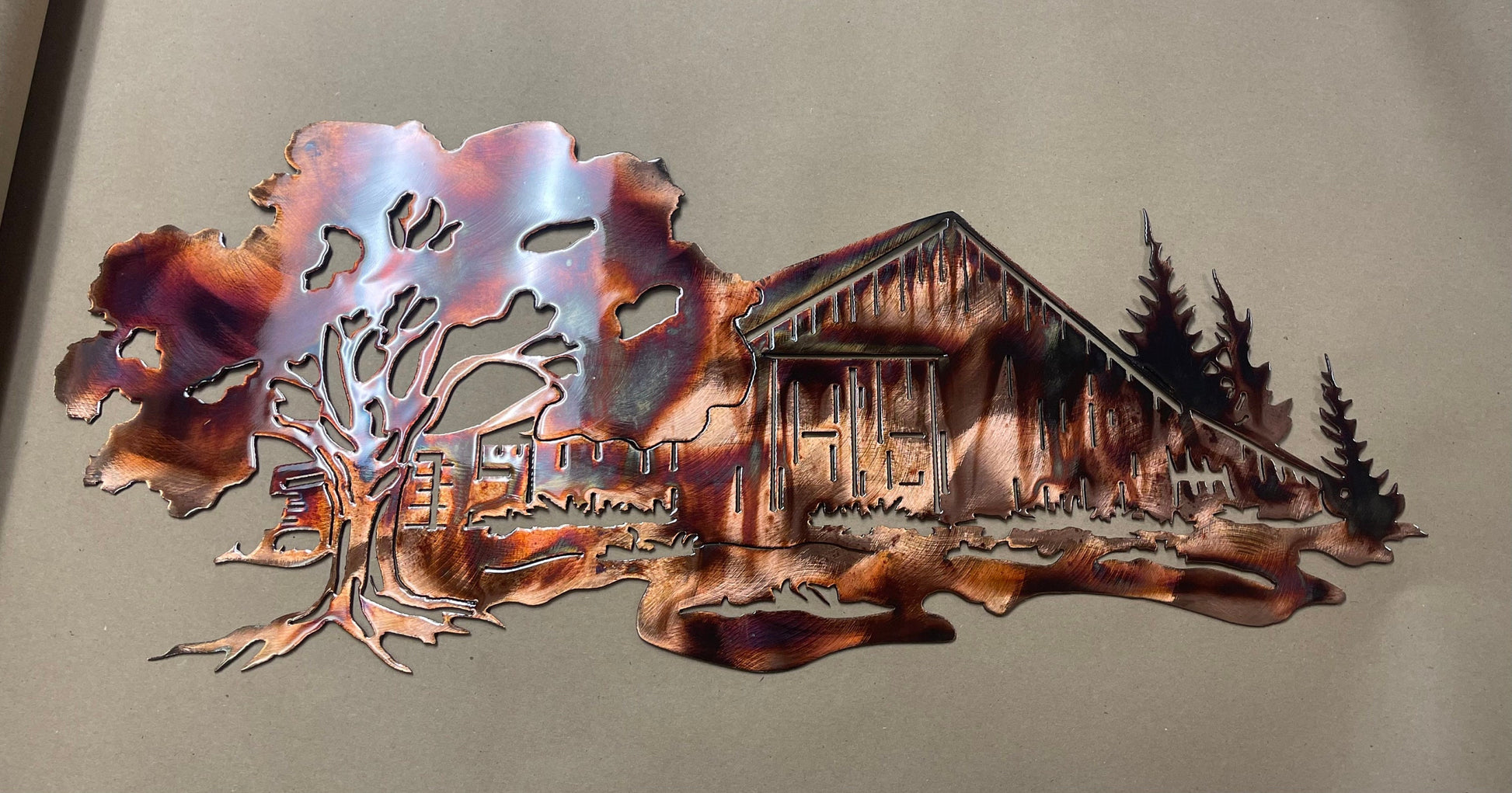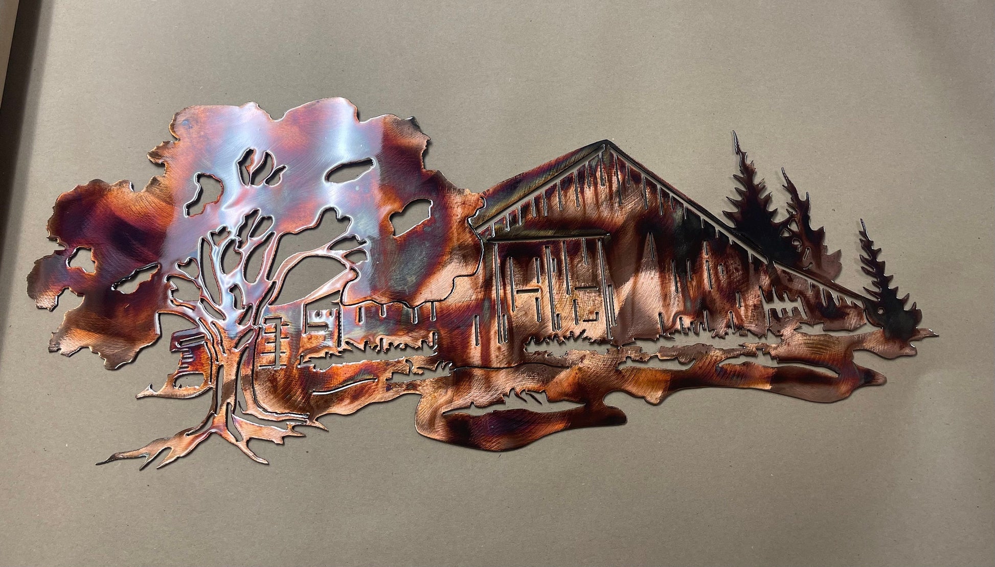Copper-Plated Barn Scene: Handcrafted Metal Artistry for Rustic Elegance