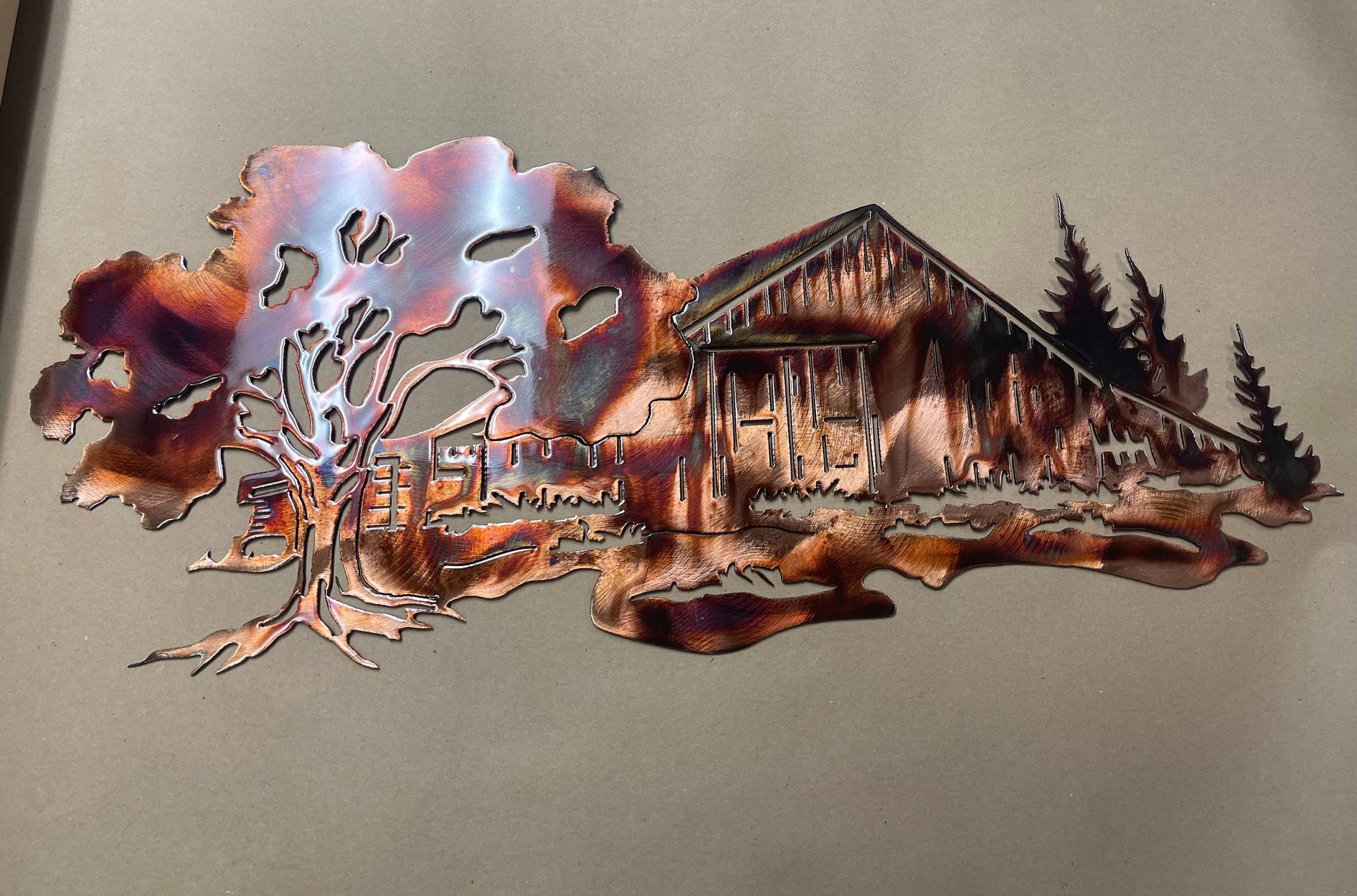 Step into the rustic elegance of nature with our meticulously handcrafted metal art scene, featuring a stunning depiction of a barn nestled beneath the shade of a magnificent, copper-plated tree. This exquisite piece invites you to immerse yourself in the serenity and charm of the countryside.