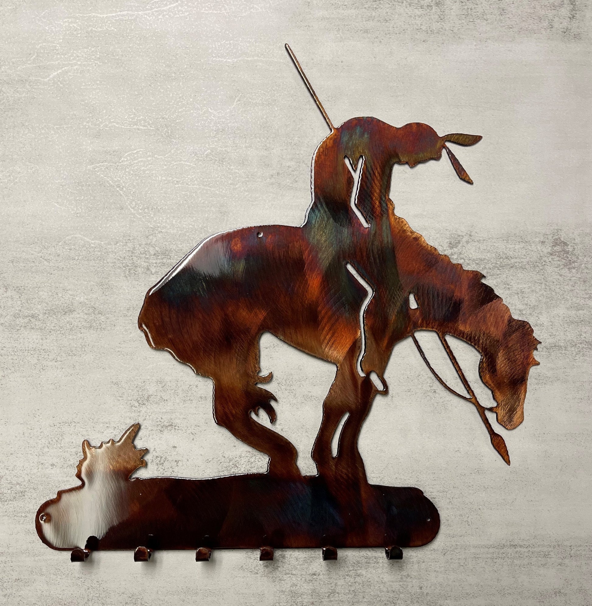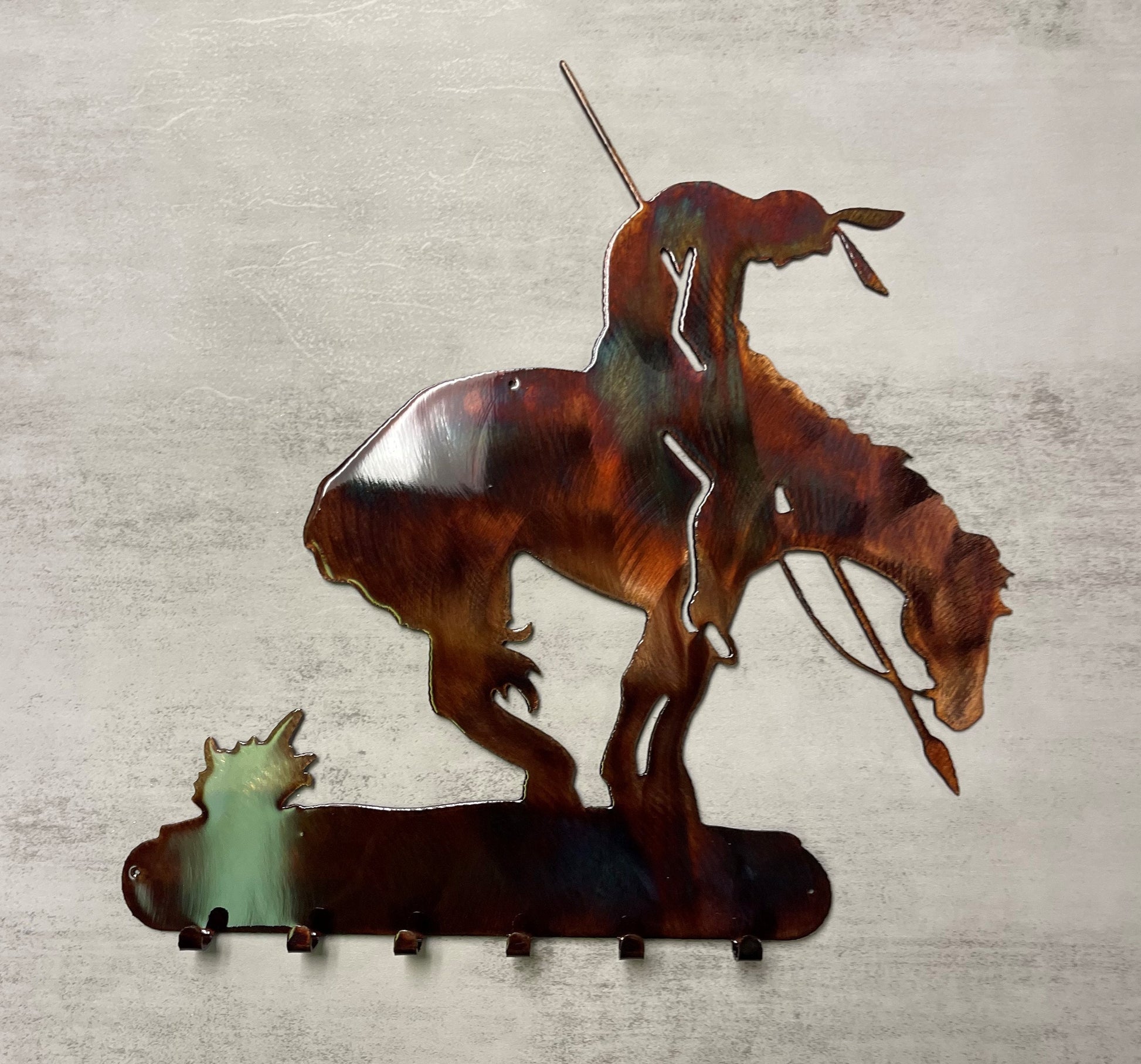 Add a touch of rustic elegance to your home with our "Copper Trails: End of Trail Key Rack." Crafted with passion and precision, this piece seamlessly blends steel, copper, and bronzed plating to create a functional work of art that helps you keep your keys organized in style.