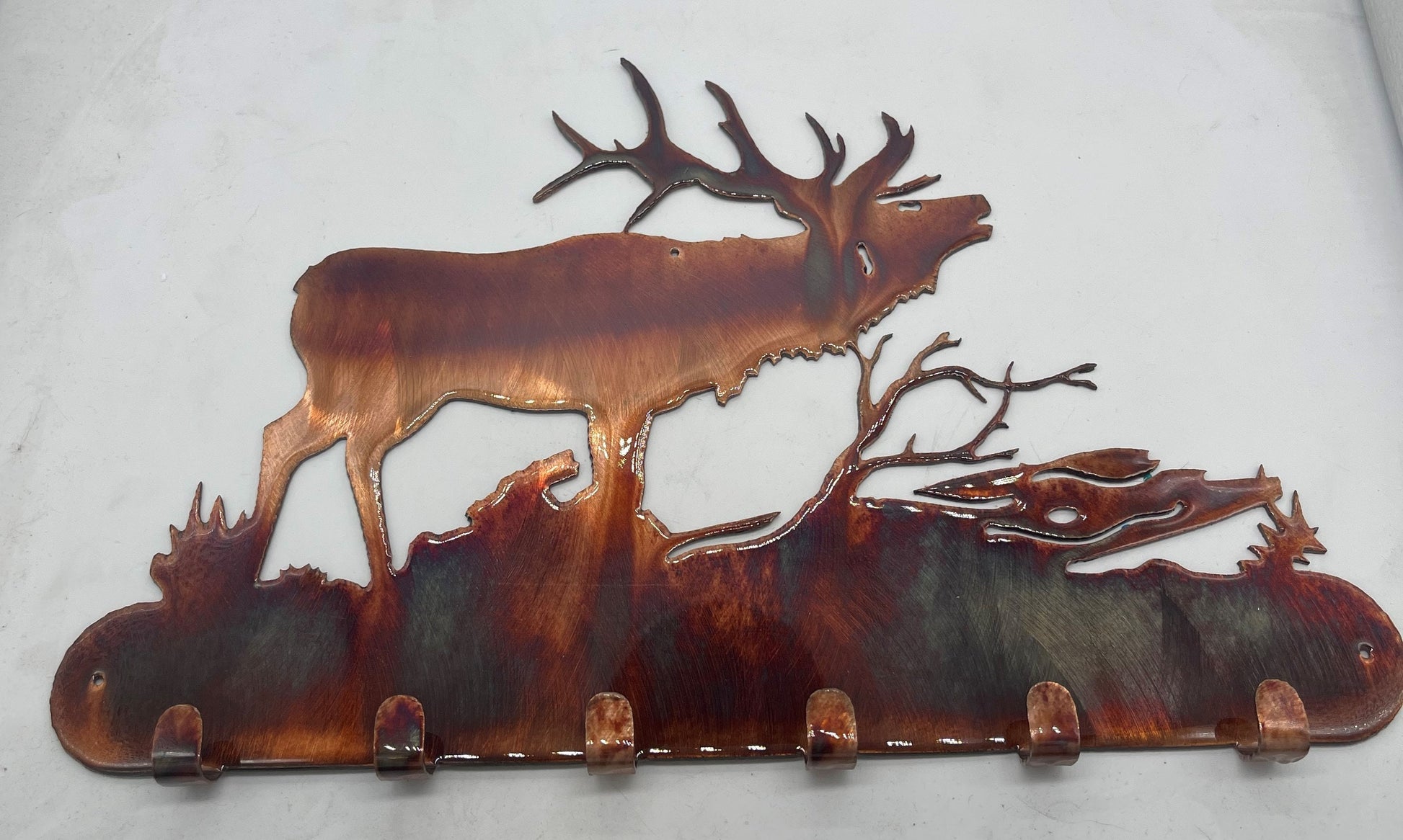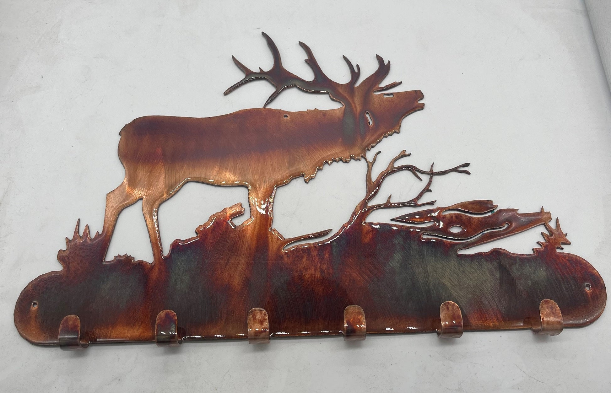 Add a touch of wilderness-inspired elegance to your home with our "Copper Trails: Elk Key Rack." Crafted with passion and precision, this piece seamlessly blends steel, copper, and bronzed plating to create a functional work of art that helps you keep your keys organized in style.