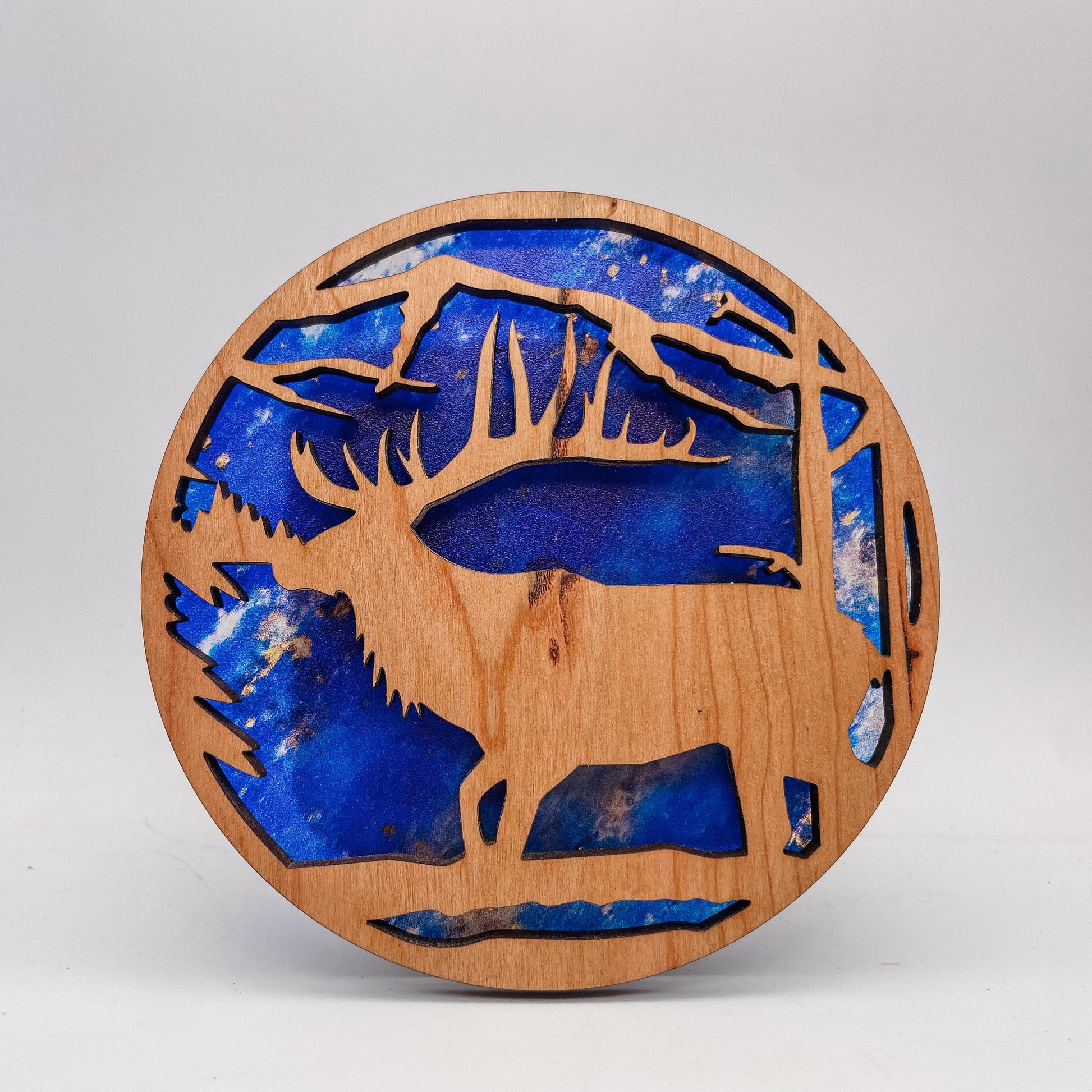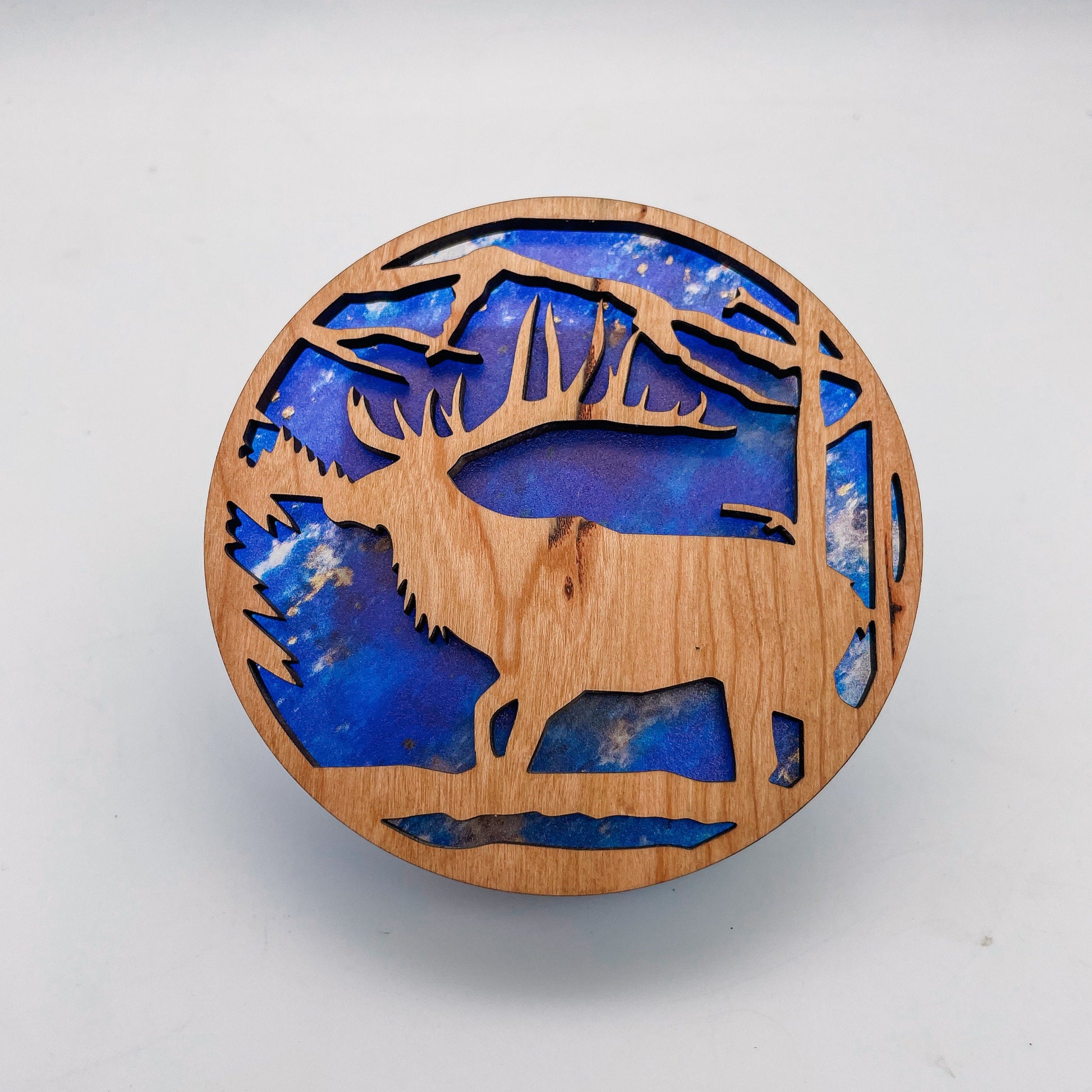 Introducing our stunning elk scene wood and acrylic nightlight, a captivating piece of functional art that combines the beauty of nature with the elegance of craftsmanship. This nightlight will not only illuminate your space but also add a touch of wilderness and serenity to your home decor.
