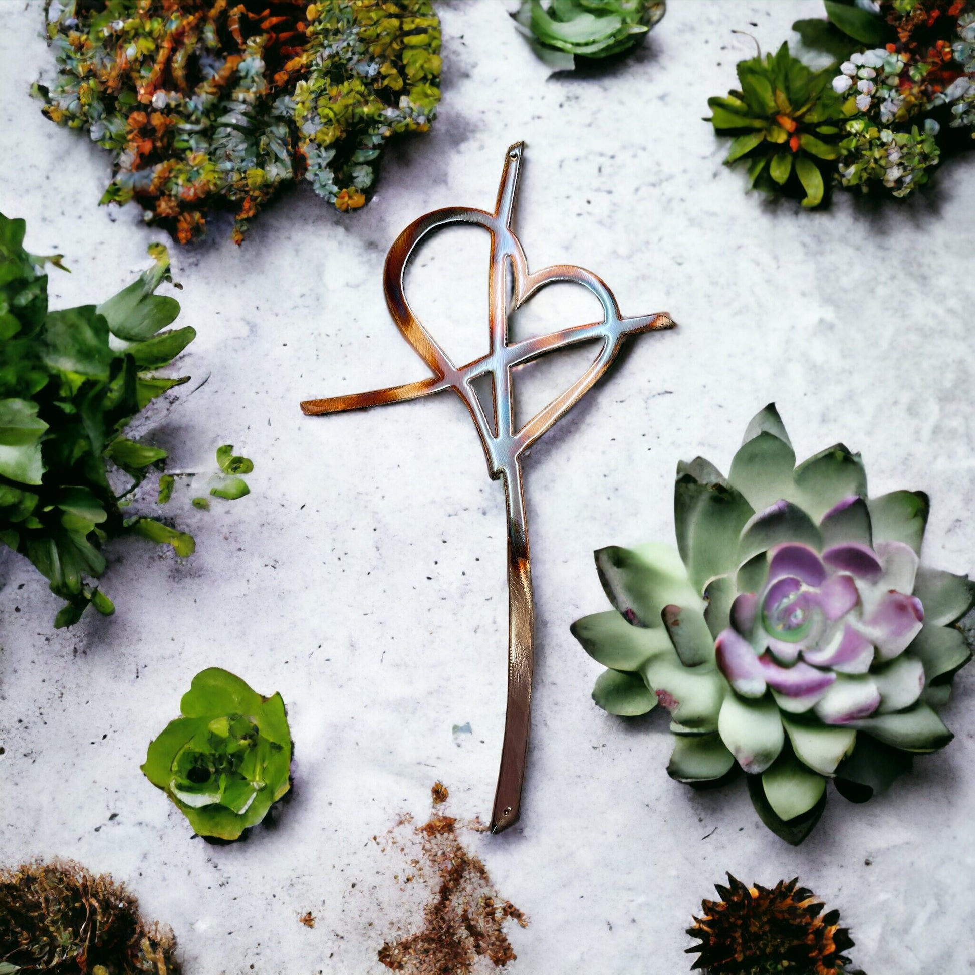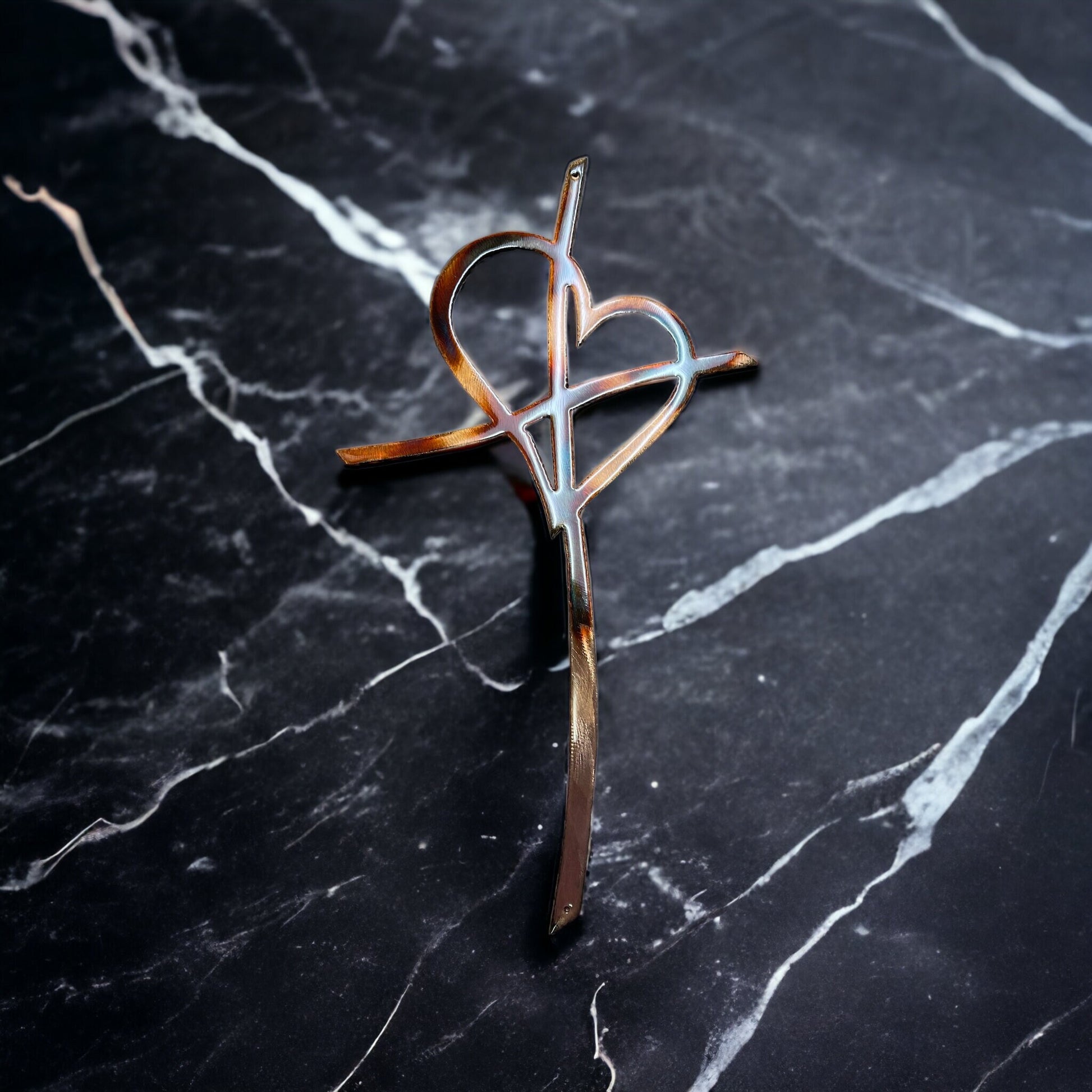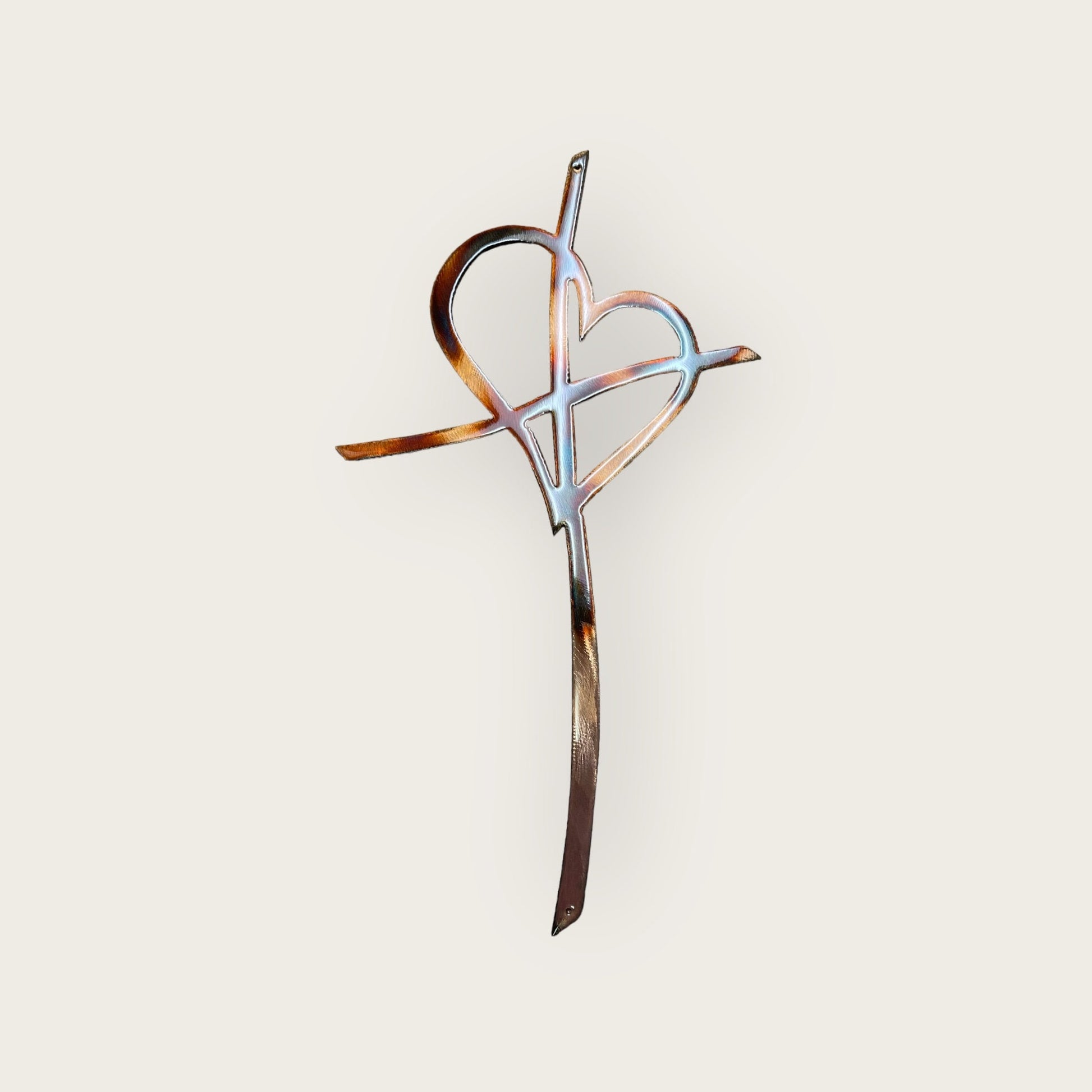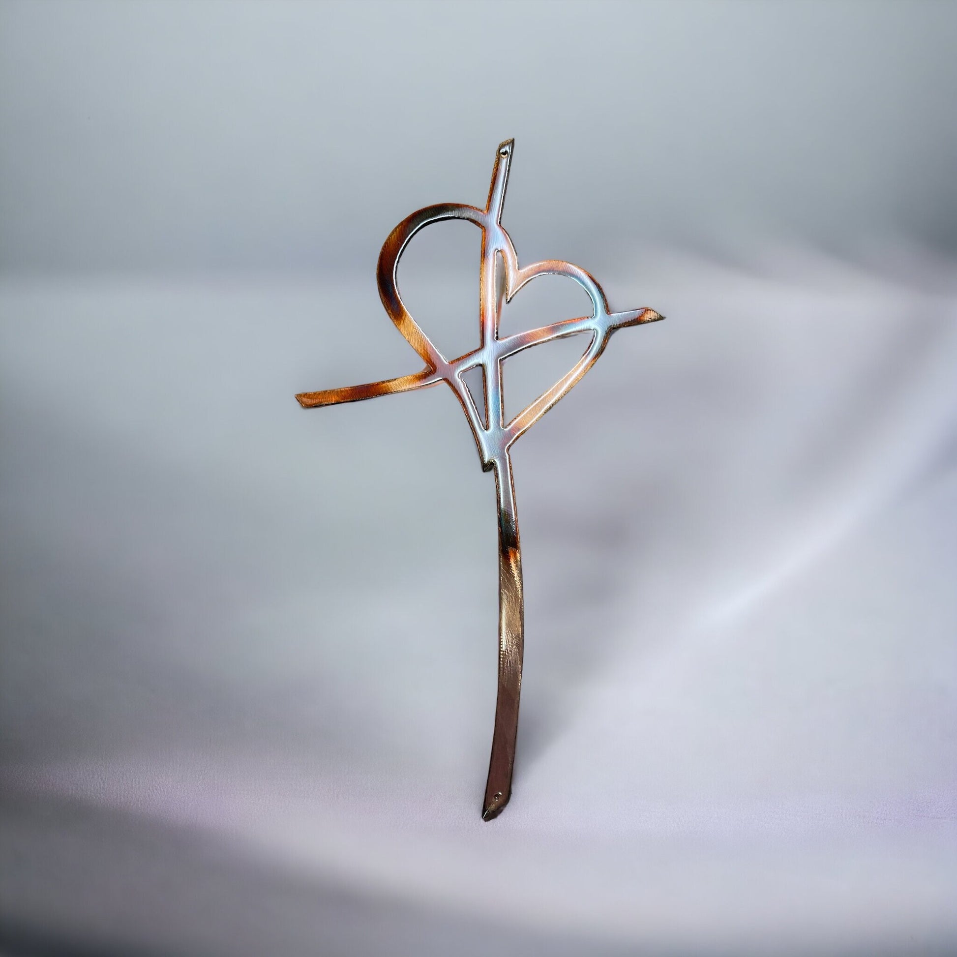 Celebrate the enduring bond of love and commitment with our "Eternal Commitment" Cross. This exquisite piece, measuring 15" tall and 8" wide, is a masterpiece that blends the strength of steel and the elegance of copper, all with a captivating bronzed plating and high gloss finish.