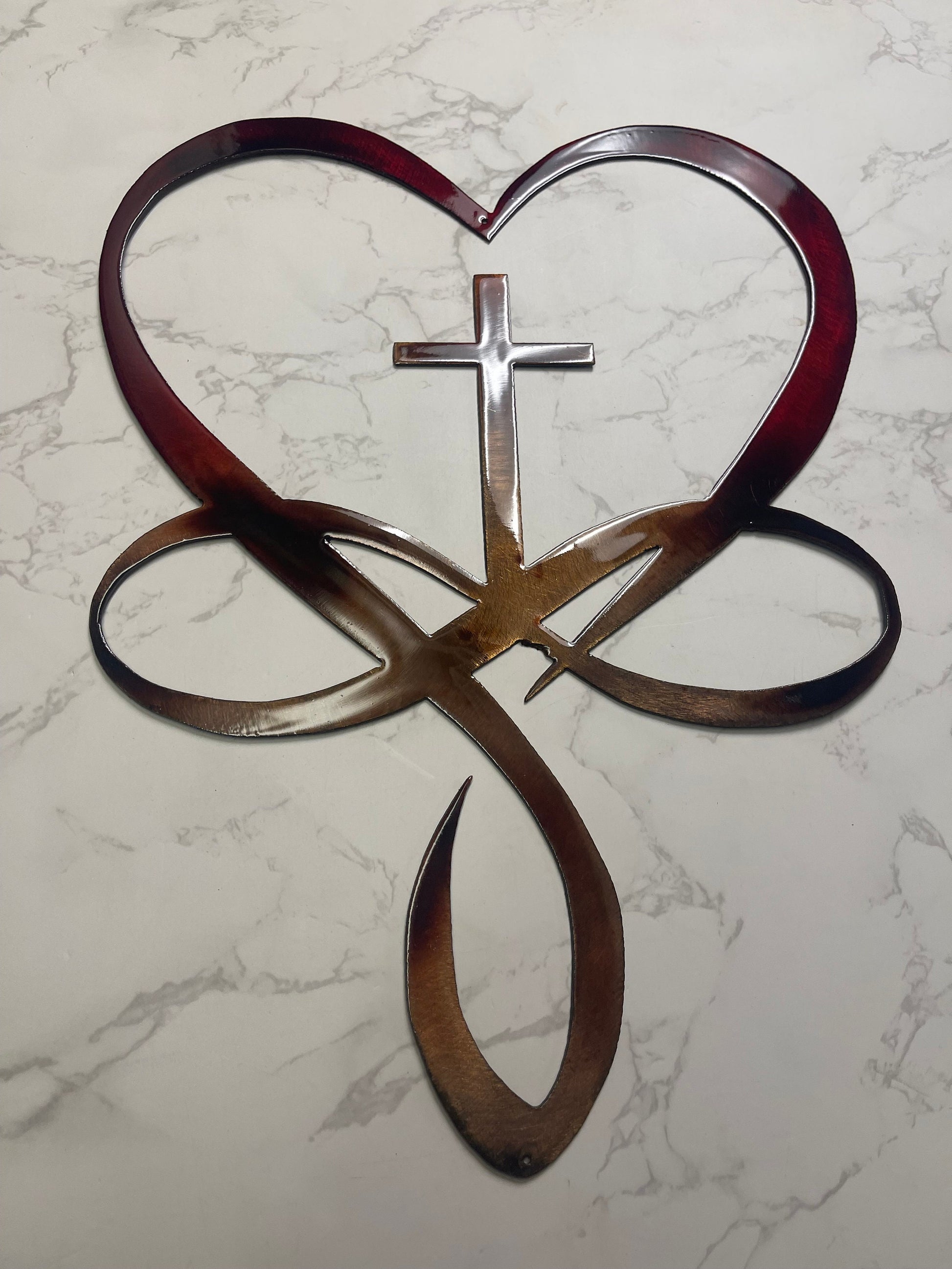 Eternal Love: Infinity Heart Cross Metal Wall Art 42" tall- Steel, Copper, Bronze Plated with Red Paint Accents