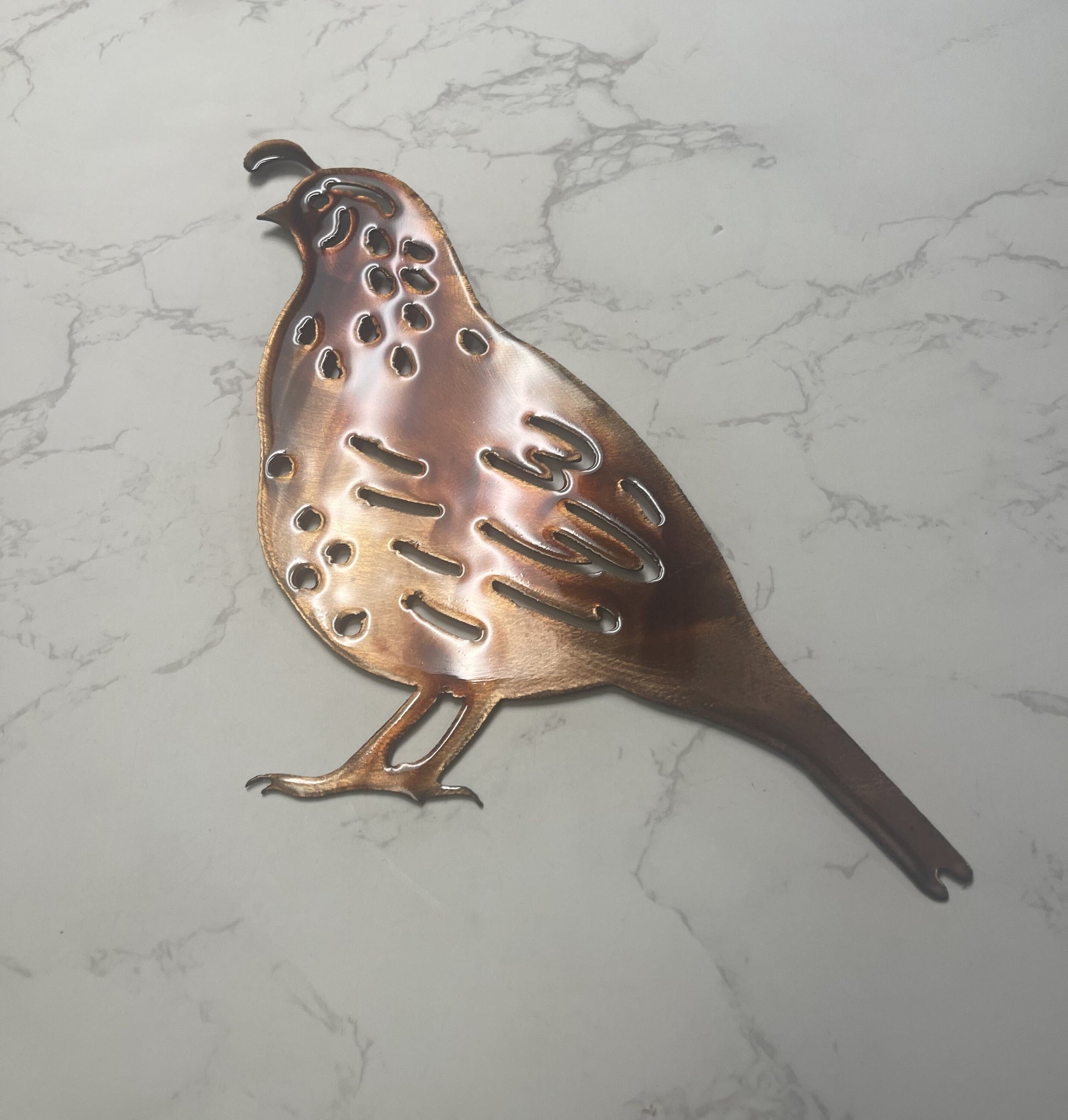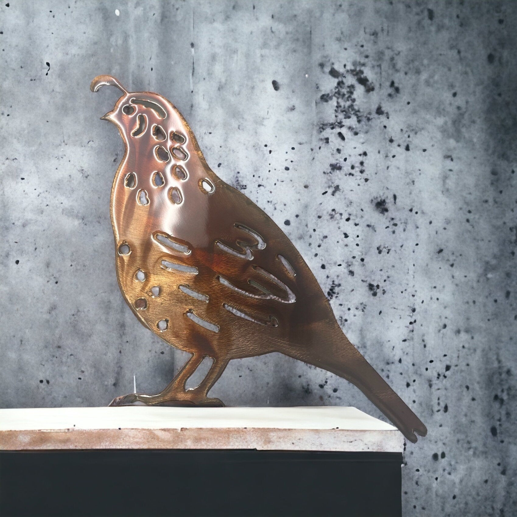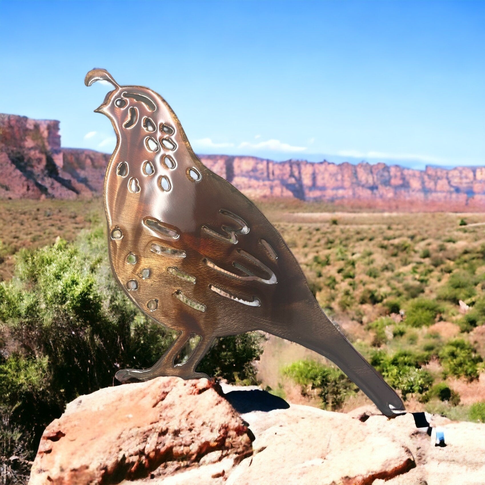 Elevate your decor with the natural elegance of the Quail Family sculpture. This handcrafted masterpiece captures the essence of the Arizona desert in intricate detail. The copper/bronze plated finish not only provides a lifelike appearance but also exudes a rustic charm that complements various interior styles. Choose from 4 sizes and directions....makes this a captivating focal point wherever it's displayed. To preserve its allure and durability, we've added a clear protective coating that safeguards it from environmental factors while retaining its stunning visual appeal. Please note that due to the nature of handcrafting, each piece will possess a unique character. While there might be subtle differences in the final look, rest assured that the craftsmanship and quality remain consistent across all finished sculptures. Bring home a piece of the Arizona desert with our Quail Family sculpture and infuse your living space with the spirit of the Southwest. Ideal for enthusiasts of nature-inspired decor and art lovers alike. Order now to own a piece of art that encapsulates the allure of the Arizona desert landscape.