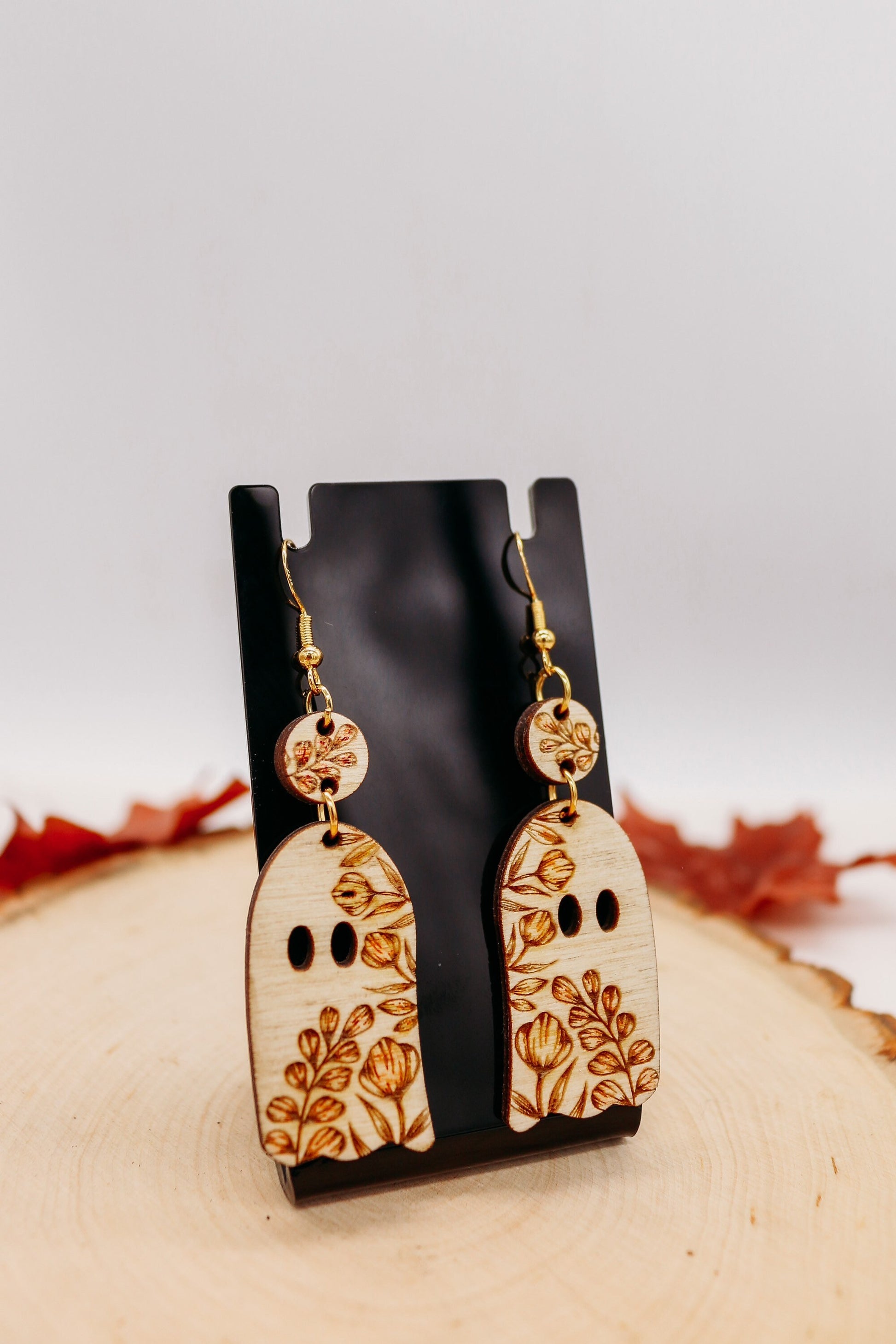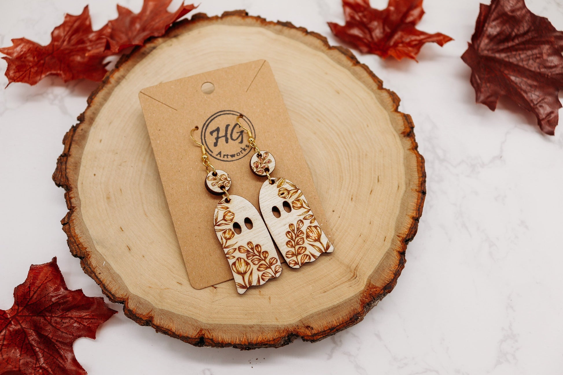 Floral Ghost Dangle Earrings | Halloween | wooden