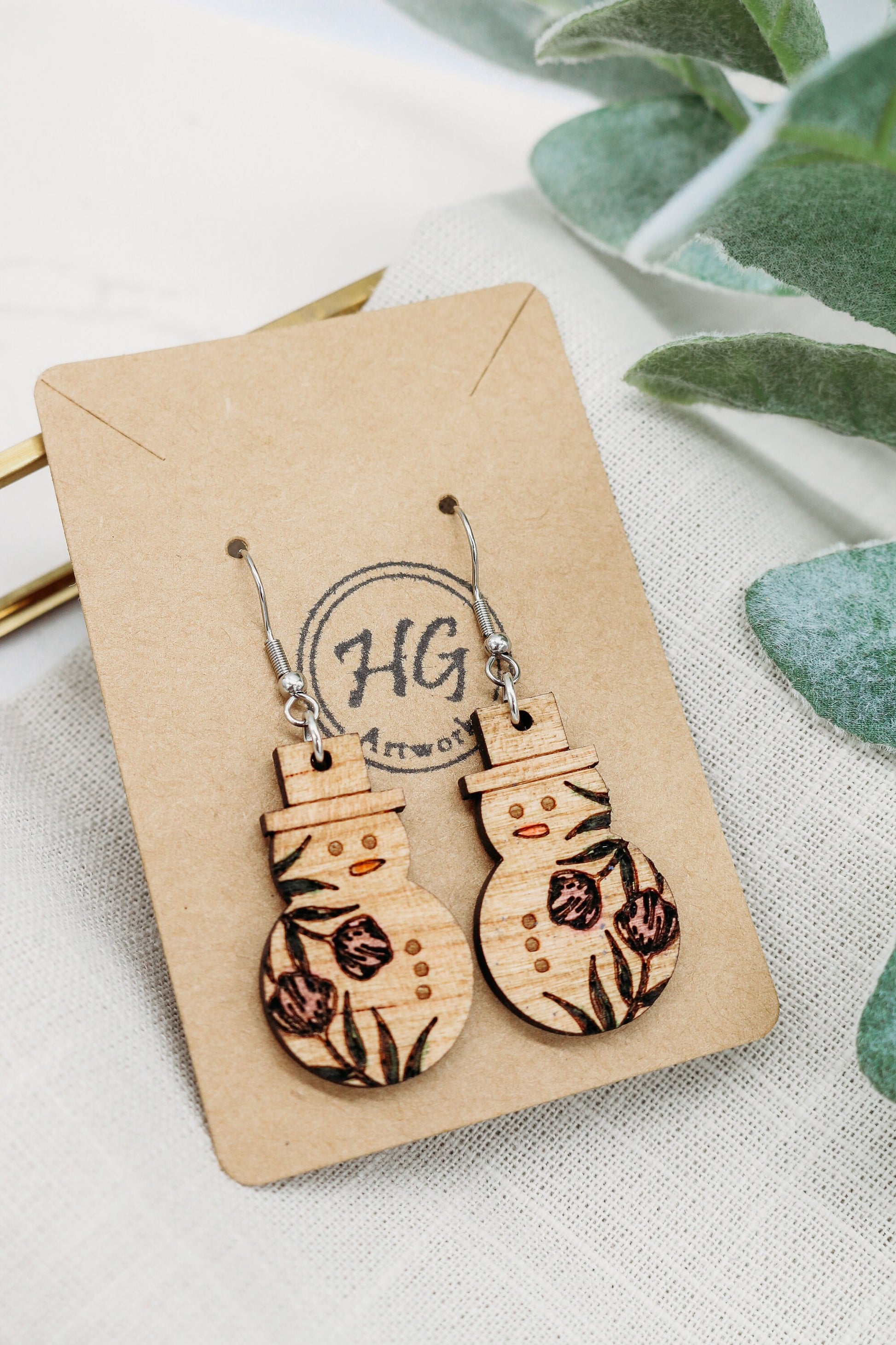 Floral Snowmen Wooden Earrings laser cut on wood and hand painted