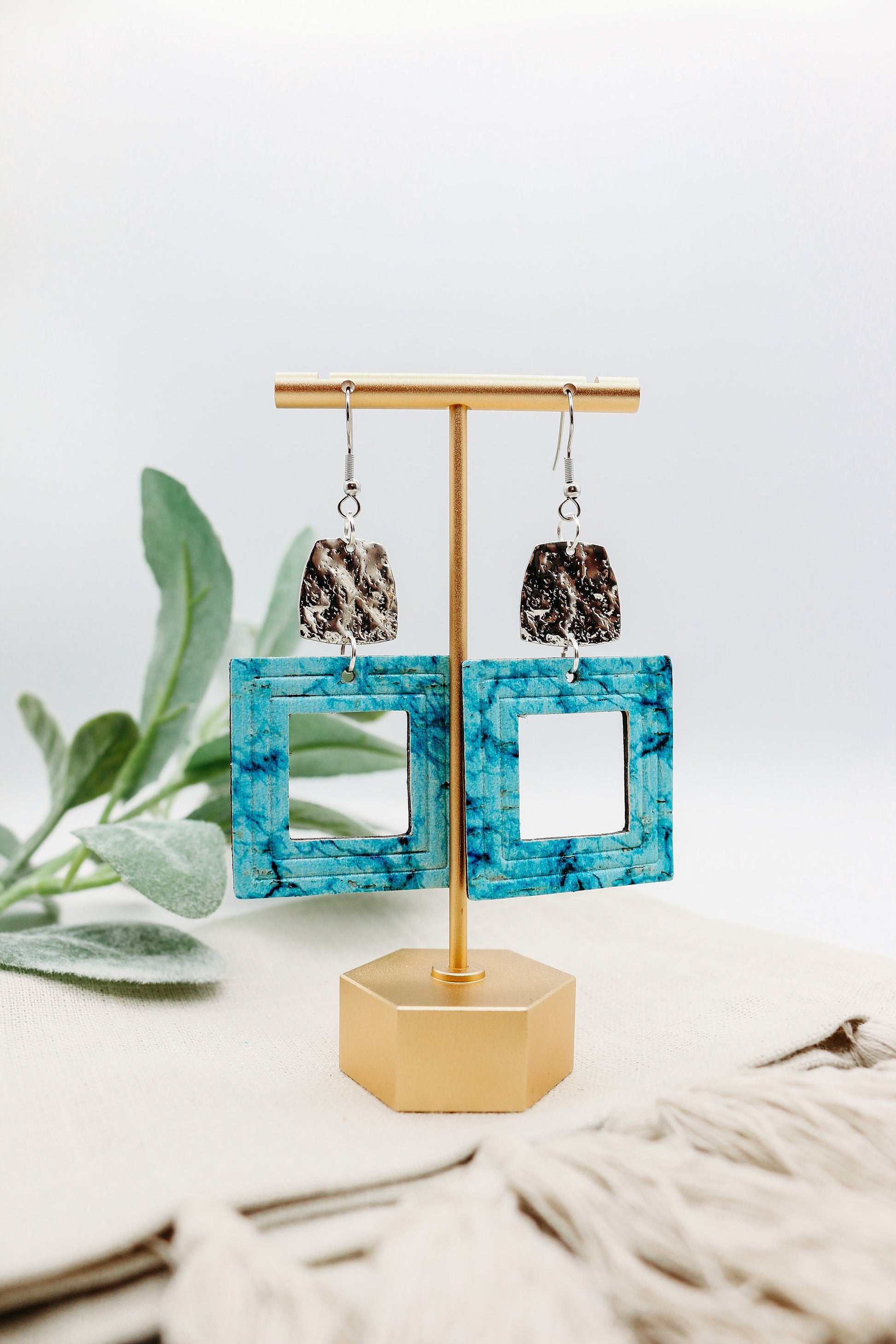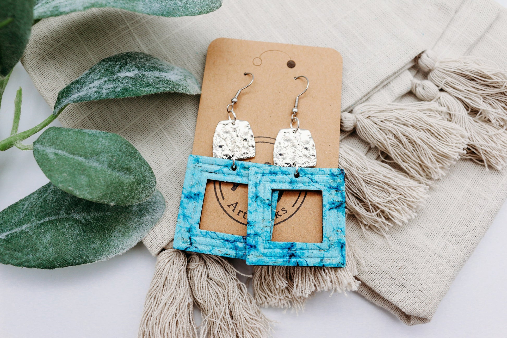 Elevate your style with a touch of the Southwest! Our Geometric Square Cork Leather Earrings, boasting genuine leather and silver hardware with hypoallergenic posts, offer a blend of contemporary flair and natural sophistication. With a 2 1/2" dangle, these earrings are a perfect statement piece for any occasion.