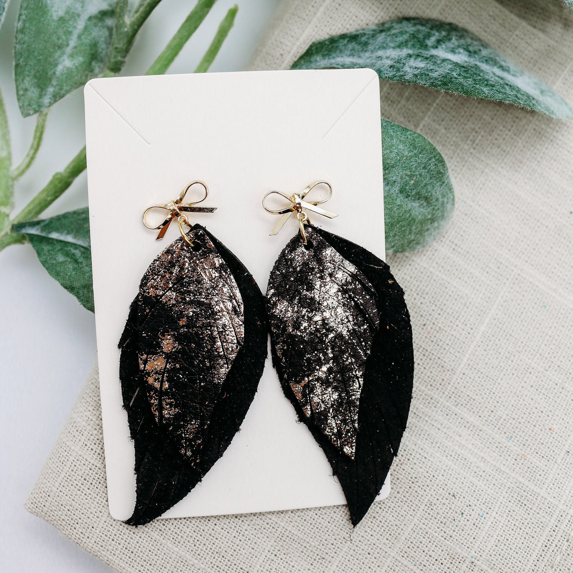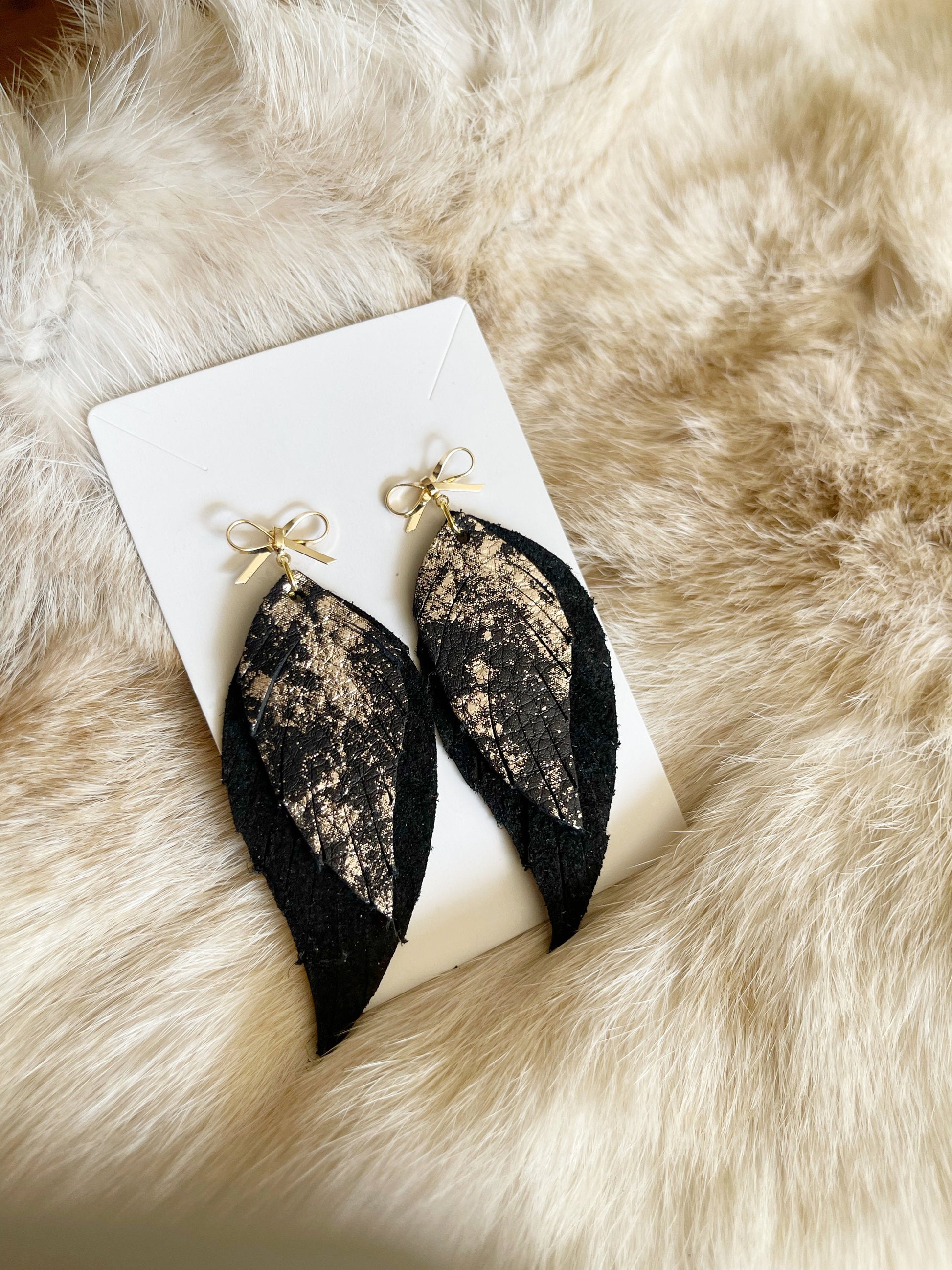 Golden Glamour: Metallic Leather Feather Earrings with Gold Bow Post