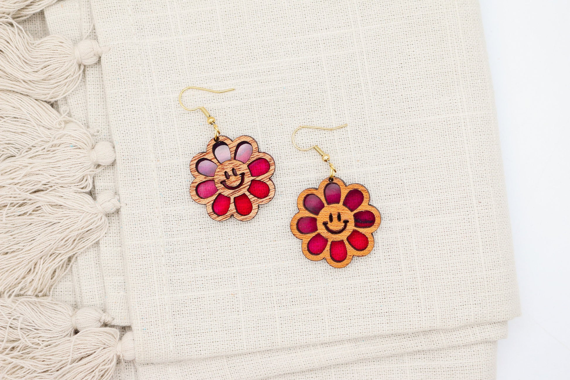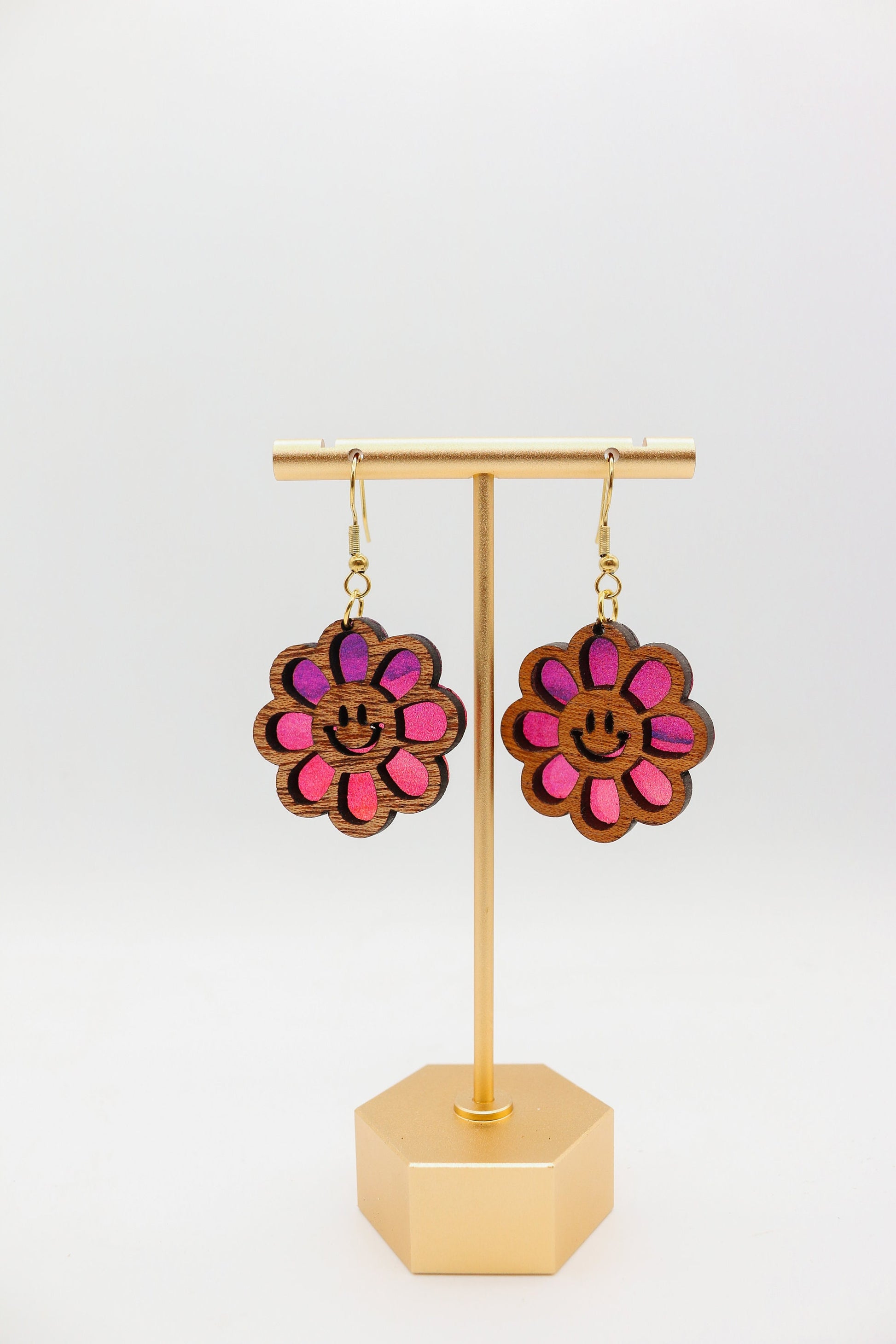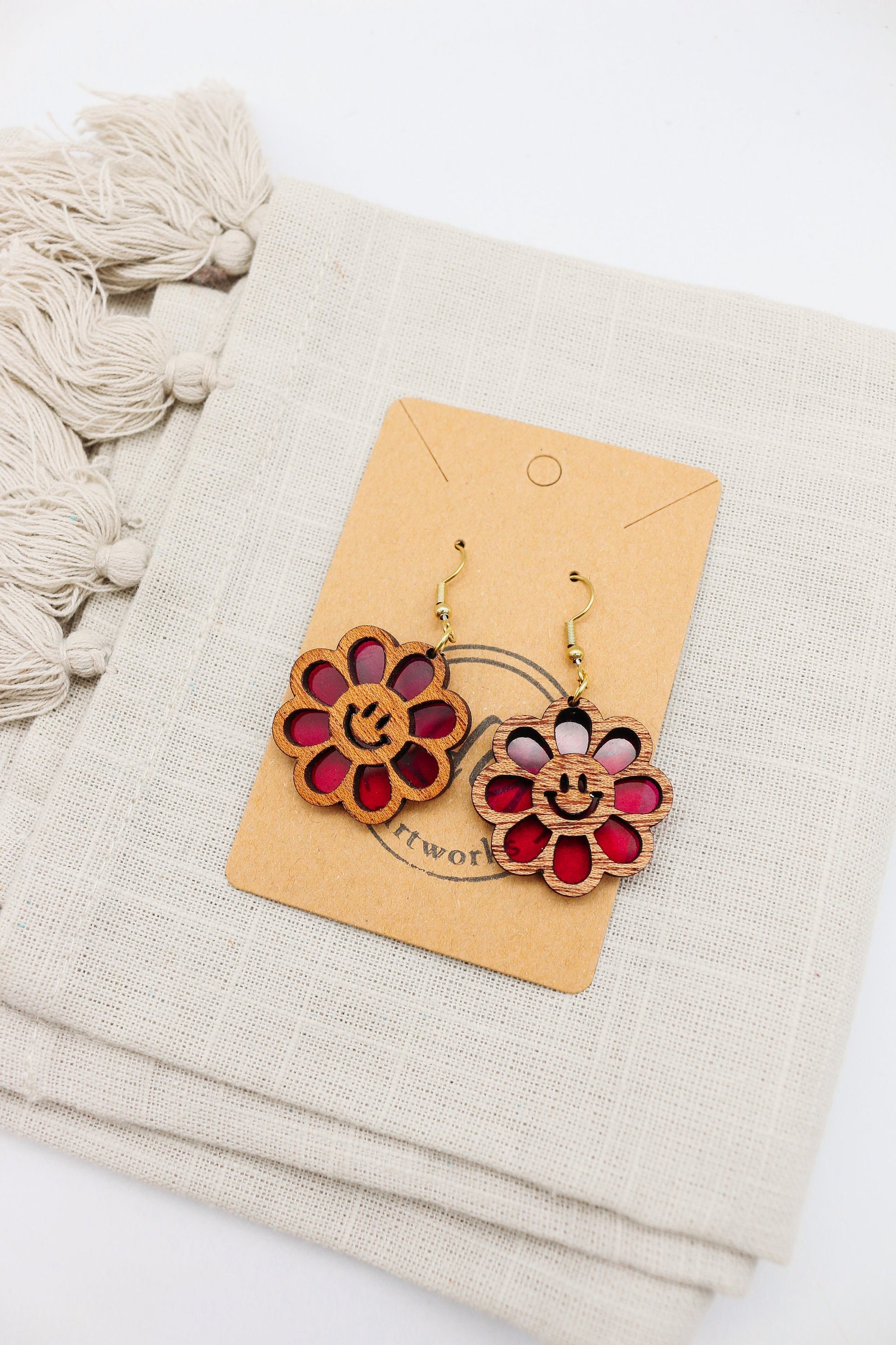These playful earrings feature iconic smiley faces, carefully crafted from a combination of high-quality acrylic and warm, natural wood. The result? A harmonious blend of modern and rustic, making them perfect for any occasion.