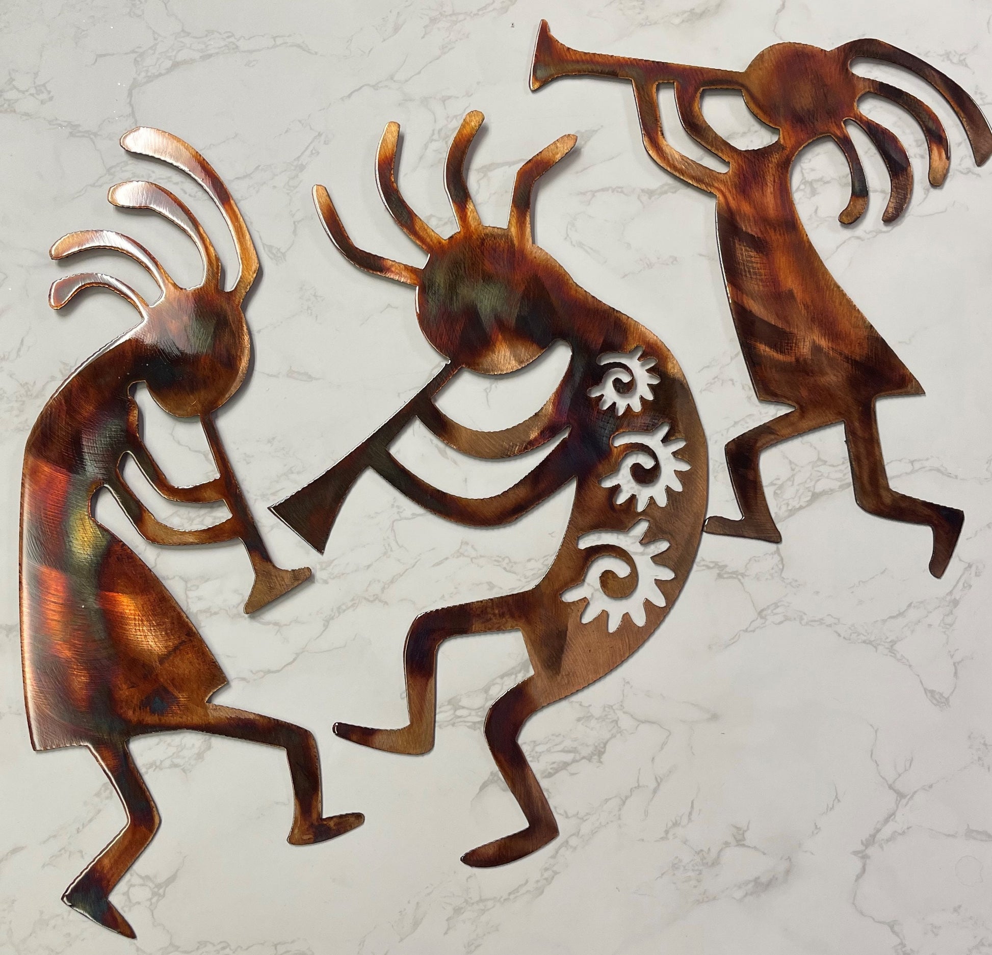 Kokopelli Trio 3 Pieces included Copper & Bronze Plated Clear coated for final finish THIS PIECE IS MADE OUT OF MID GAUGE SHEET METAL Measures approx