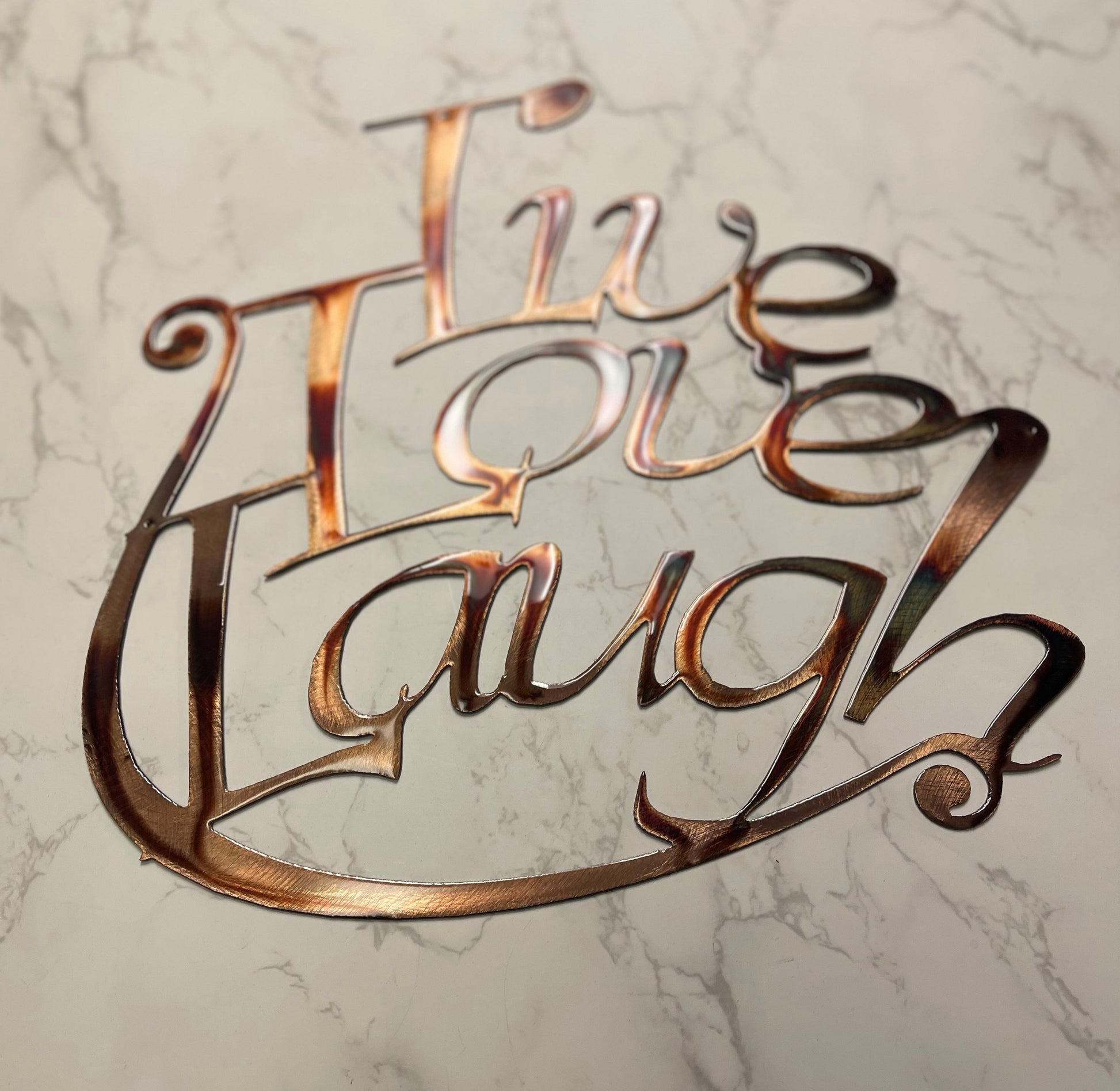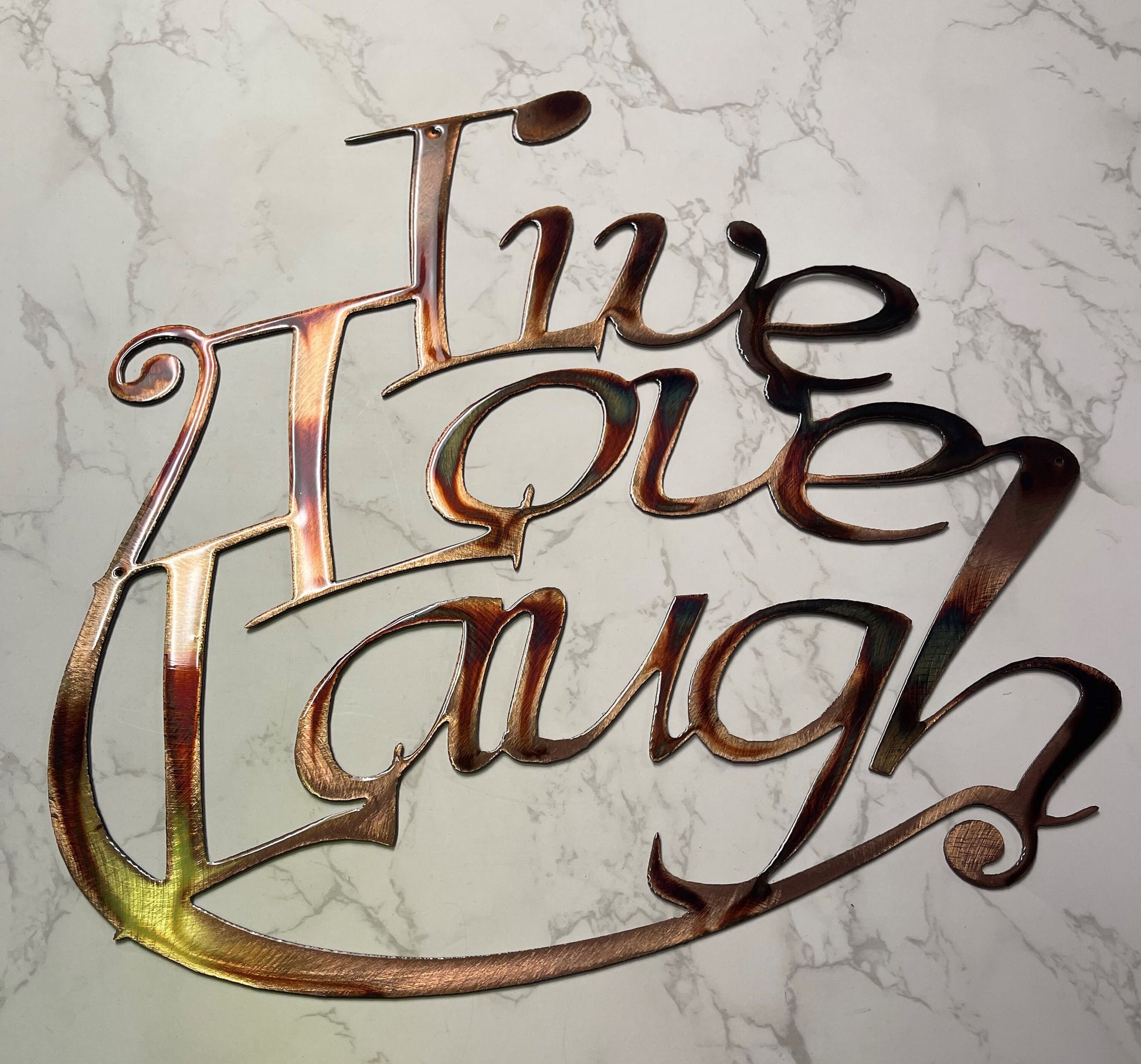 Introducing our "LIVE LOVE LAUGH" Wall Accents, exquisitely crafted Metal Wall Art that will infuse your space with positivity and style. Proudly made in the USA, these accents feature a copper/bronze plated finish that adds a touch of elegance and warmth. Crafted from mid-gauge sheet metal and clear coated for durability, each piece measures approximately 13" x 14". Display these beautiful accents in your home or office as a reminder to embrace life's joys. Elevate your decor with the timeless message of "LIVE LOVE LAUGH." Order now and create a space filled with positivity and inspiration. small drill holes added to aid in hanging.