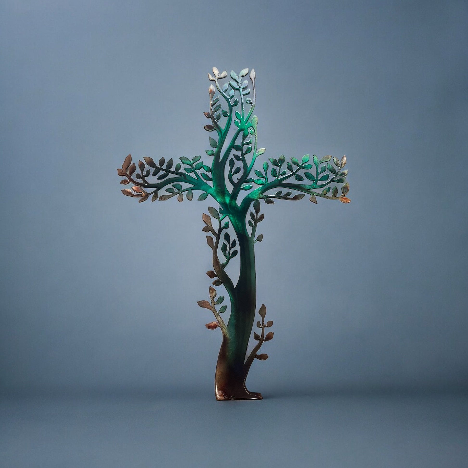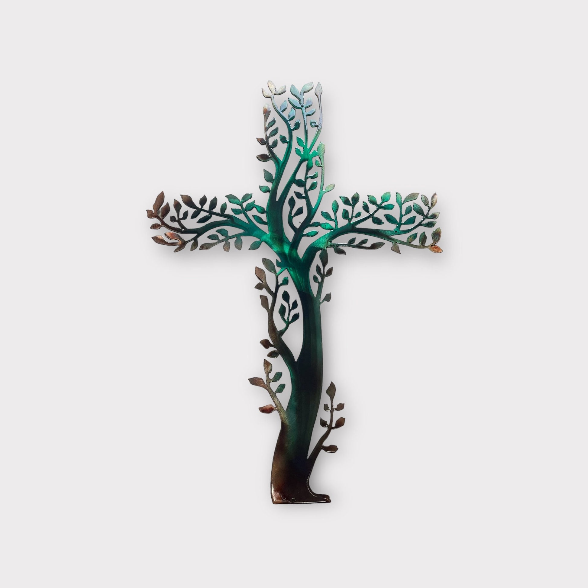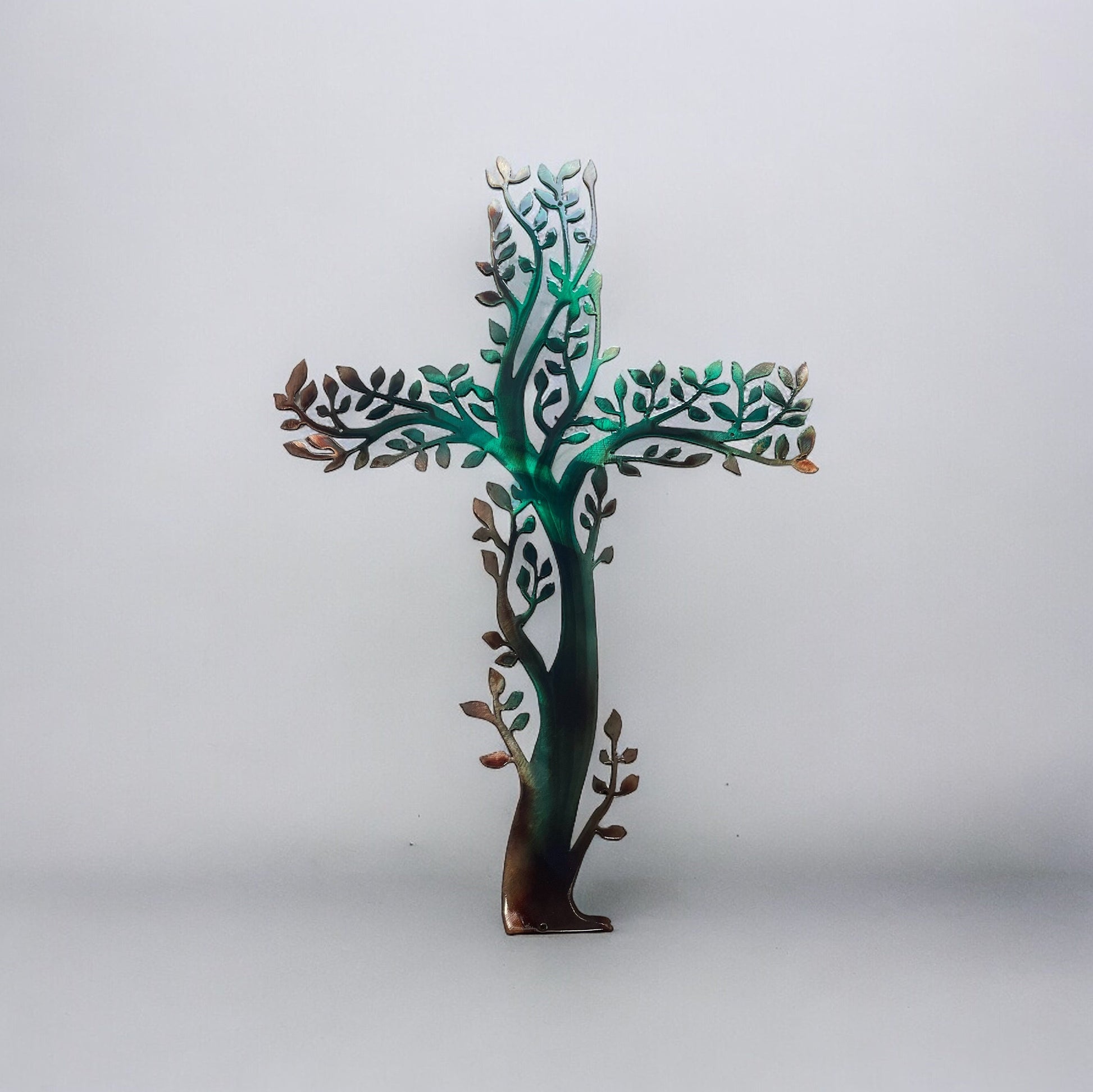 Each cross is carefully bronzed plated with a captivating green tinge added to the coloring, creating an eye-catching and elegant effect. The intricate design is further enhanced by the subtle interplay of copper hues and dark greens, making it a striking addition to any room.