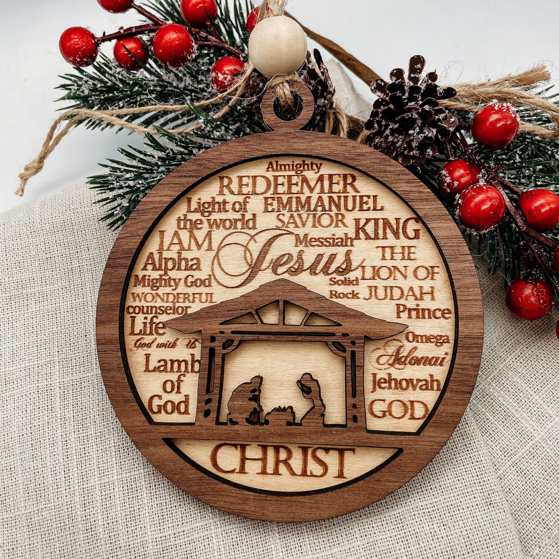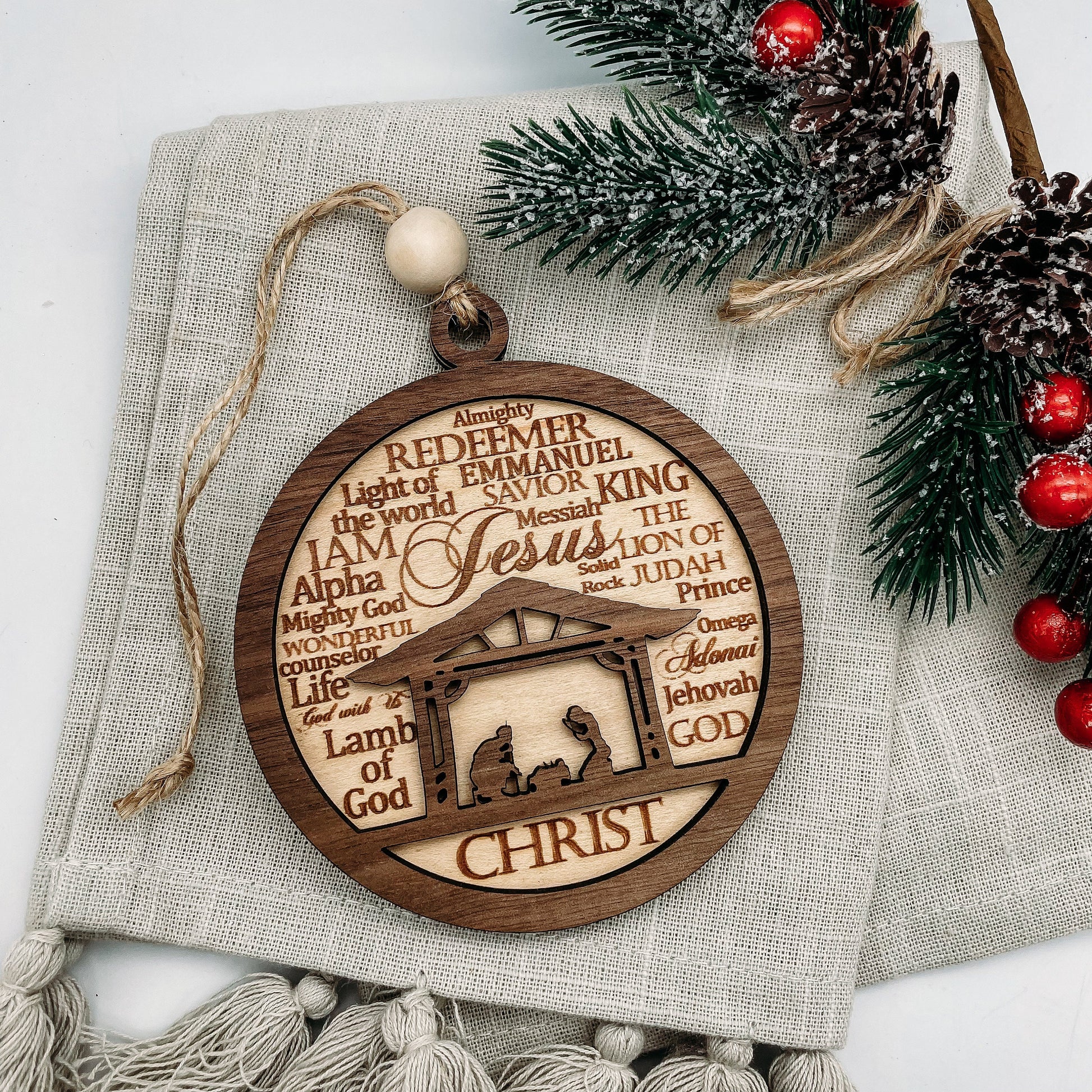 Nativity scene Names of Christ Christmas ornament | layered wood