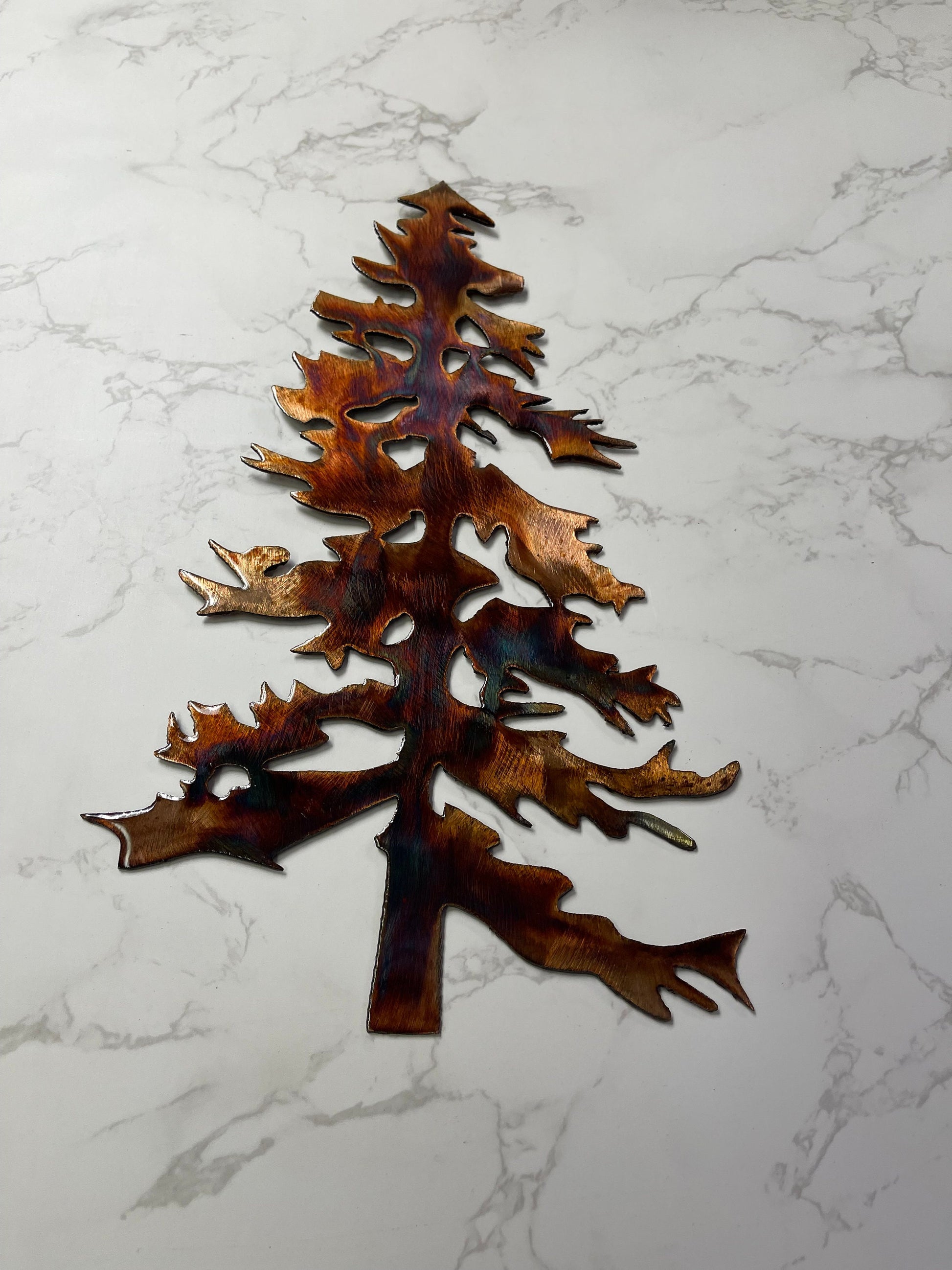 Crafted with care in the USA, this metal art piece is made from high-quality mid gauge sheet metal and measures approximately 12 inches tall by 8 inches wide. The intricate design features a pine tree, complete with detailed branches and has a copper/bronze plated finish that is clear coated for added durability.