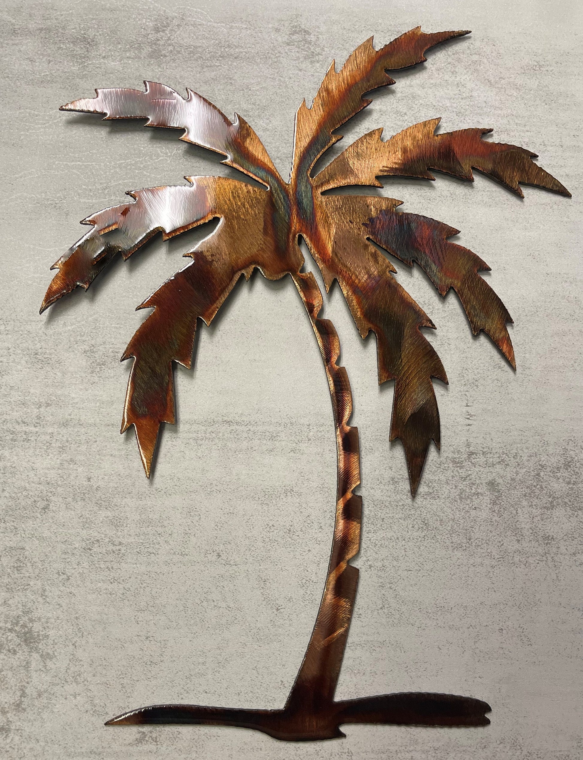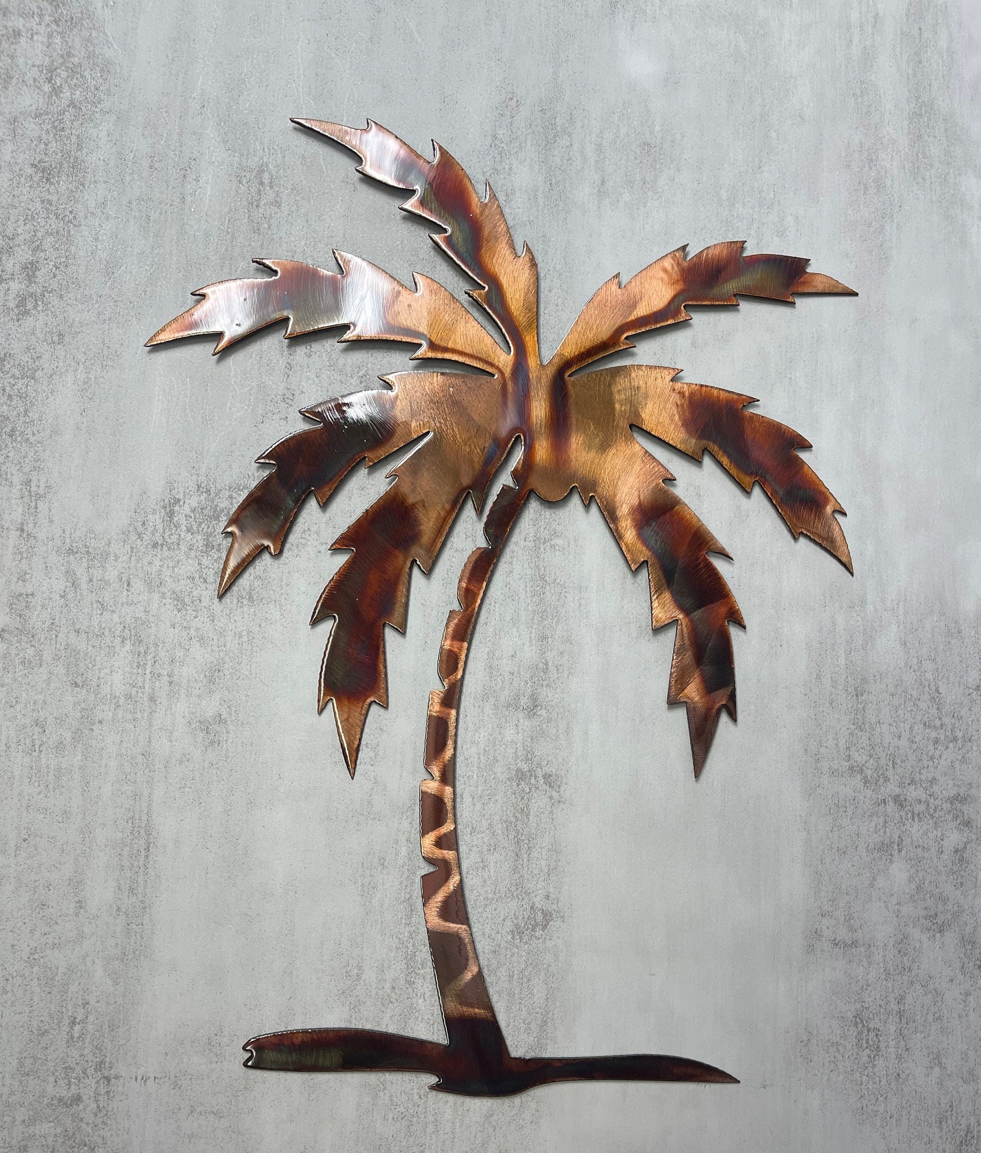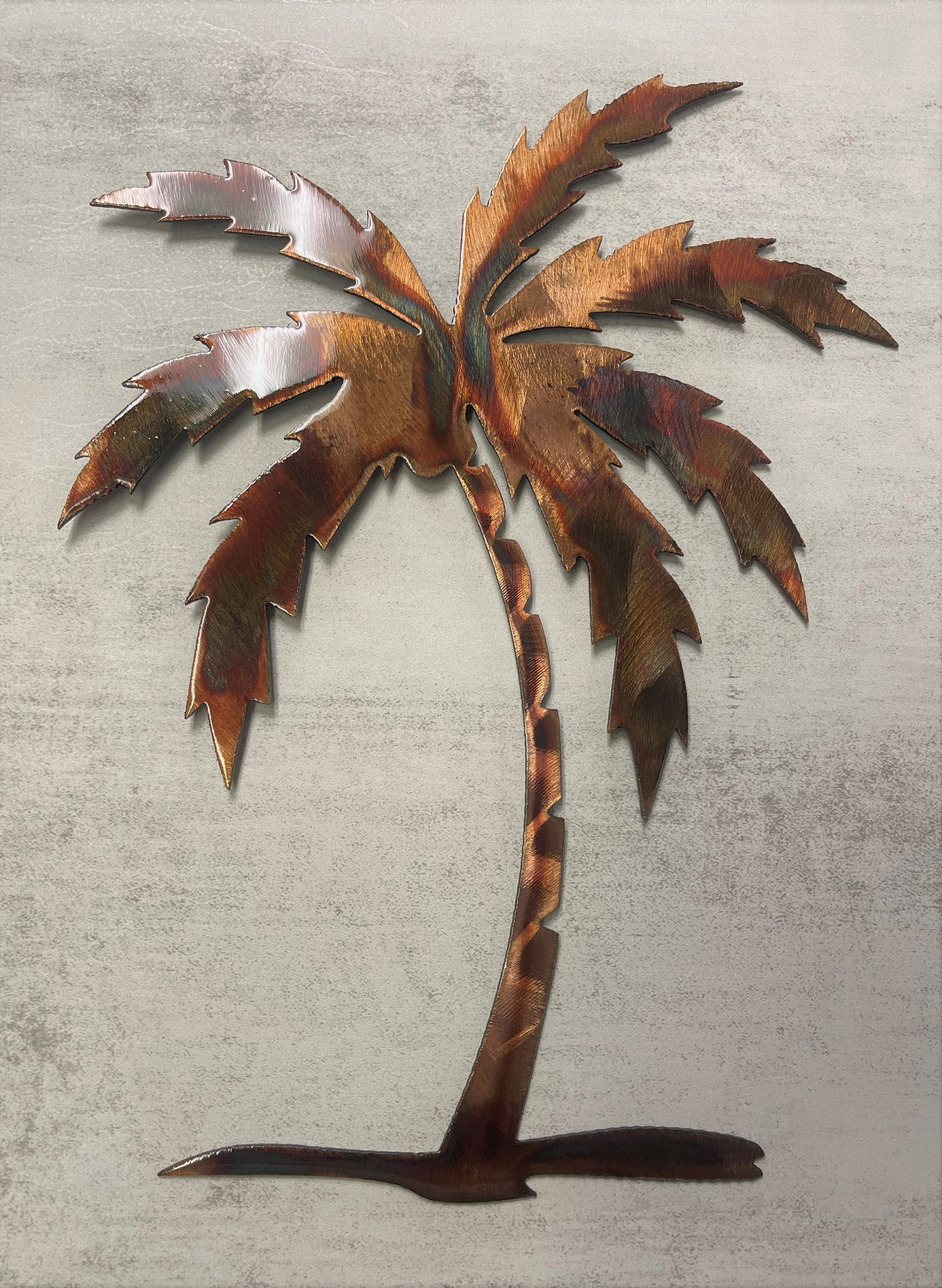 Add some tropical flair to any room with this simple and tasteful palm tree. Whether you want to get back to your tropical roots or are dreaming of better and warmer days, this palm tree is the perfect amount of inspiration to add to your kitchen, bedroom, living room, office, and more. This piece is 100% handcrafted in the USA. Finish: Copper/Bronzed Plated with a clear coat. Approx measurements: 10" w x 12" h and larger Note: Bracket welded to back for ease of hanging. Choose your directional finish, left facing or right facing, or add one of each to make a matching pair. When selecting this item for your home please measure carefully, select the size that will fit in best we make each piece to order Pieces are finished on the front side and unfinished on the backside....we recommend using a matte clear spray paint on the backside (this doesn't run like a gloss) to seal if you are hanging them outside.