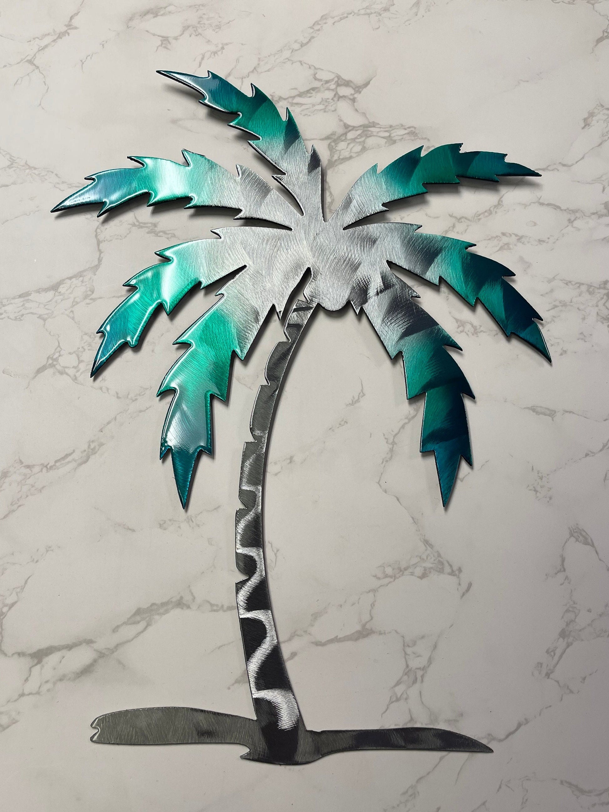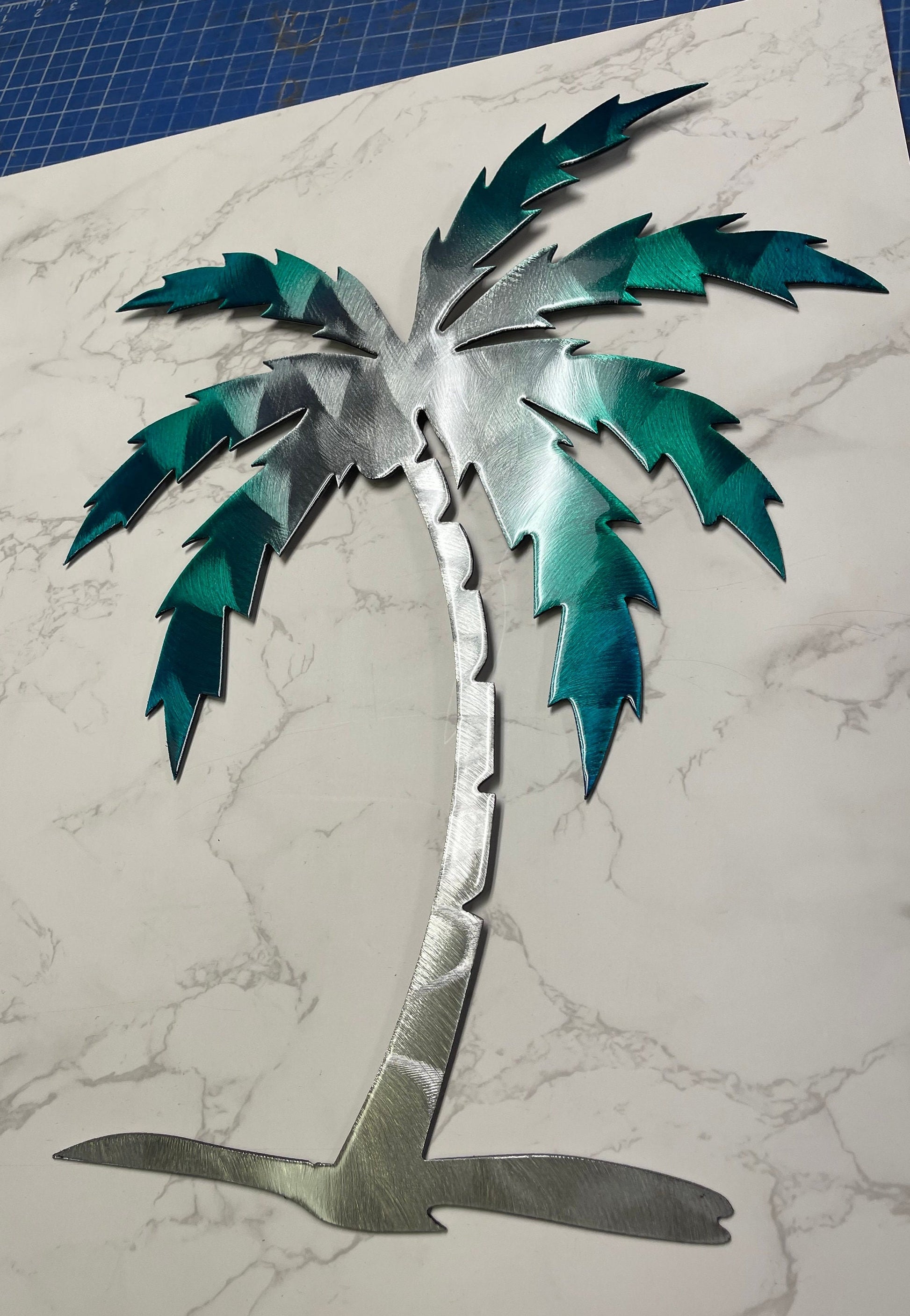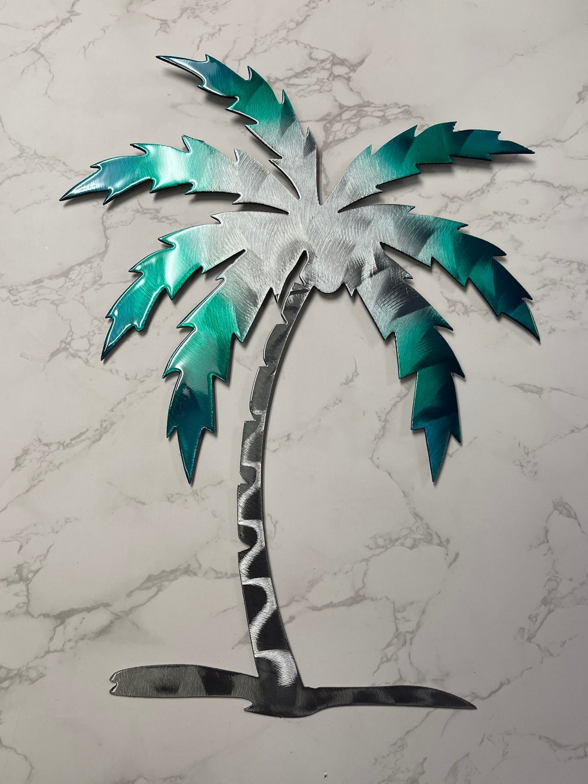 Add some tropical flair to any room with this simple and tasteful palm tree. Whether you want to get back to your tropical roots or are dreaming of better and warmer days, this palm tree is the perfect amount of inspiration to add to your kitchen, bedroom, living room, office, and more. This piece is 100% handcrafted in the USA. Finish: Our formulated teal tinged finish--green/blue Plated with a clear coat. Approx measurements: 10" w x 12" h and larger Note: Bracket welded to back for ease of hanging. Choose your directional finish, left facing or right facing, or add one of each to make a matching pair. When selecting this item for your home please measure carefully, select the size that will fit in best we make each piece to order Pieces are finished on the front side and unfinished on the backside....we recommend using a matte clear spray paint on the backside (this doesn't run like a gloss) to seal if you are hanging them outside.