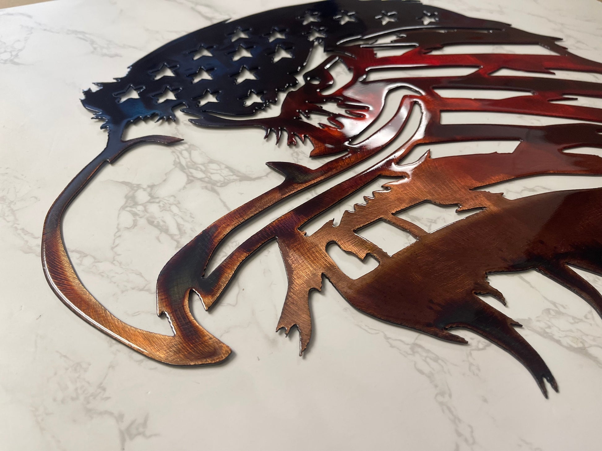 Crafted from durable mid-gauge sheet metal, this wall accent is built to stand the test of time while making a bold statement in your space. The piece features a captivating combination of copper and bronzed plating, adorned with a touch of blue and red tinging, truly bringing the stars and stripes to life.