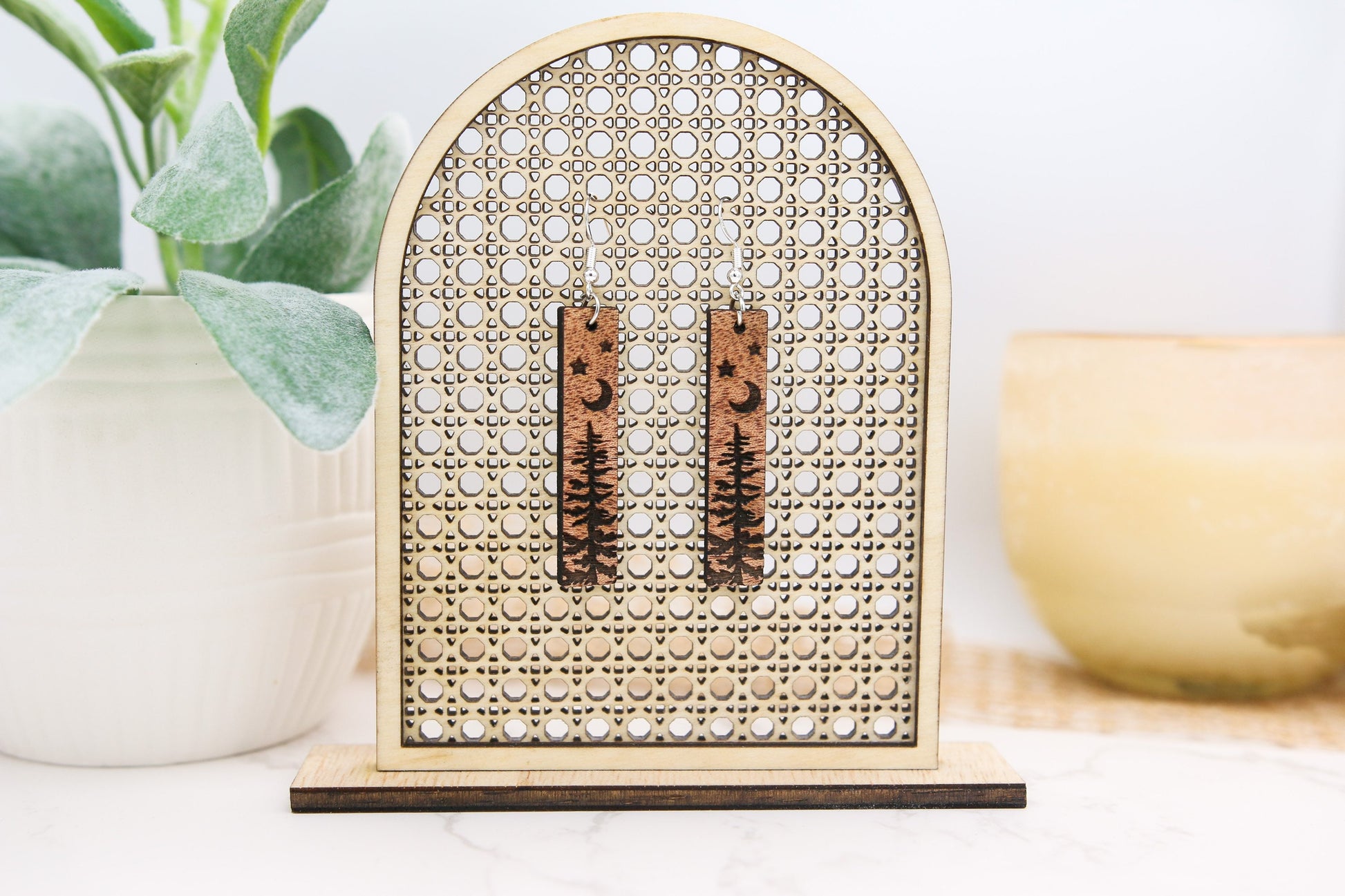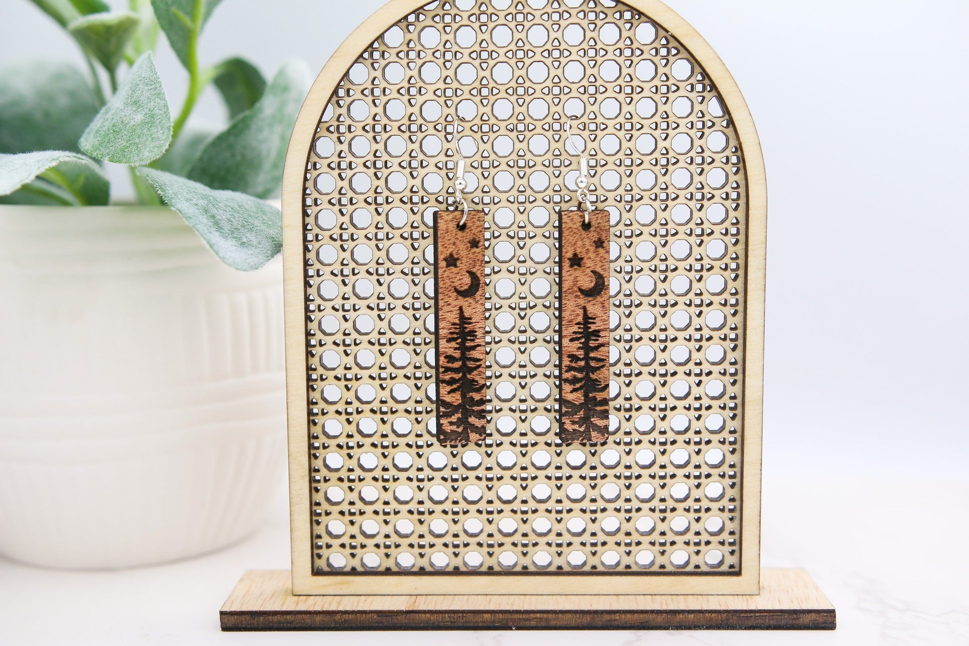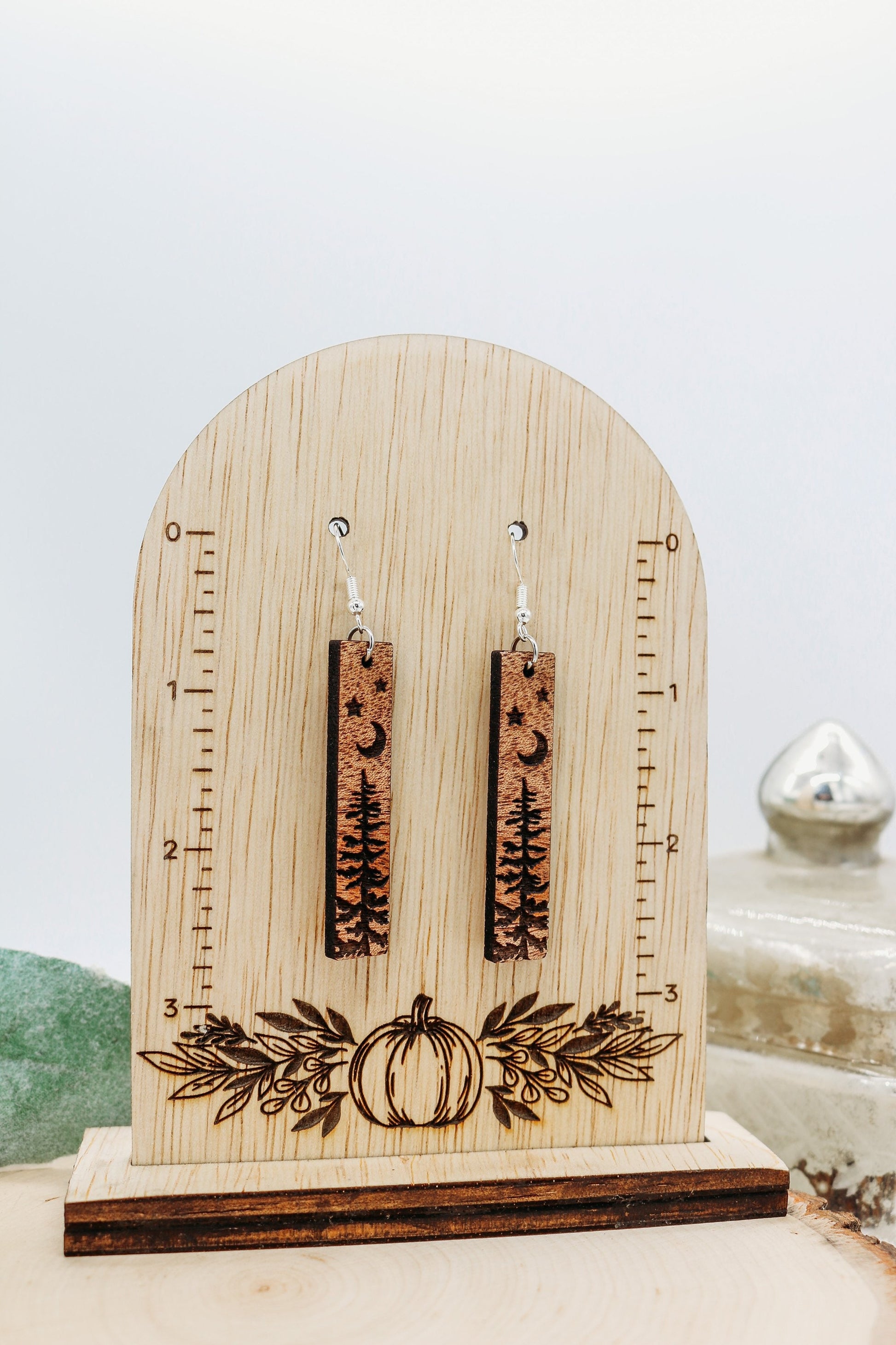Pine tree moon Rectangle Dangle Earrings | Fall season | wooden