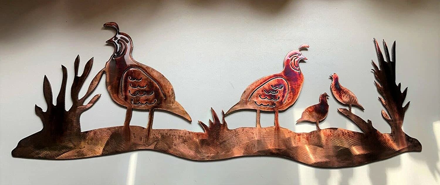 Capture a piece of the Arizona desert. This quail scene has quickly become one of our customers favorite pieces. 9 1/2" tall x 24" wide in our copper/bronze plated finish with a clear coating to seal it. has hangers welded on the backside Every piece is made to order and will vary a hair in the final look, but all finished the same.