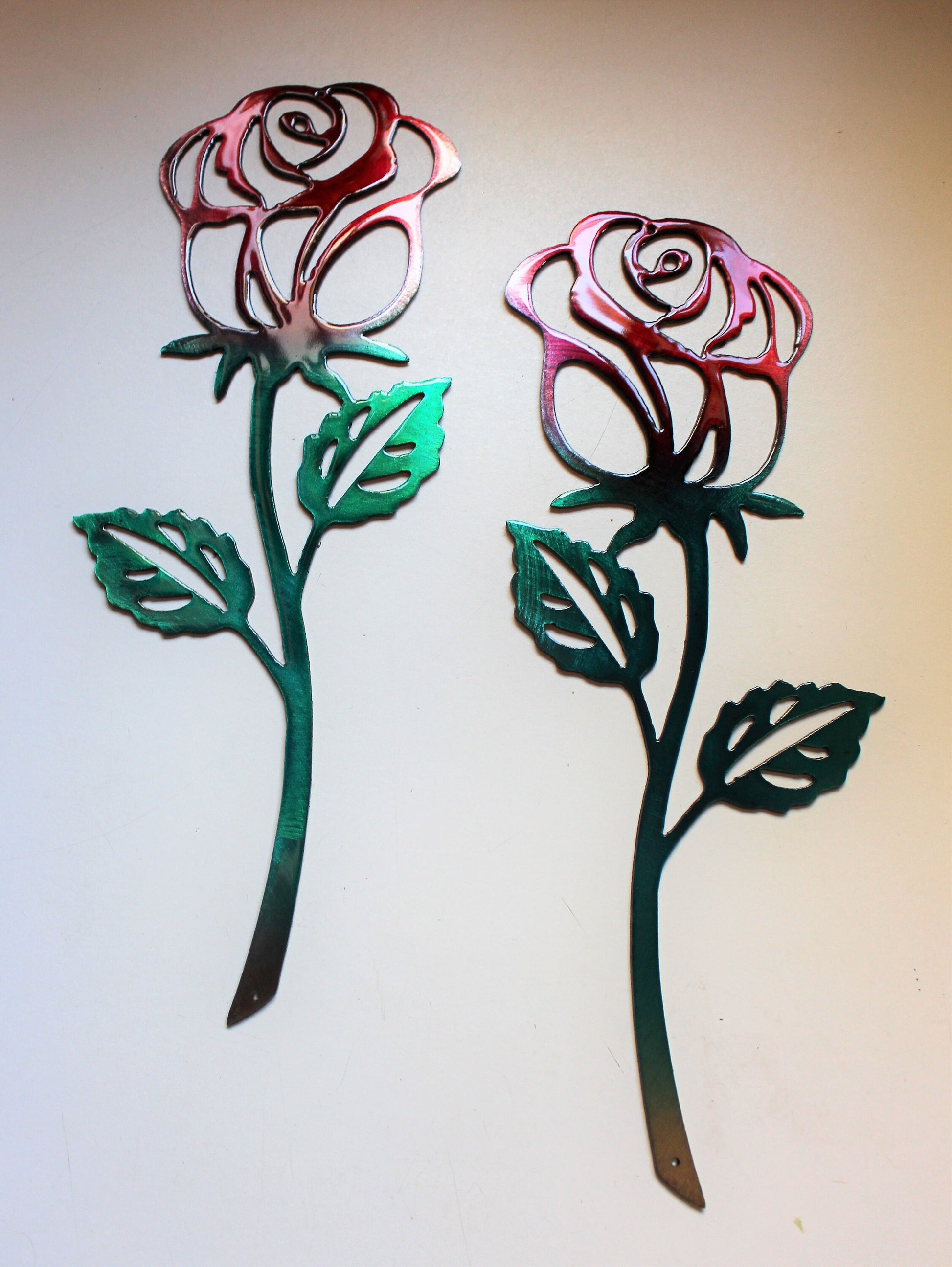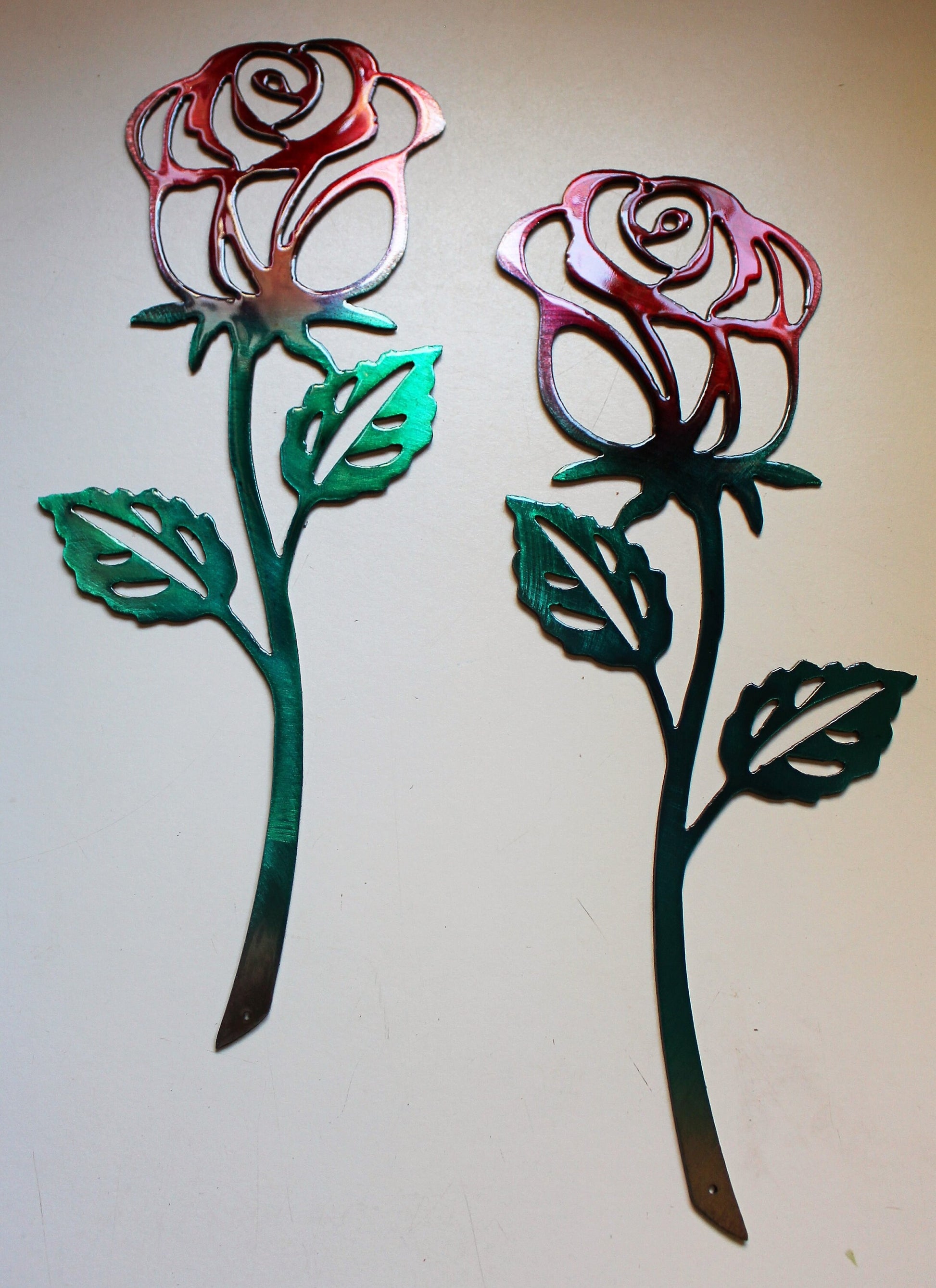 Add a touch of romance and elegance to your home with our stunning pair of metal wall art roses! This beautiful set features two intricately designed roses, tinged in classic red with our green tinge, adding a pop of color and style to any room. Expertly crafted from high-quality metal, these pieces are durable and long-lasting, ensuring that you can enjoy the beauty of these roses for years to come. With their unique and eye-catching design, these metal wall art roses are perfect for creating a focal point in your living room, bedroom, or any other space in your home. Plus, they come with brackets welded to the back for easy and secure hanging. Order yours today and bring a touch of floral charm to your home decor! Why give roses that die and wither when you can give a gift that lasts a lifetime.