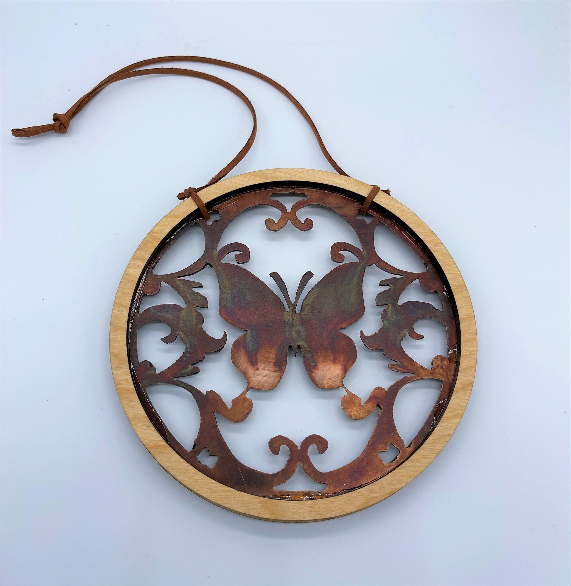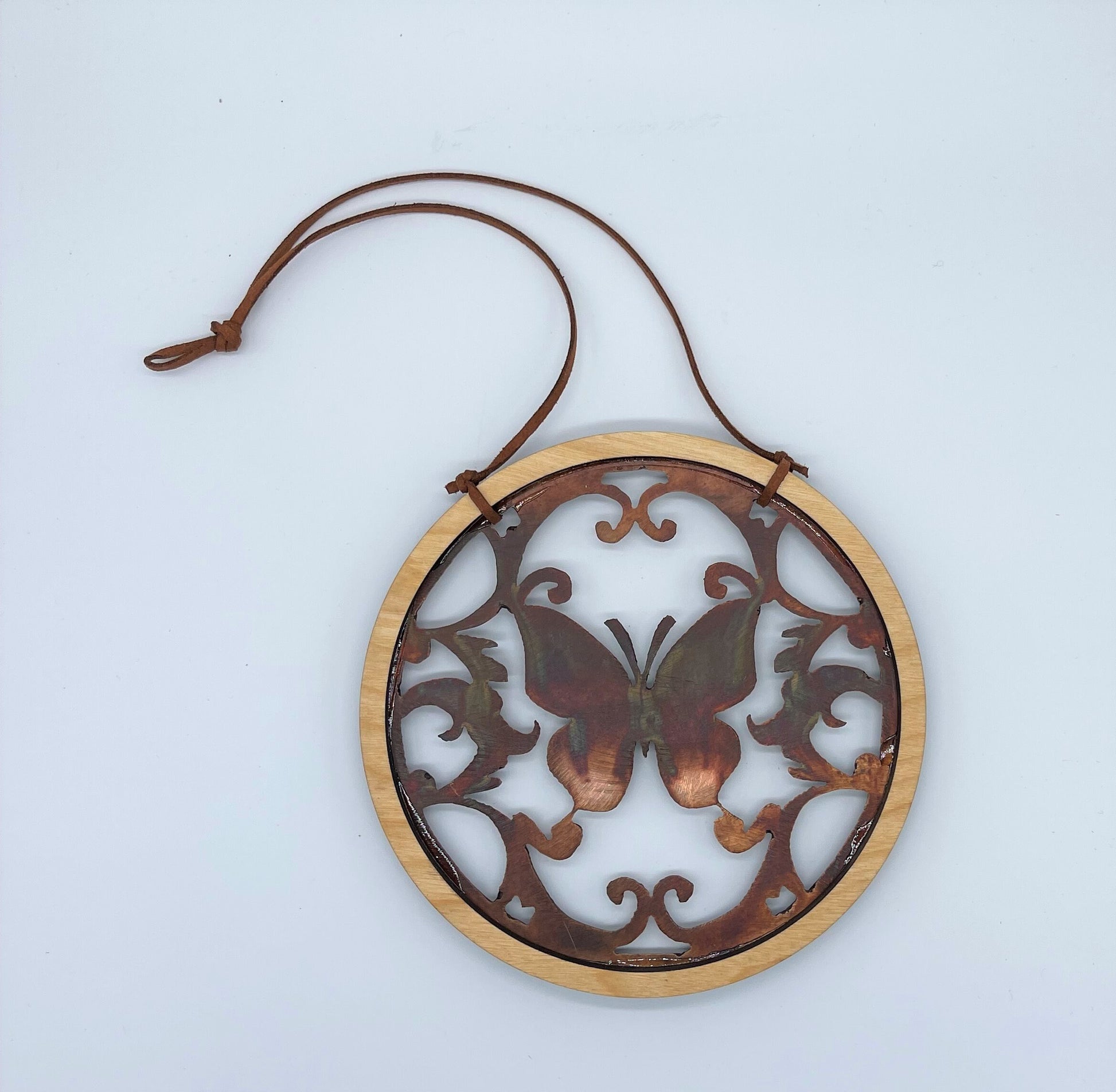 Rustic Wood and Butterfly Metal Wall Accent or Sun Catcher Copper Plated