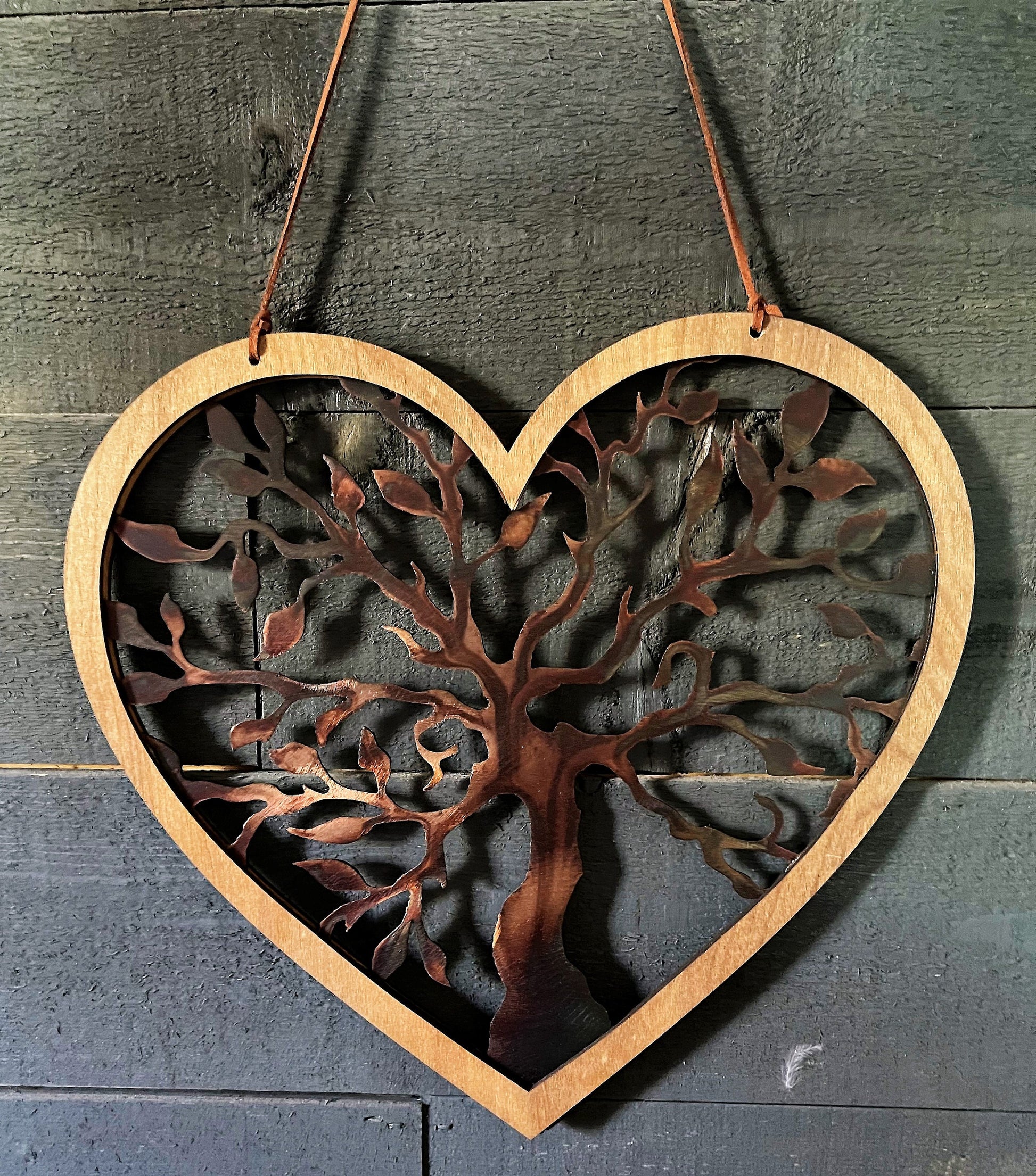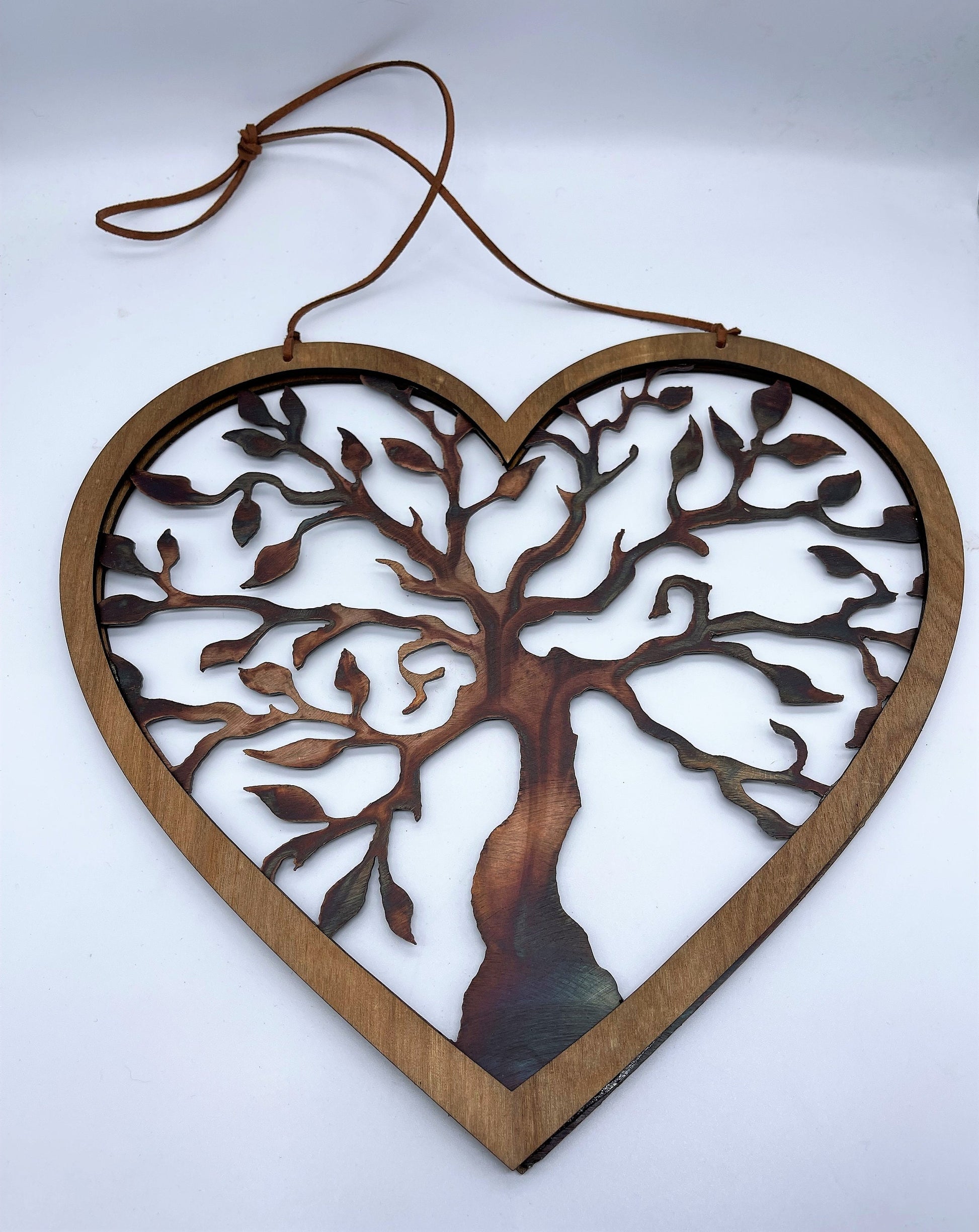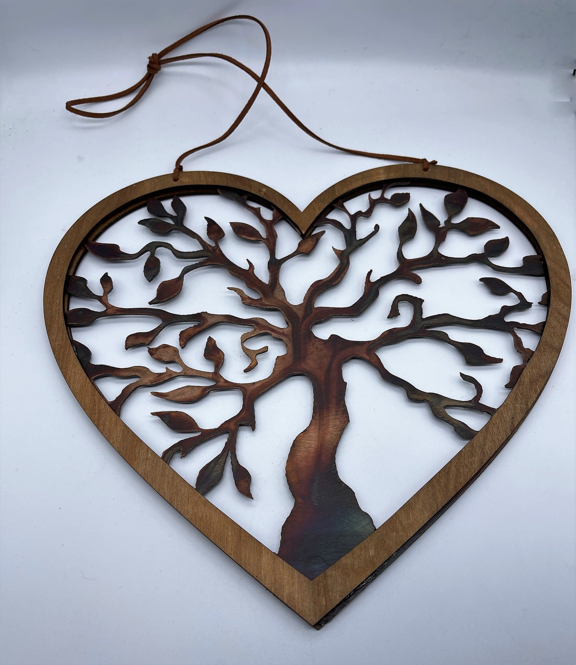 For years I have wanted to combine a tree with a wooden frame, especially an Olive Tree. This symbolic piece is made from in our copper/bronze finish and matte sealed. Finished with a wood birch trimmed frame sandwiches the piece to make it a unique and creative treat to hang on your wall.