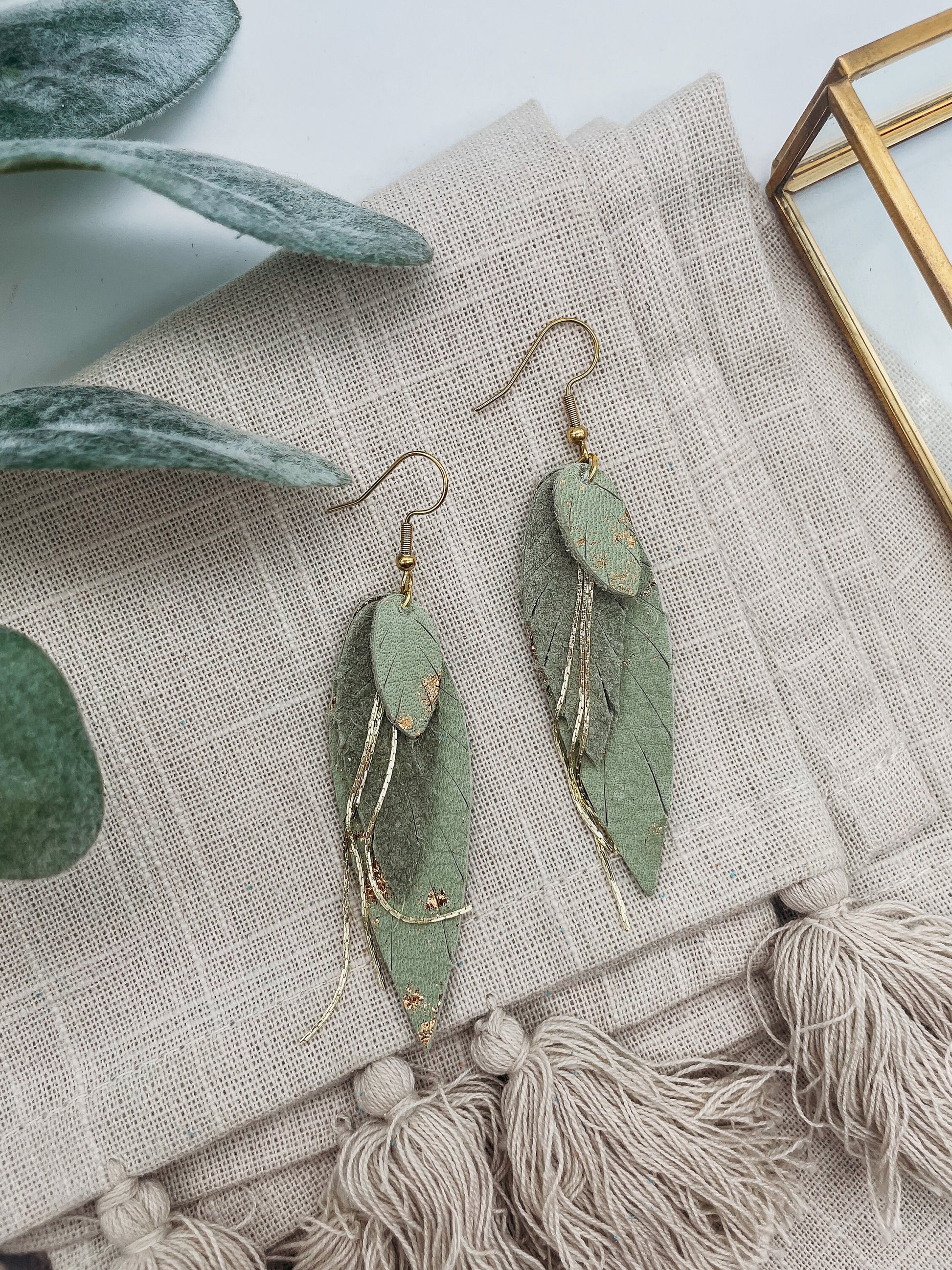 Sage Green and Gold Layered Feathered Earrings - Boho Chic Dangles