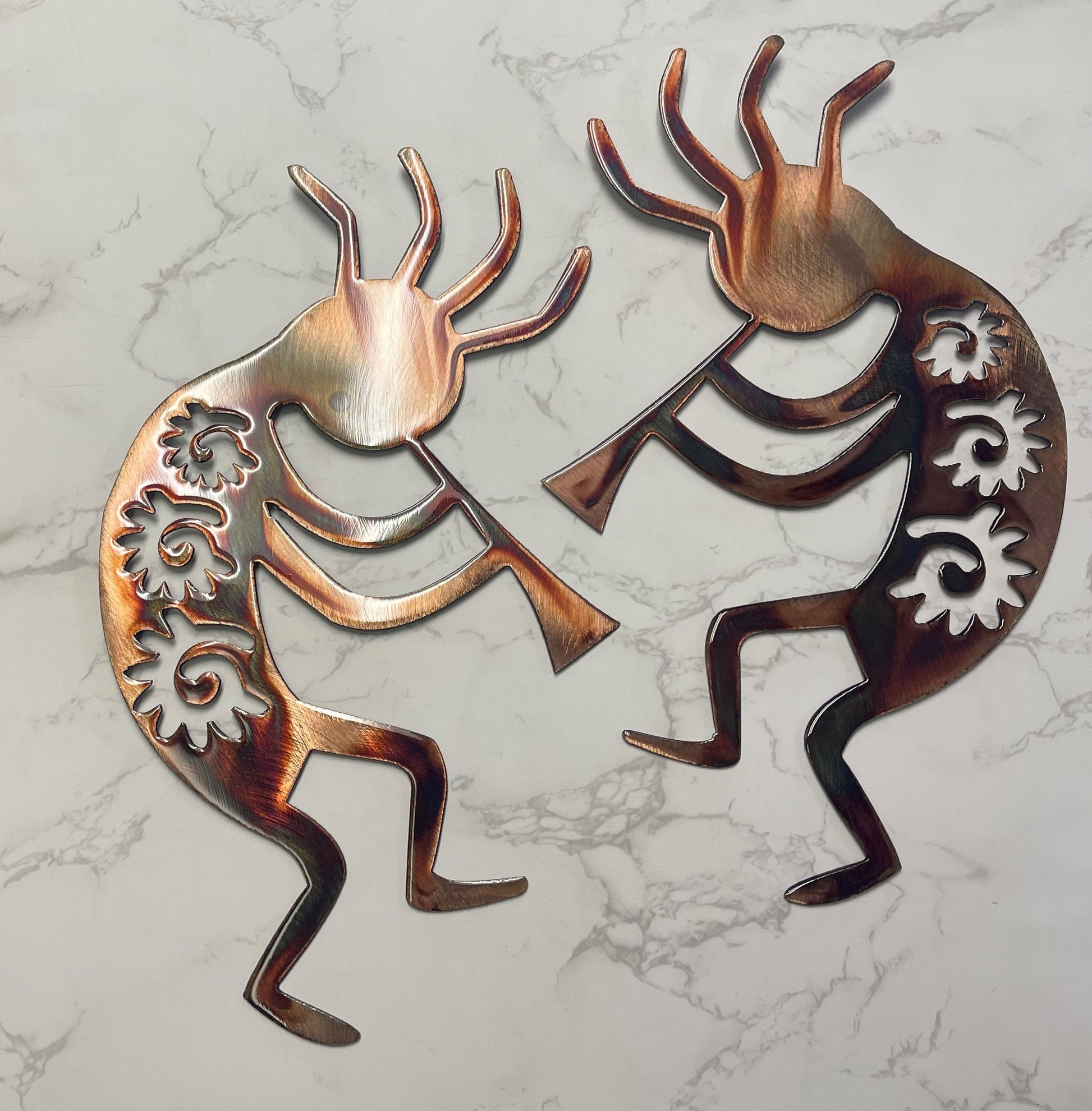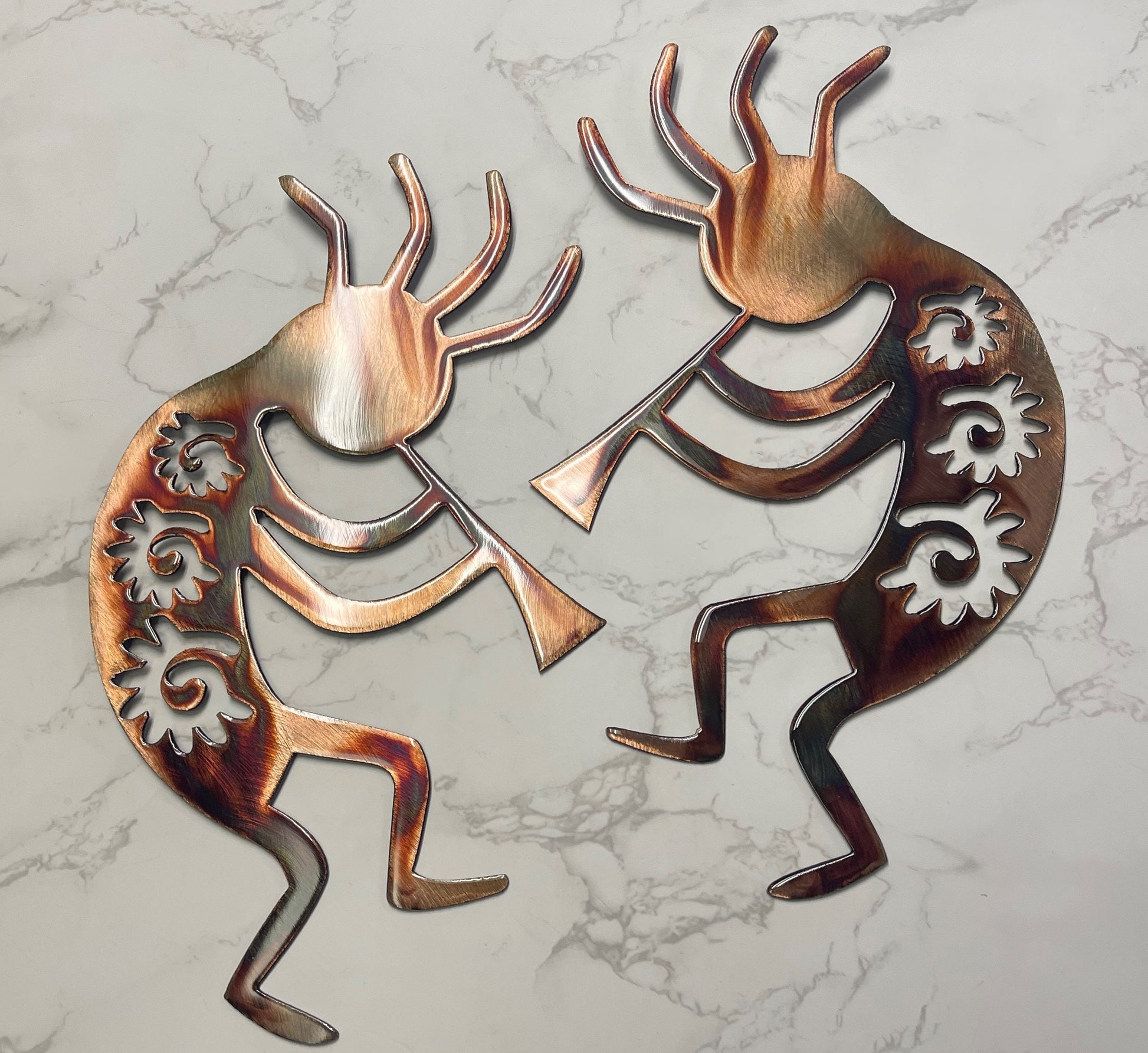 Inspired by the iconic Kokopelli figure of Arizona's rich cultural heritage, each wall art piece is a testament to the fusion of artistry and tradition. The copper and bronze plating create a stunning interplay of colors, showcasing the intricate detailing of this legendary figure.