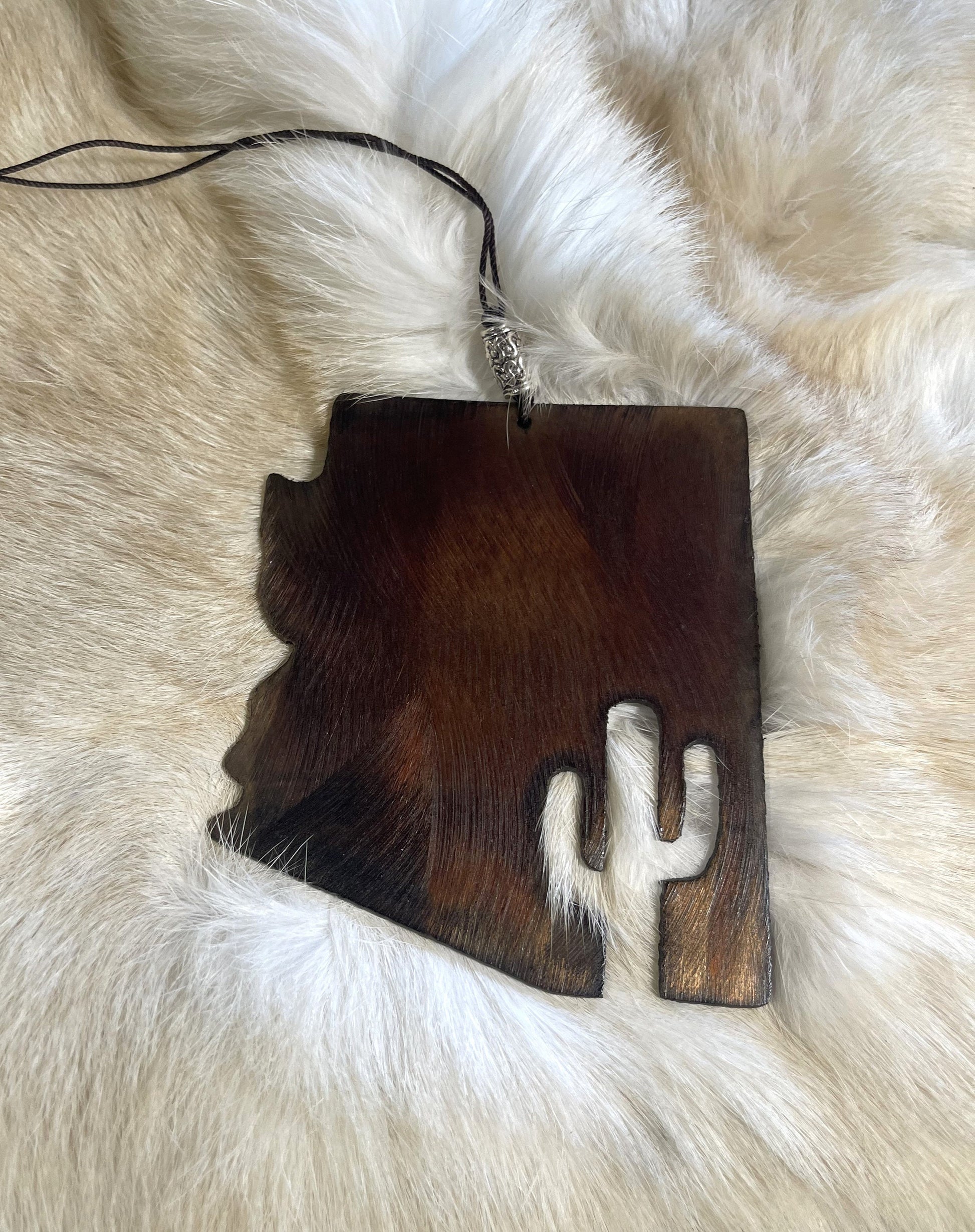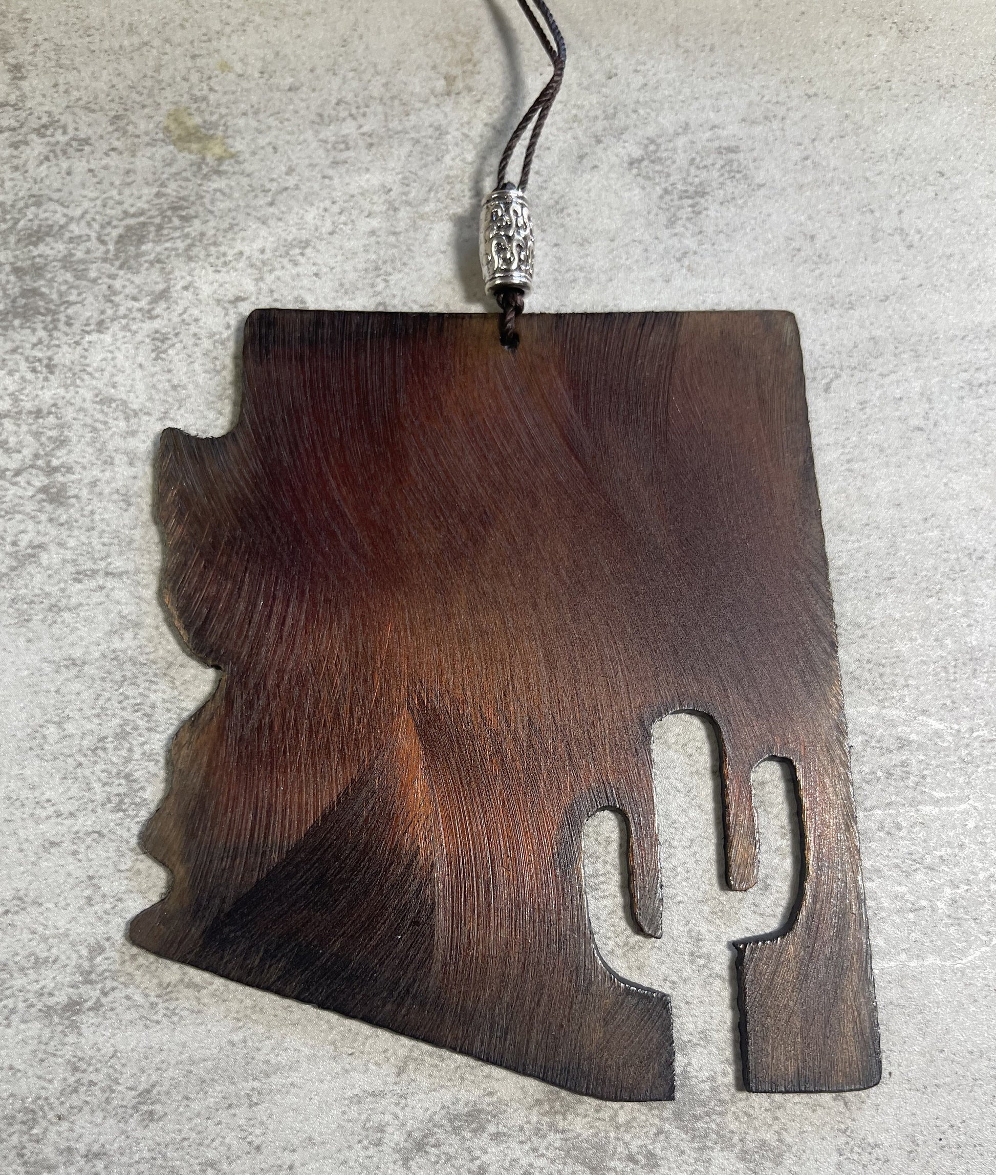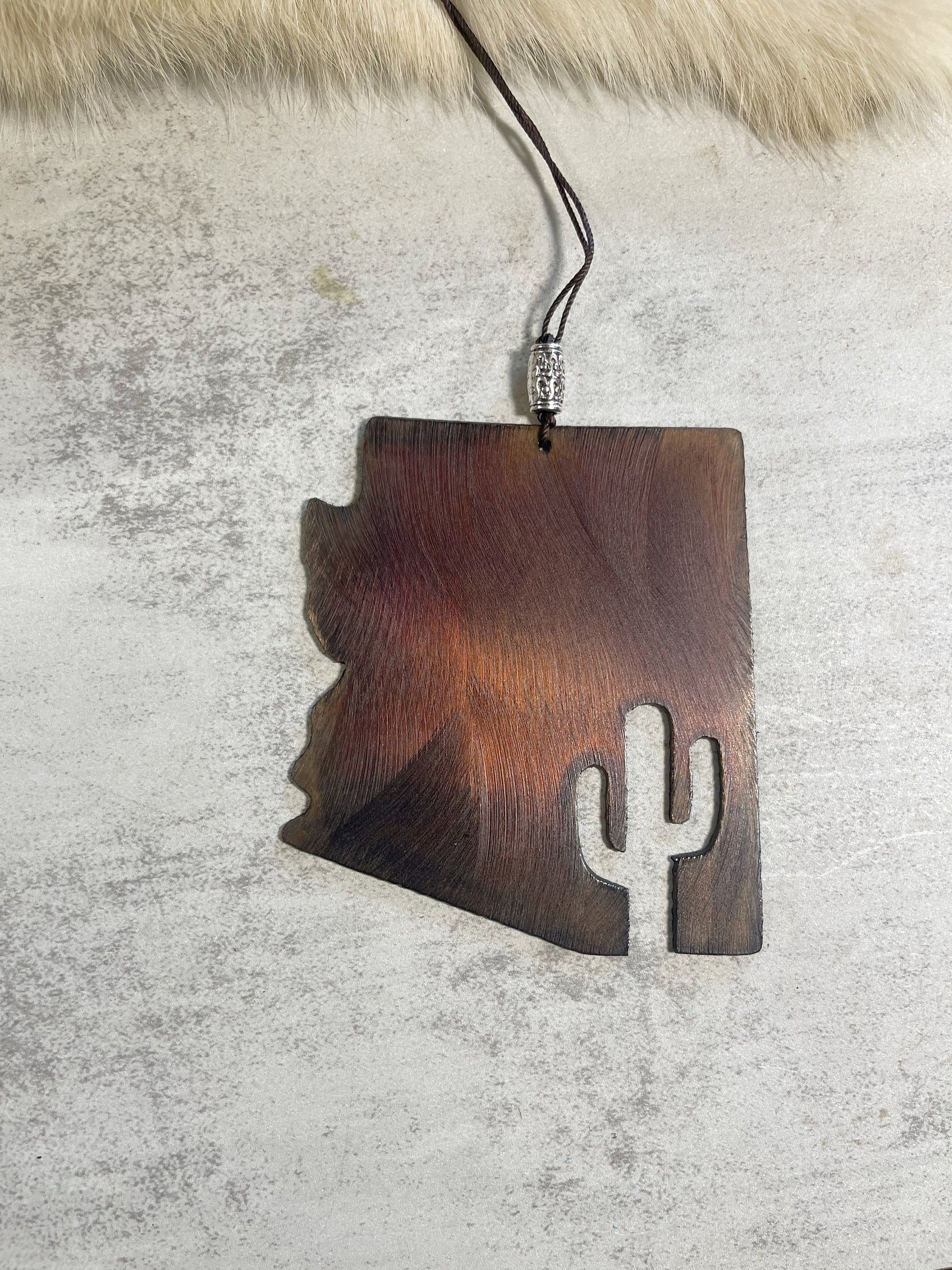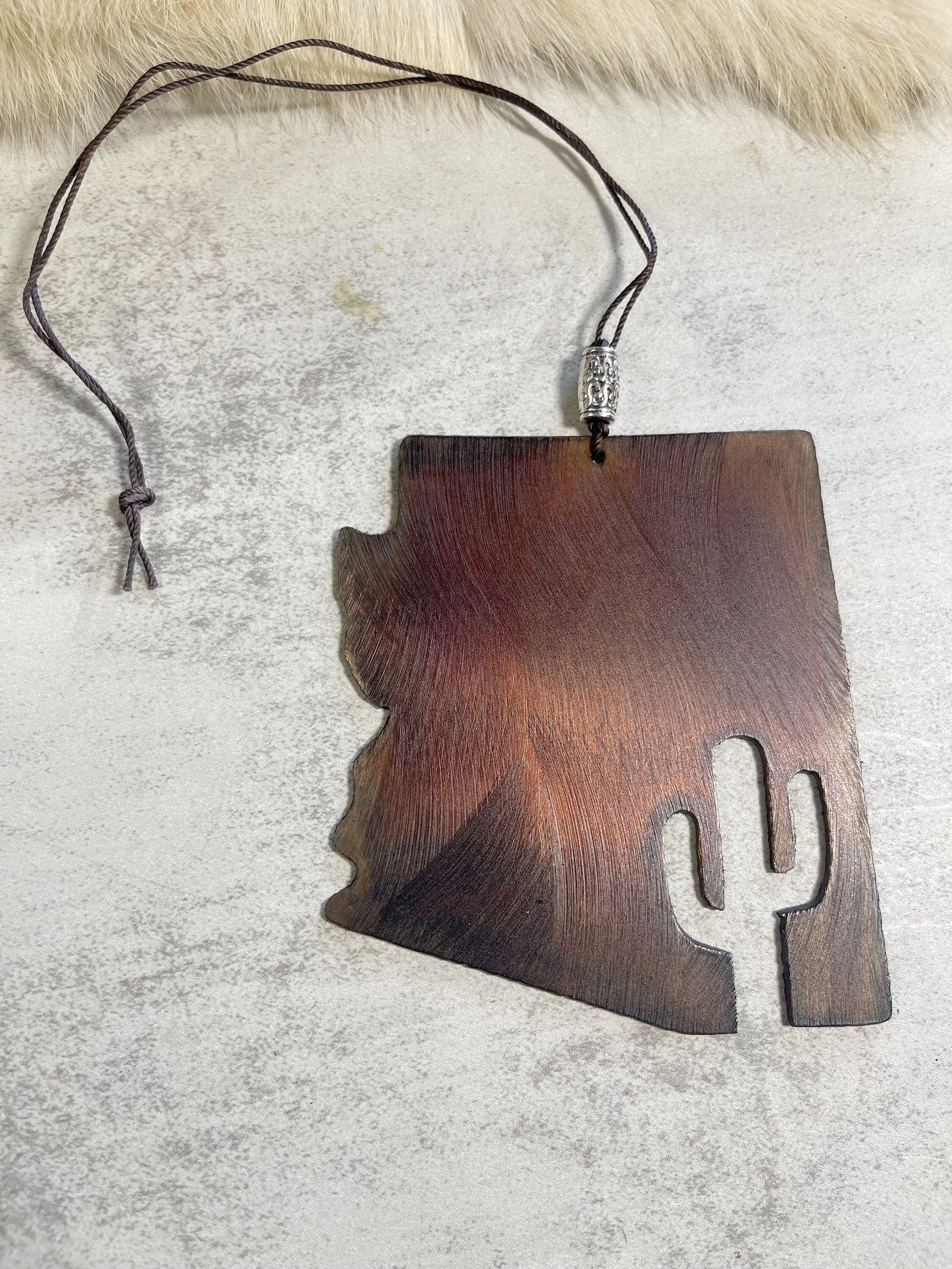 Introducing our exquisite Copper and Bronzed Plated Arizona State Ornament, a captivating piece that combines the allure of metal craftsmanship with a cutout Saguaro Cactus.