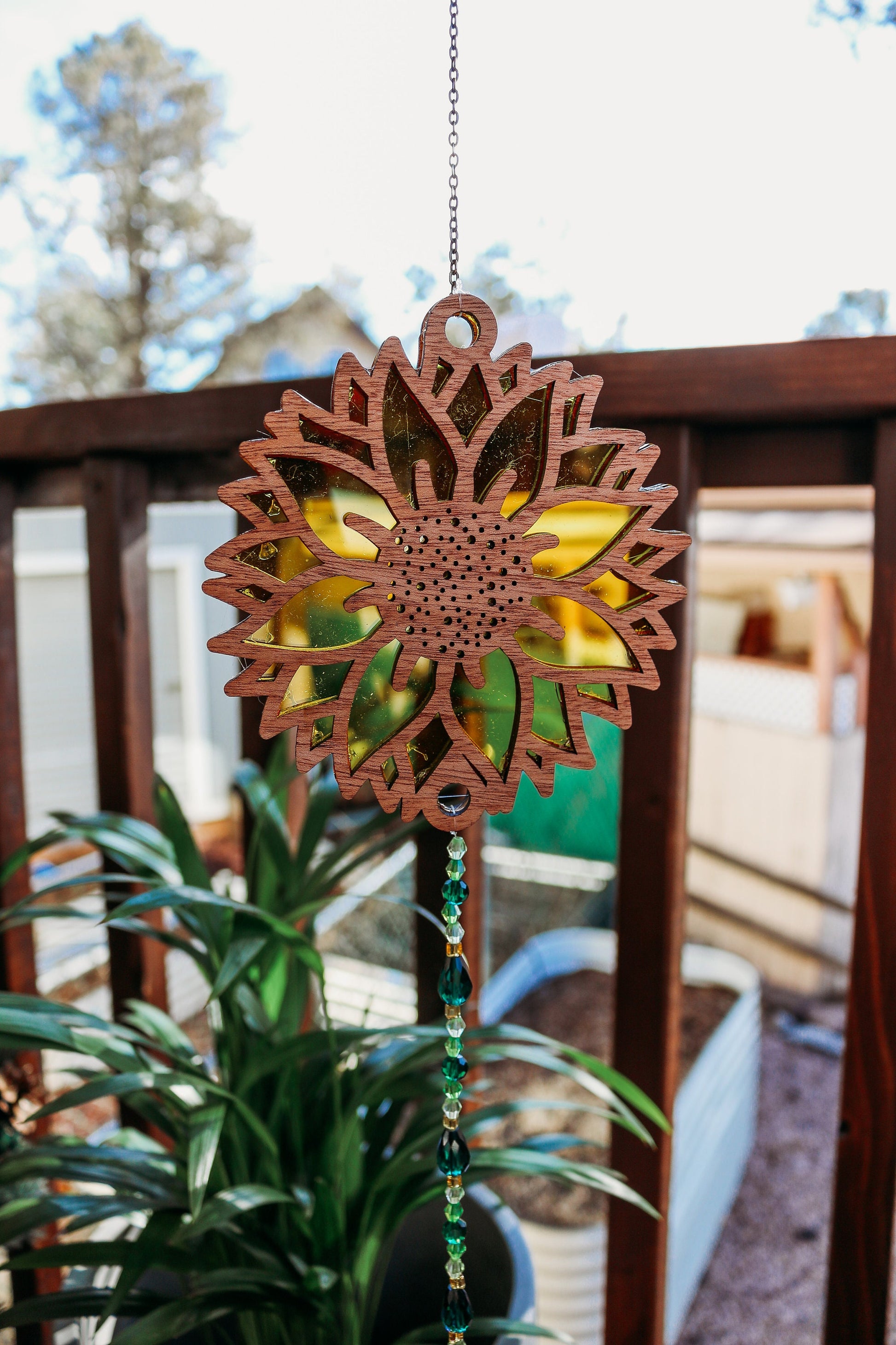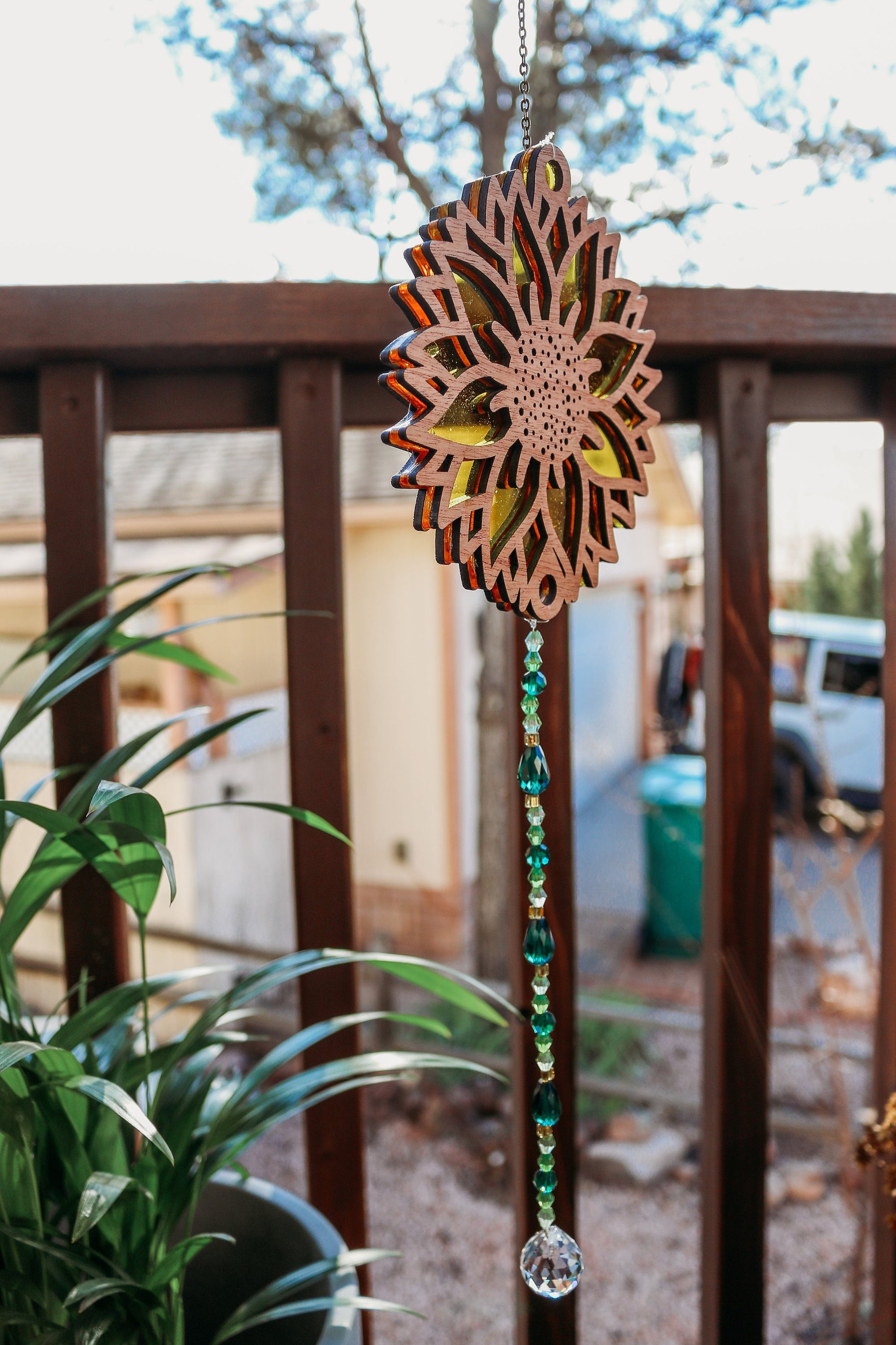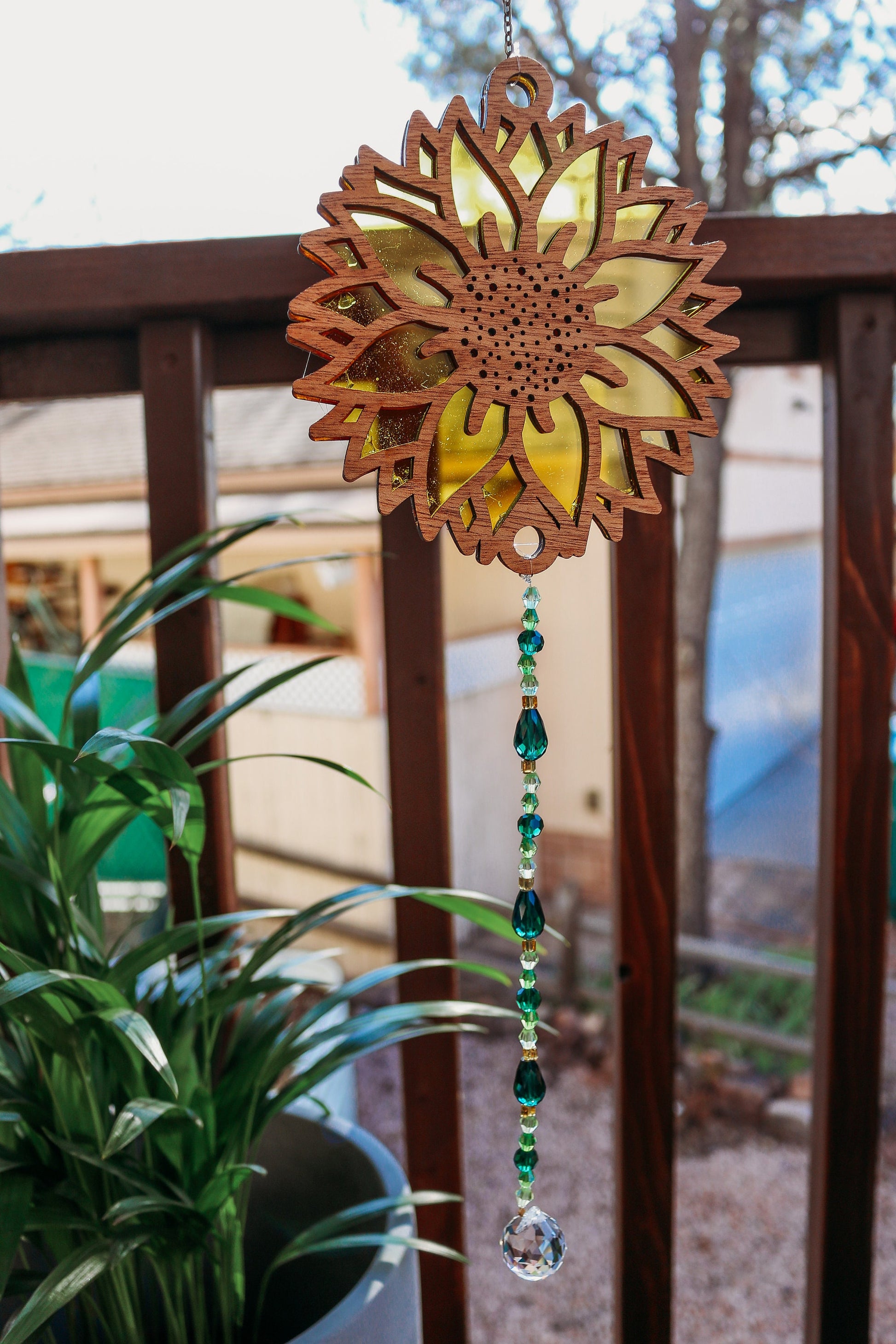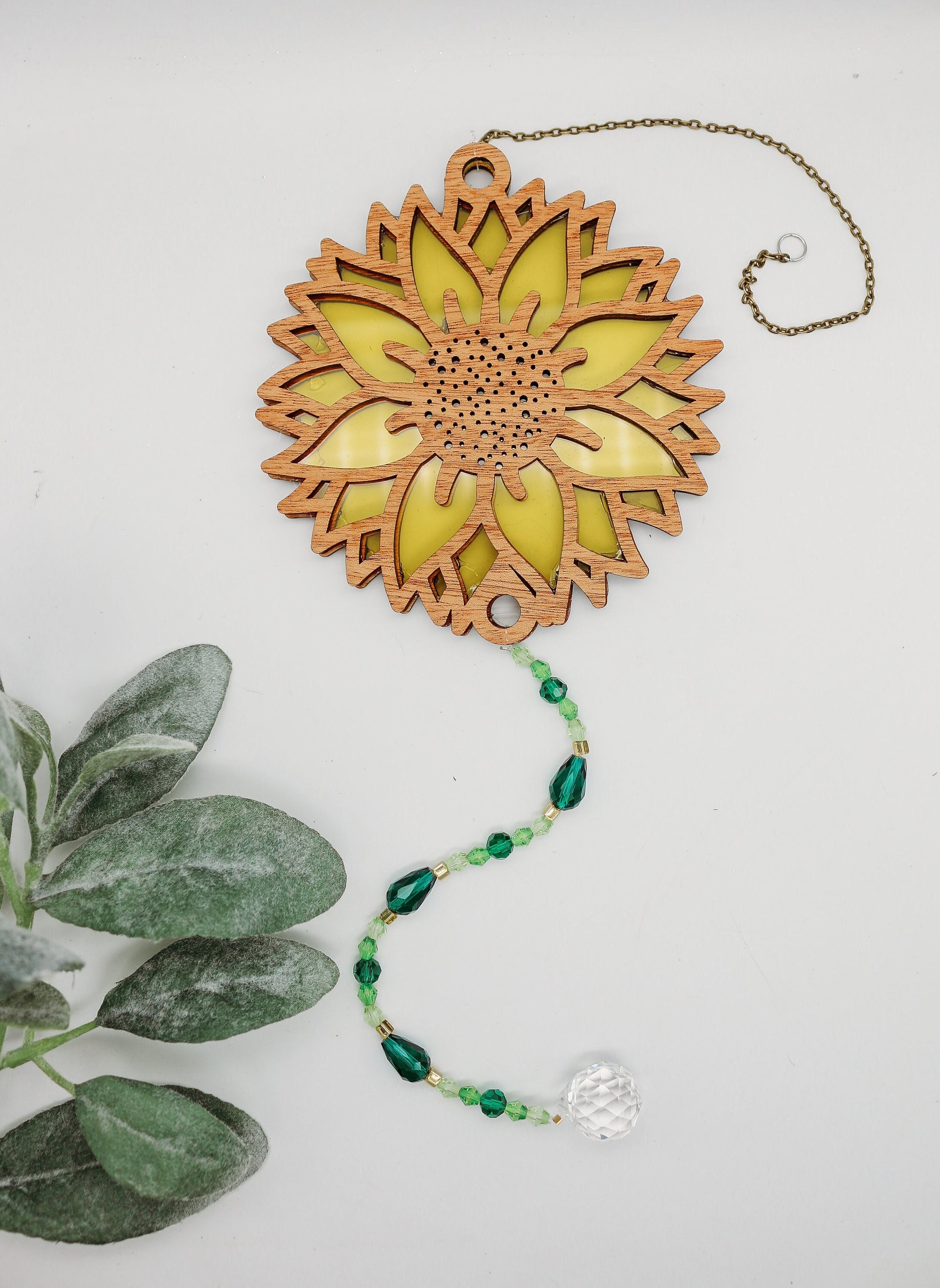 Top portion measures 4" in width and 4" in height, this sunflower suncatcher is the perfect size to adorn any window, porch, or room that yearns for a touch of natural beauty. The combination of natural wood, vibrant acrylic layers, and sparkling glass and crystal beads make this suncatcher a truly unique and enchanting piece of art.