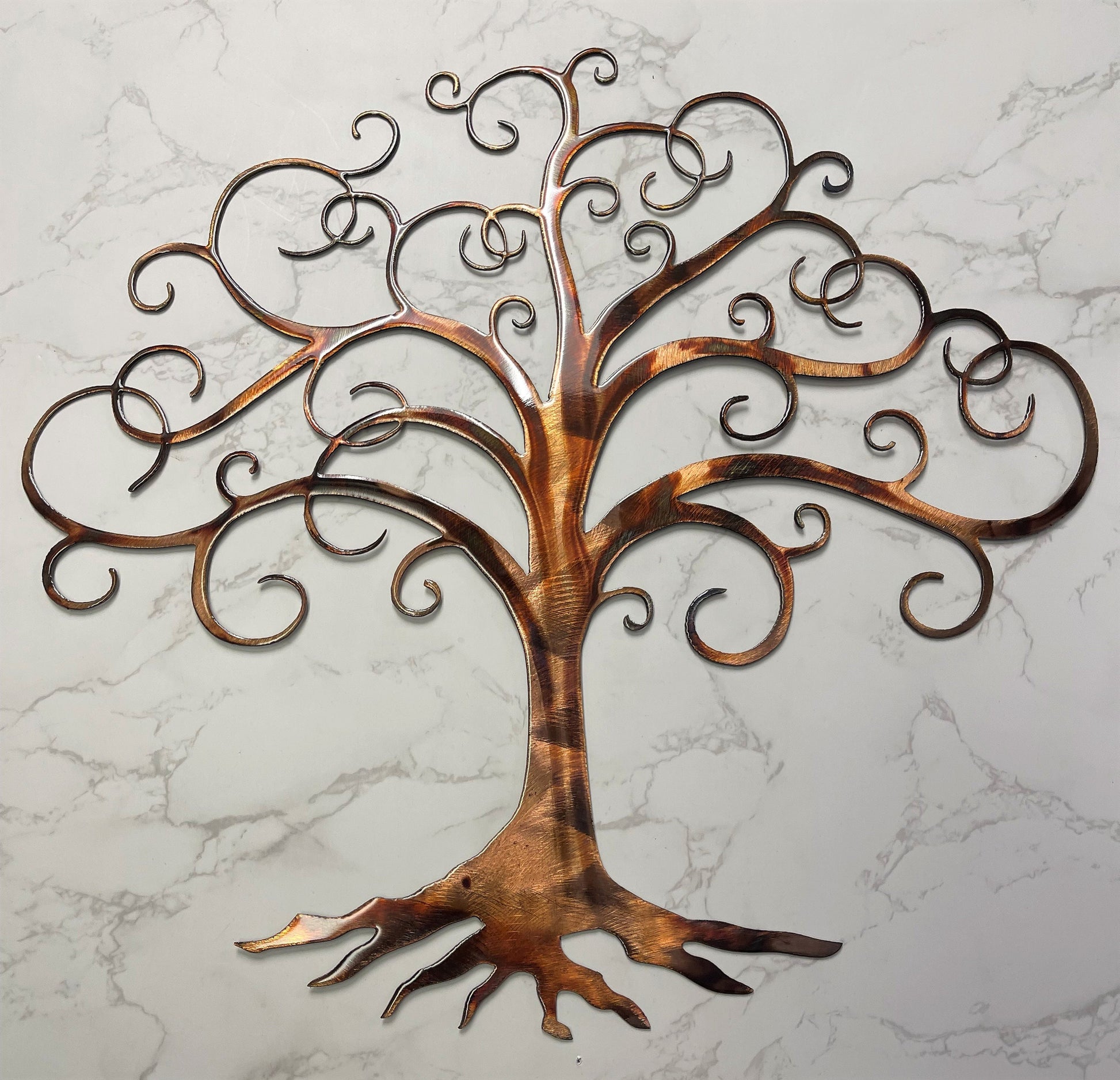 A Tree of life is a perfect welcome addition to any home. This handcrafted piece is a delicate way to represent your love in any bedroom, living room, home office, and more. This piece is 100% handcrafted in the USA. Finish: Copper/Bronzed Plated with a clear coat. Approx measurements: Measures approx 18 1/4" wide x 17" tall or larger Note: Bracket welded to back for ease of hanging.