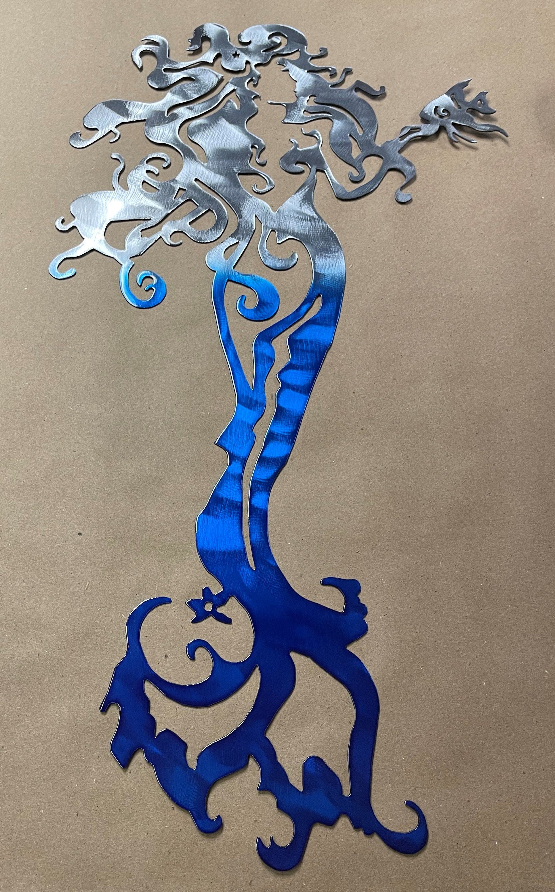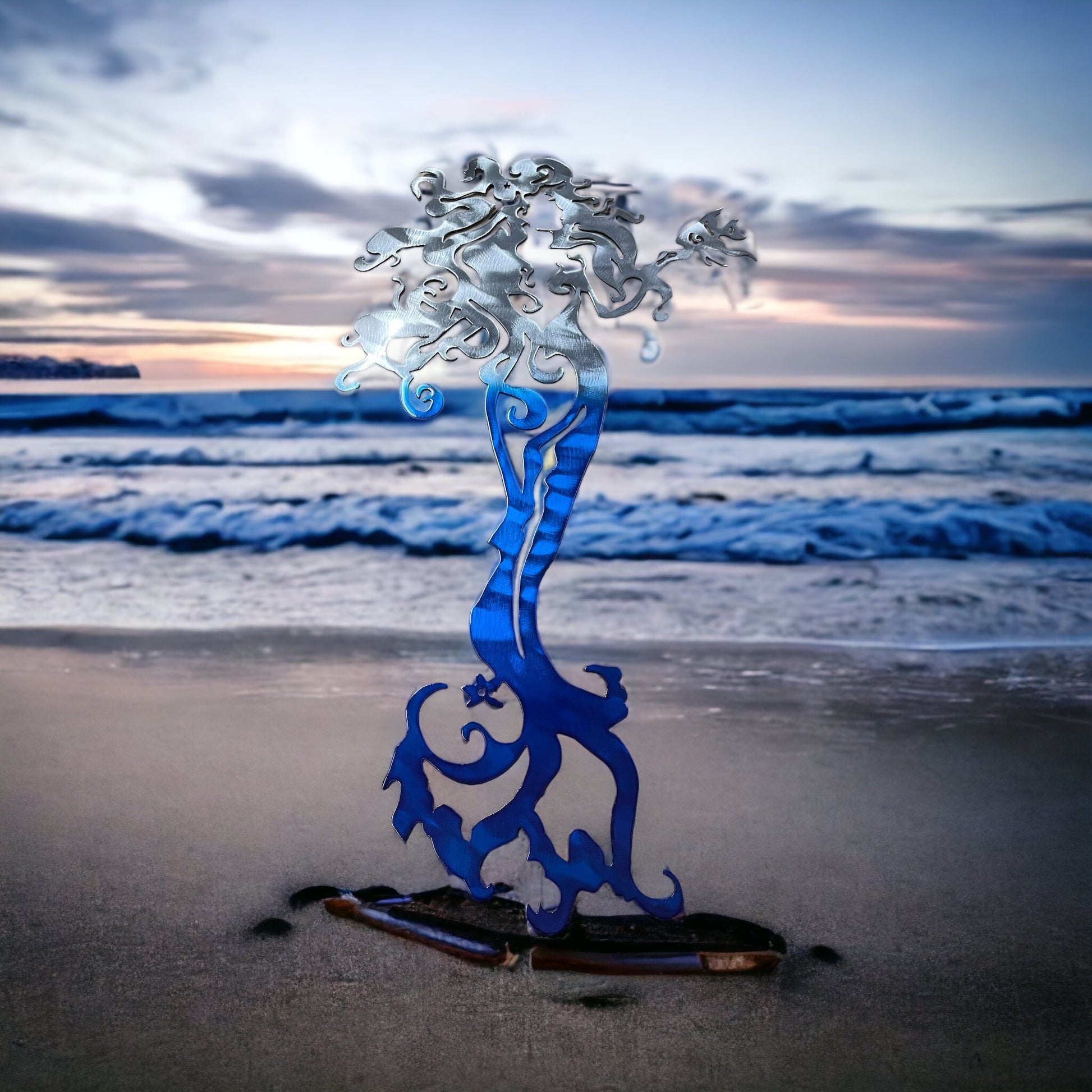 This metal art mermaid is a stunning piece of craftsmanship that would make a beautiful addition to any collection. The mermaid's body is made entirely of metal and has been expertly crafted to create a lifelike appearance. Her upper body features long, flowing hair and intricate detailing that adds a sense of realism to the piece.