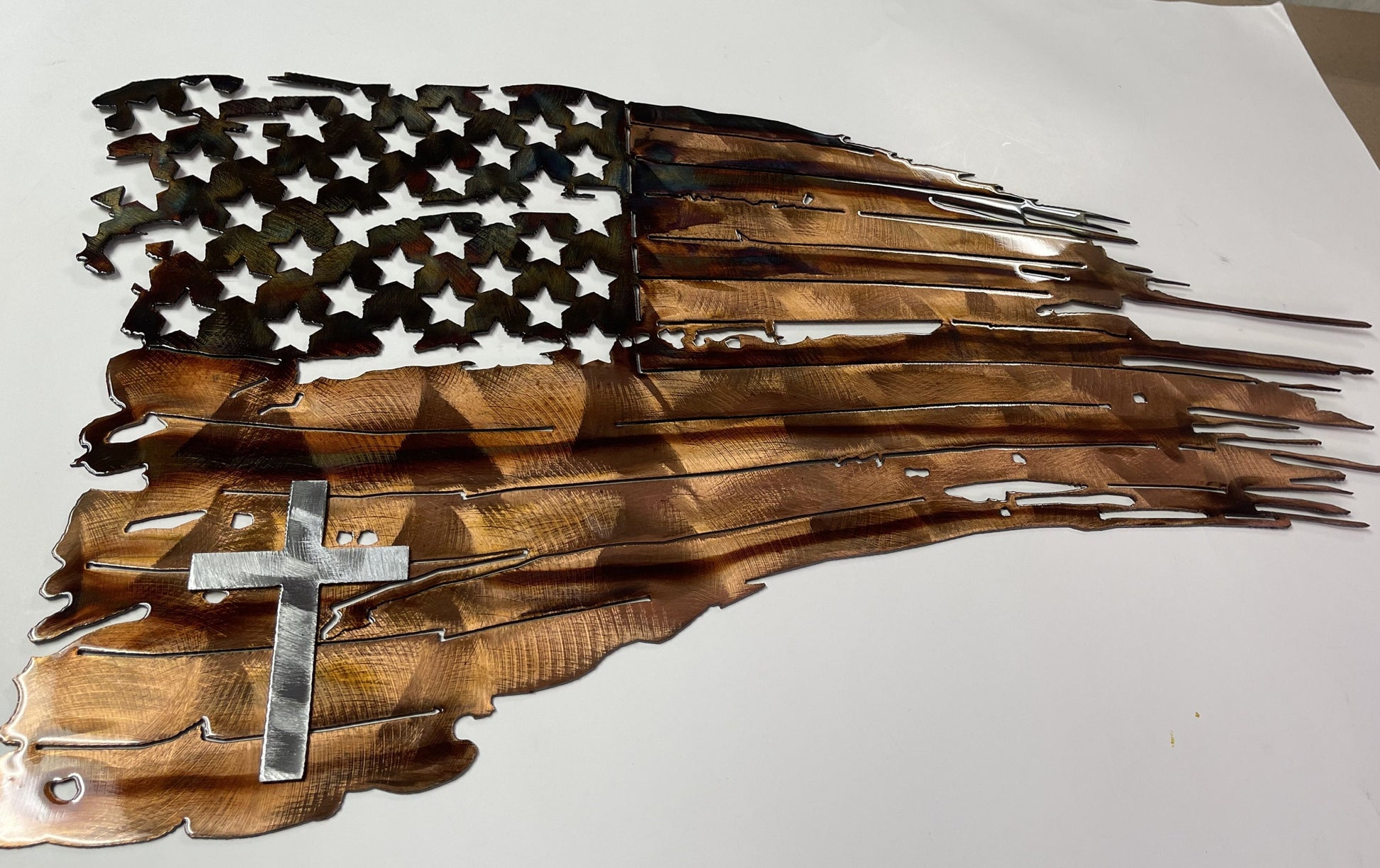 Tattered & Torn American Flag Metal Wall Art Copper/Bronze Pltd with Cross 31 1/2" wide