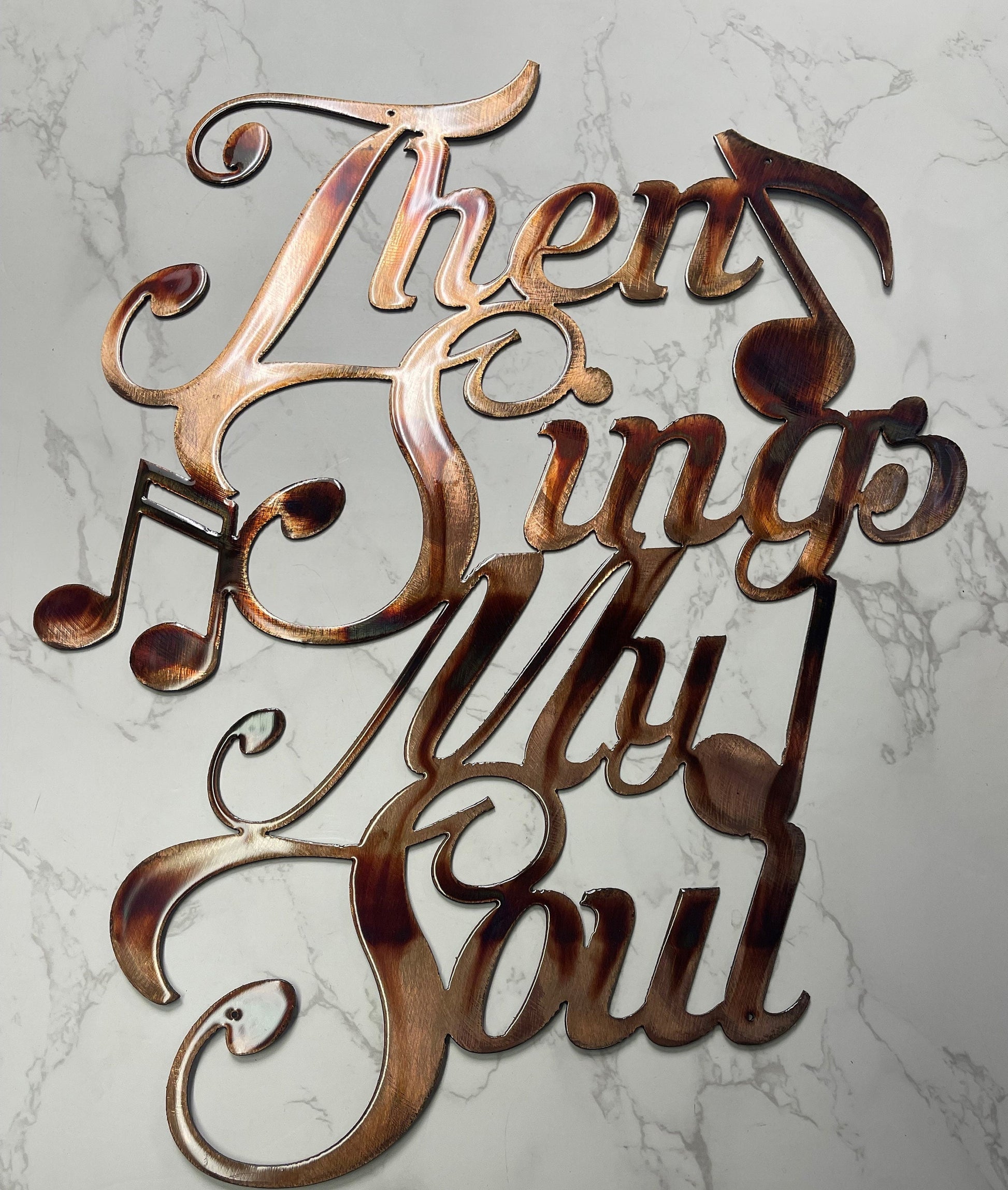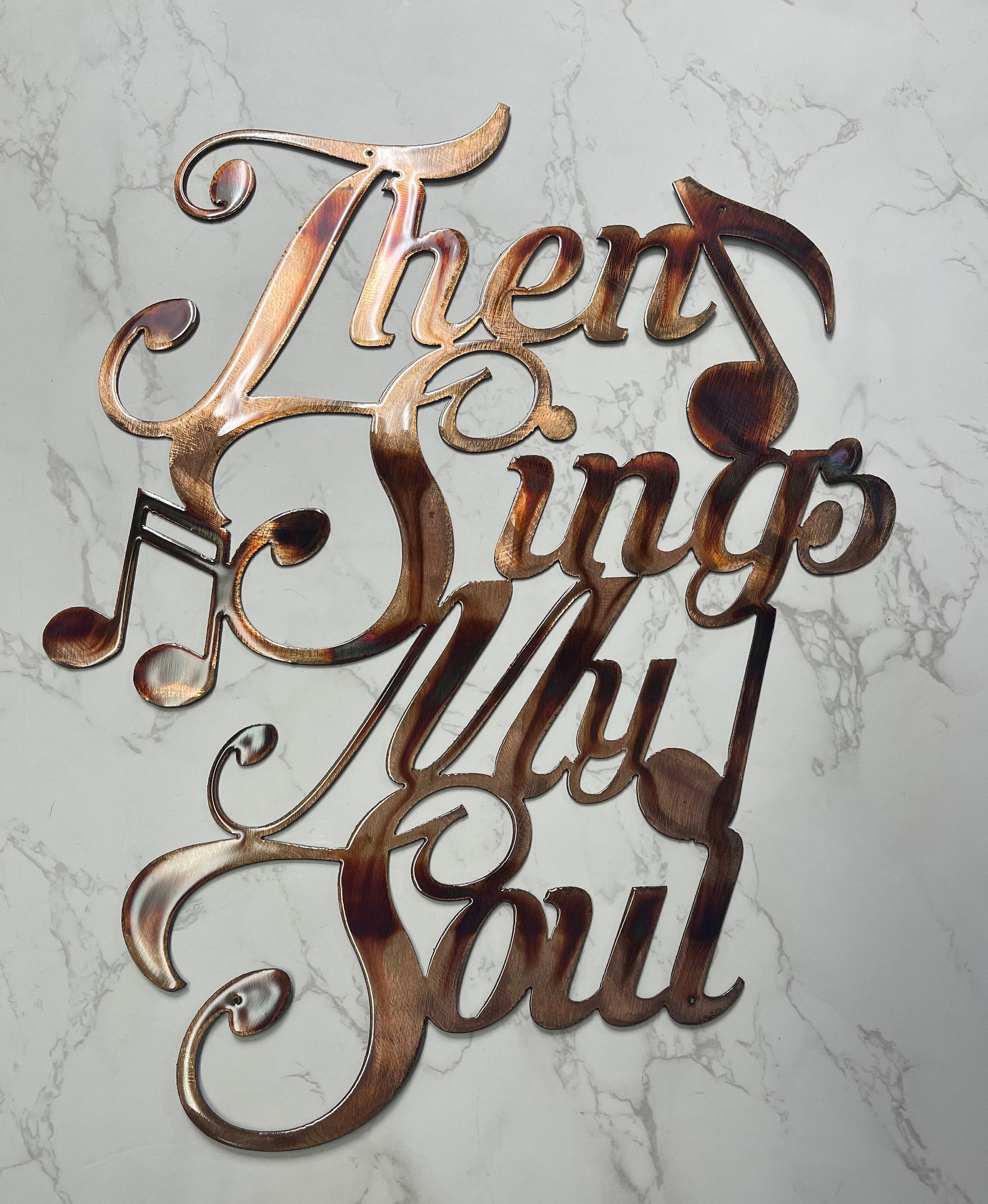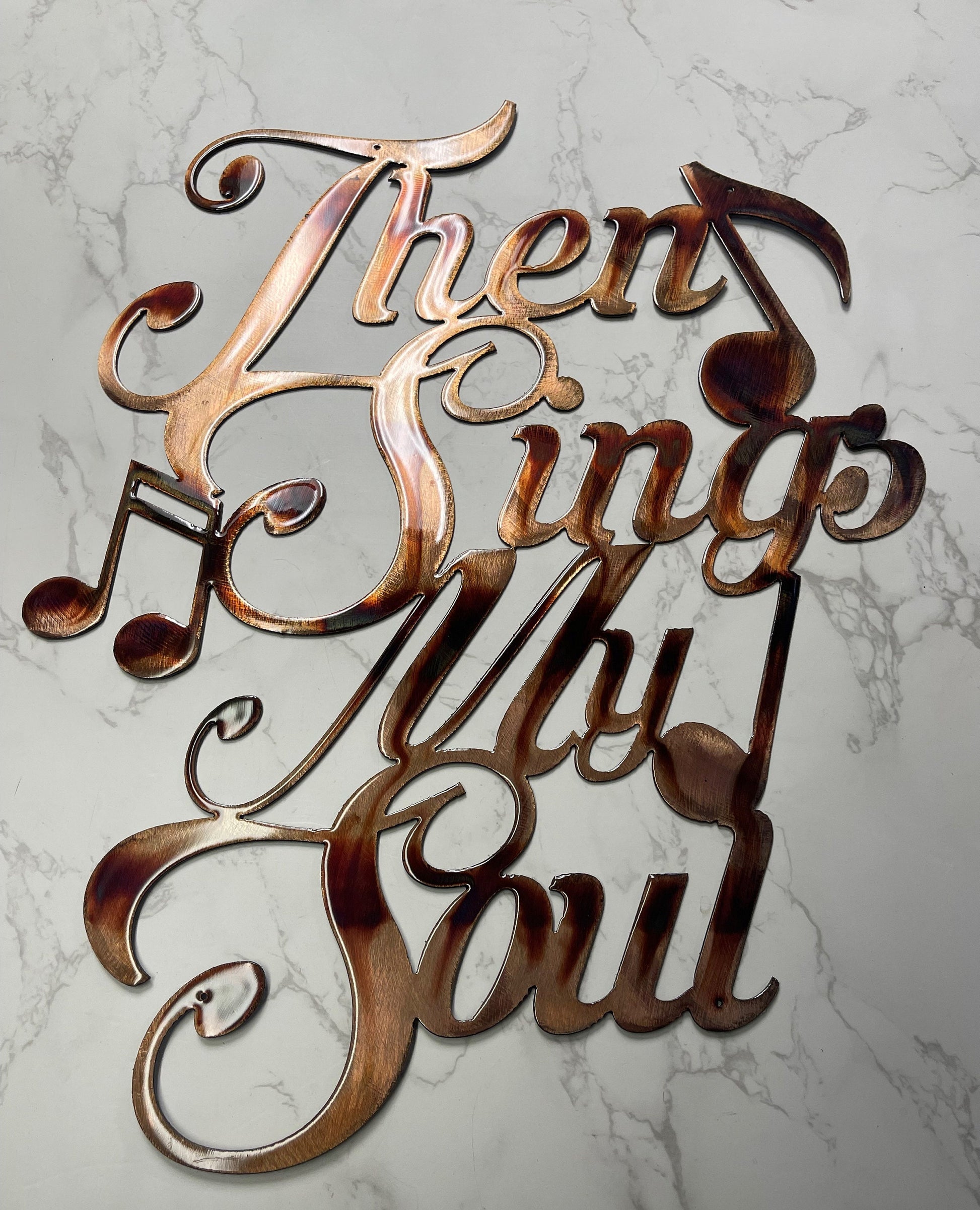 An ode to the timeless hymn, our remarkable metal wall art piece beautifully captures the essence of 'How Great Thou Art.' Delicately handcrafted from copper and bronze-plated steel, this stunning creation showcases the iconic phrase 'Then Sings My Soul' in captivating lettering that exudes warmth and reverence. Allow the power of music and faith to resonate within your space, as this intricate art piece becomes a visual testament to the beauty of devotion. With its elegant design and meticulous craftsmanship, this metal wall art is not only a striking centerpiece but also a source of inspiration and tranquility.